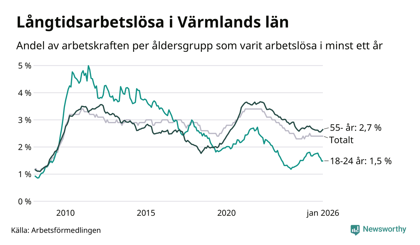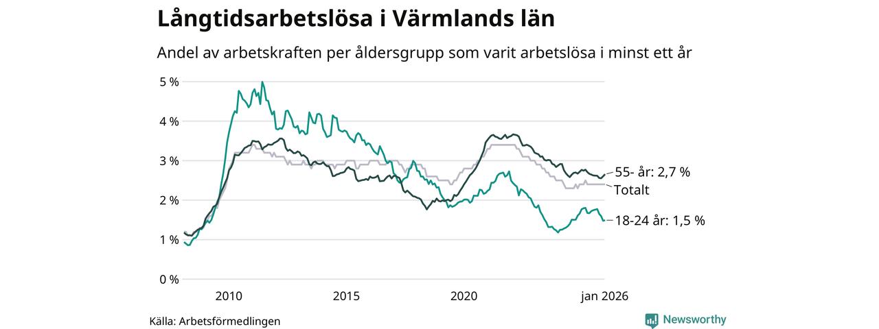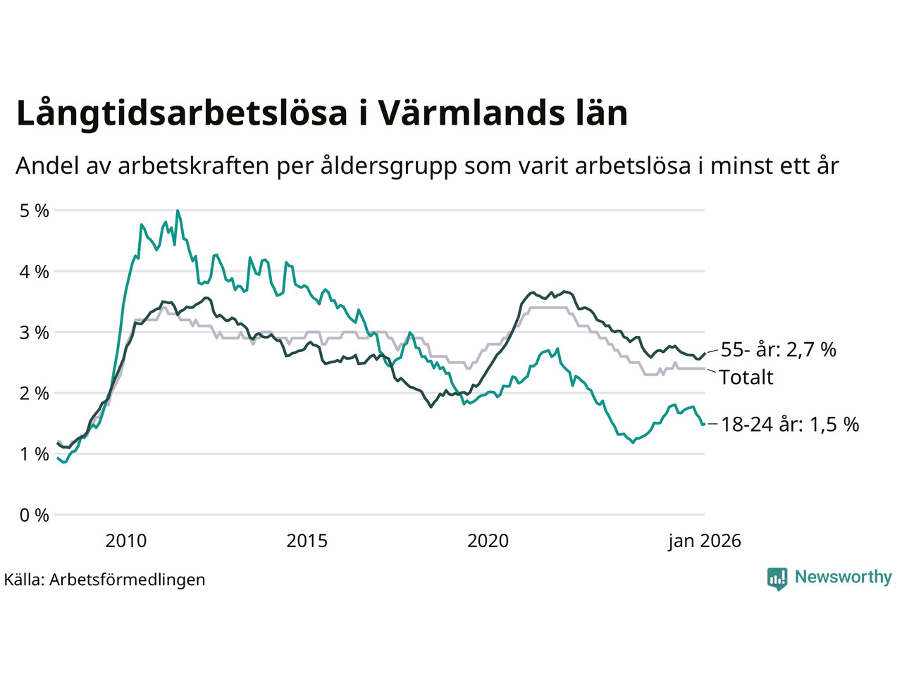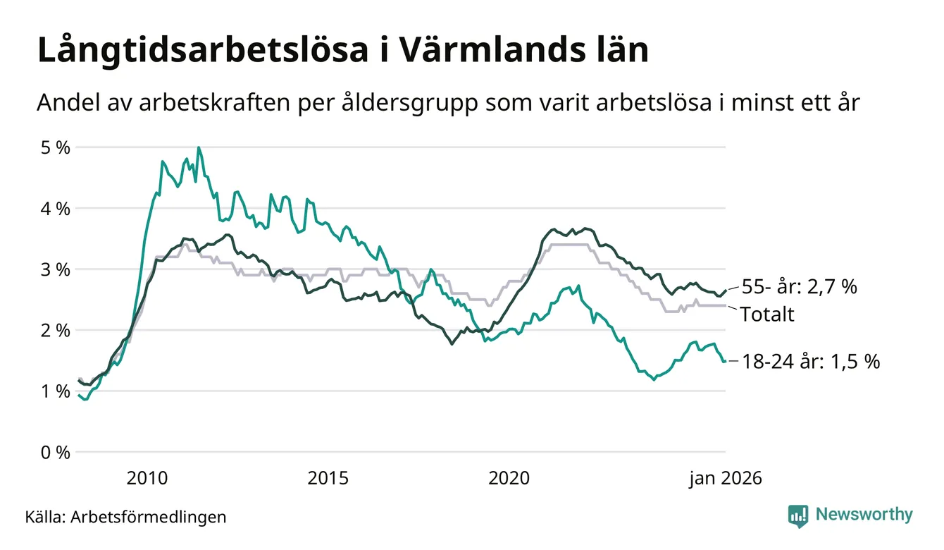 Av de 3 230 personerna som varit arbetslösa i mer än ett år i Värmlands län är 849 personer mellan 55 och 661 år och mellan 209 och 209 är mellan 18 och 24 år. För den äldre gruppen är andelen arbetslösa 2,7 procent medan den i den yngre gruppen är 1,5 procent. Även i riket som helhet är långtidsarbetslösheten högre i gruppen äldre.