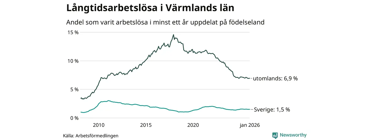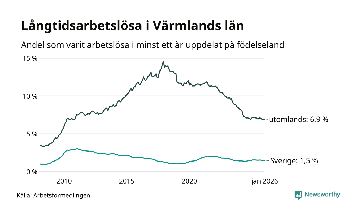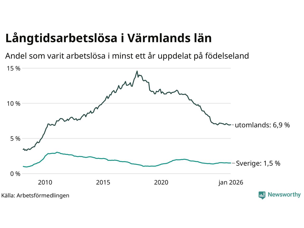 1 709 av de långtidsarbetslösa i Värmland är födda i Sverige och mellan 1 522 och 1 525 är födda utomlands. Det innebär att långtidsarbetslösheten bland Sverigefödda är 1,5 procent, medan den ligger på 6,9 procent för utlandsfödda.