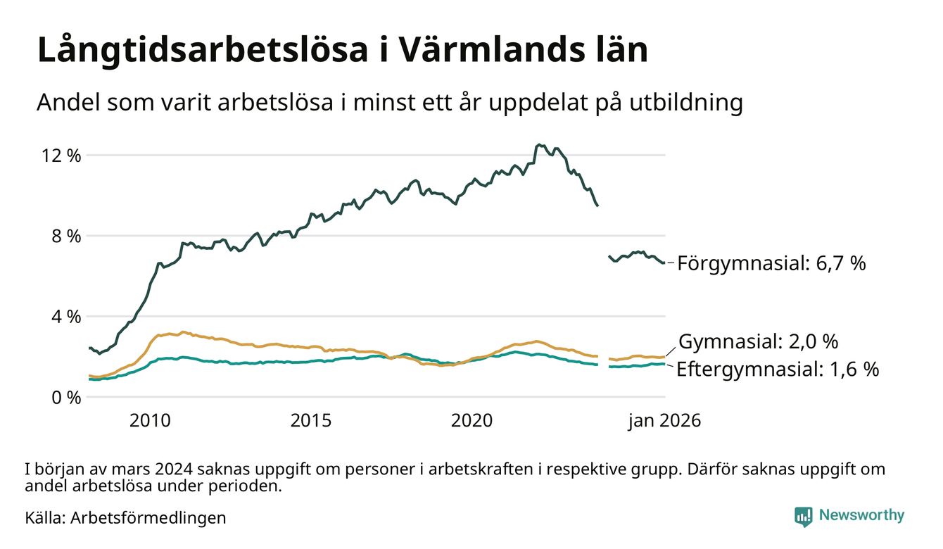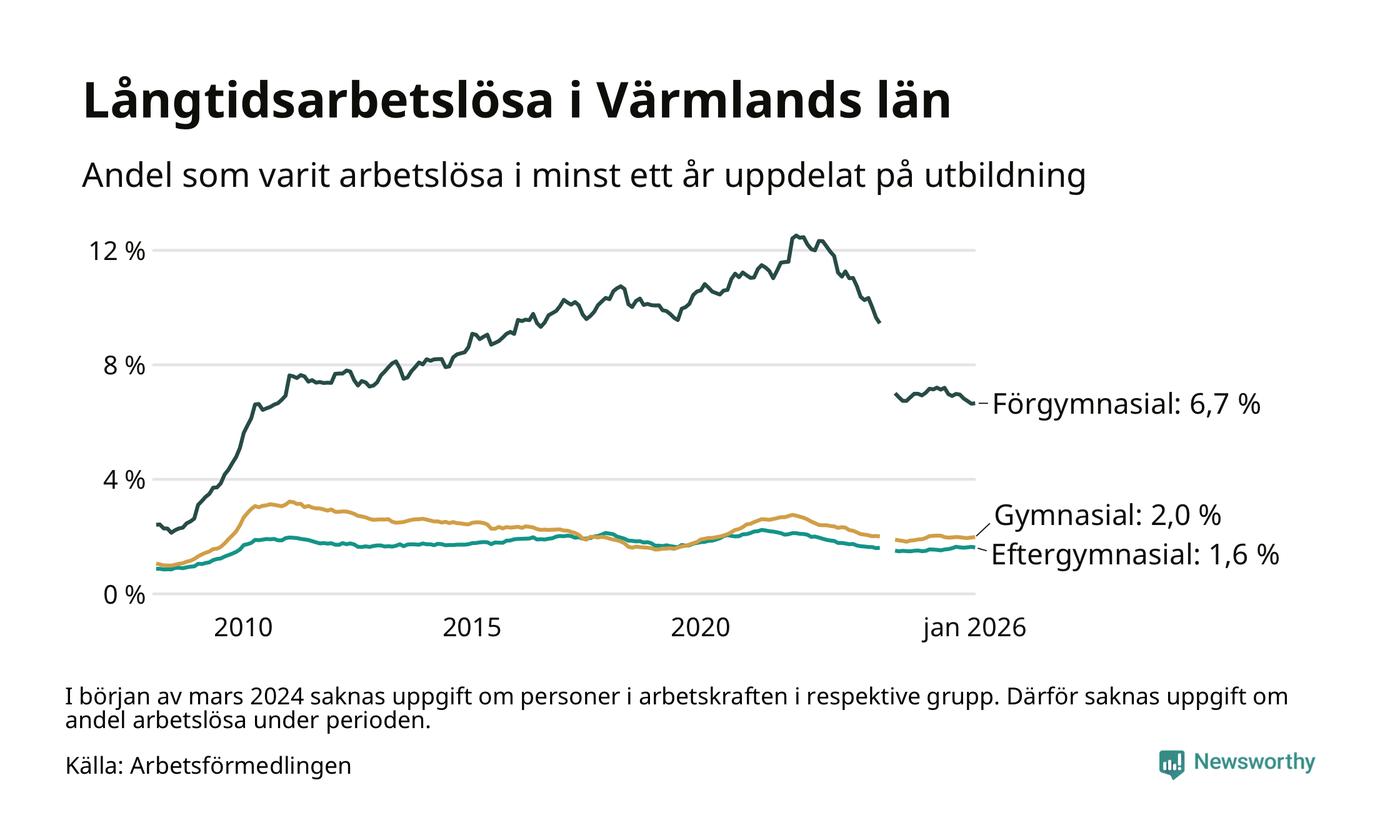 I januari hade 3 230 Värmlandsbor varit arbetslösa i minst ett år, vilket är 28 fler än månaden innan. 3 230 personer motsvarar 2,4 procent av arbetskraften i länet – andelen långtidsarbetslösa är ungefär på samma nivå som för ett år sedan.