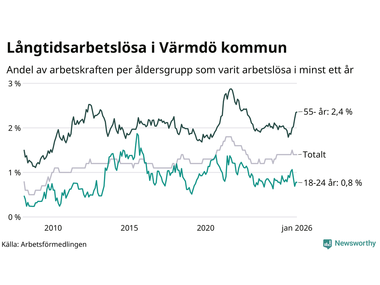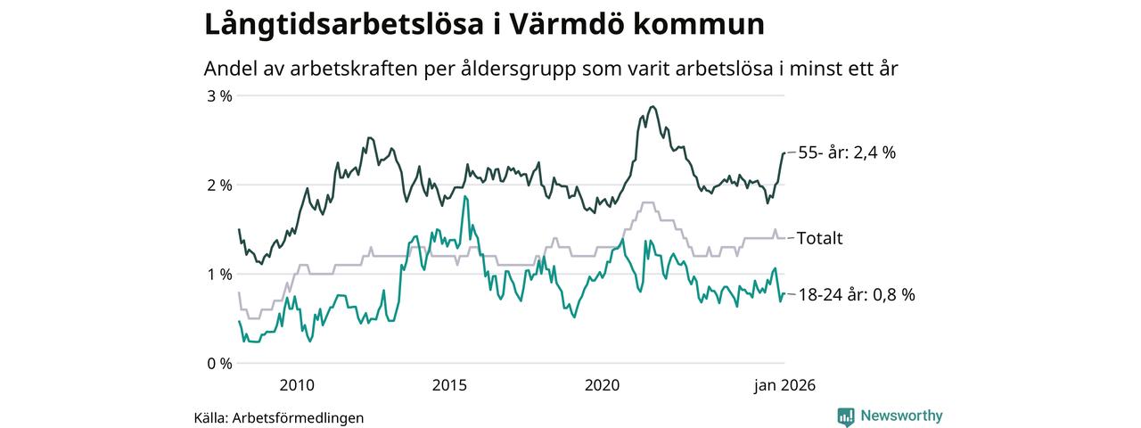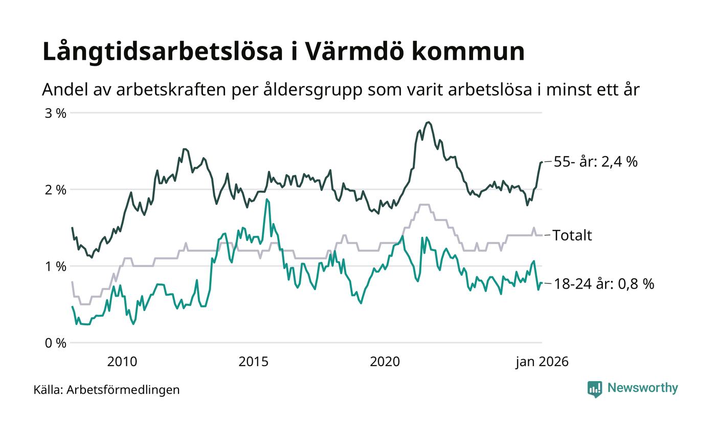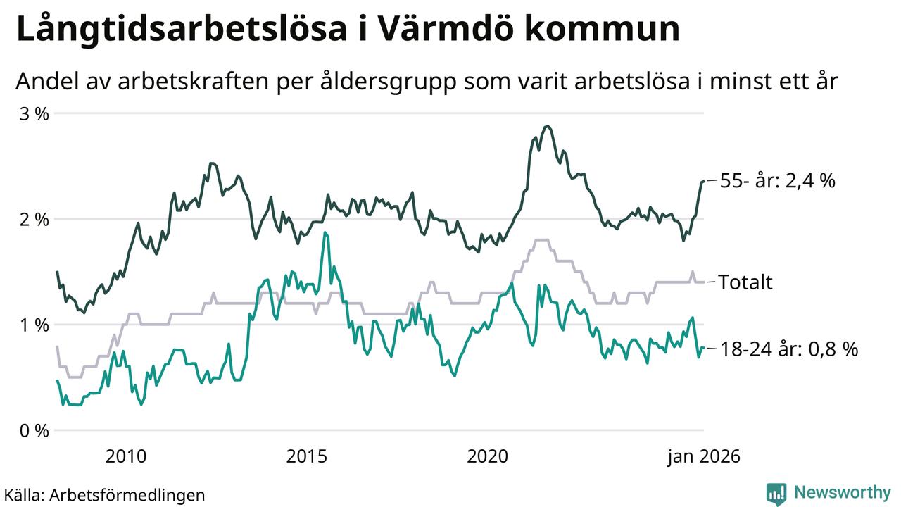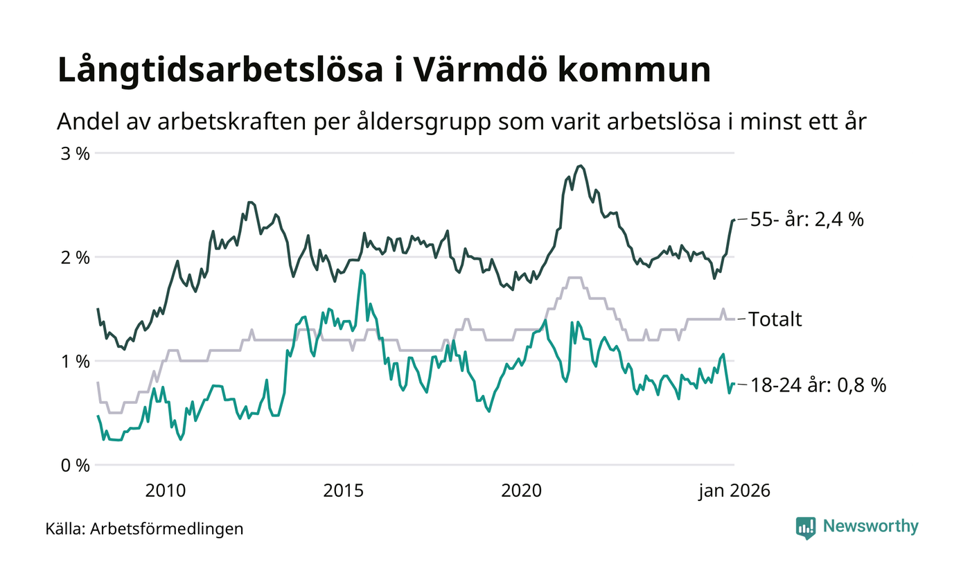 Av de 322 personerna som varit arbetslösa i mer än ett år i Värmdö kommun är 133 personer mellan 55 och 661 år och 17 är mellan 18 och 24 år. För den äldre gruppen är andelen arbetslösa 2,4 procent medan den i den yngre gruppen är 0,8 procent. Även i riket som helhet är långtidsarbetslösheten högre i gruppen äldre.