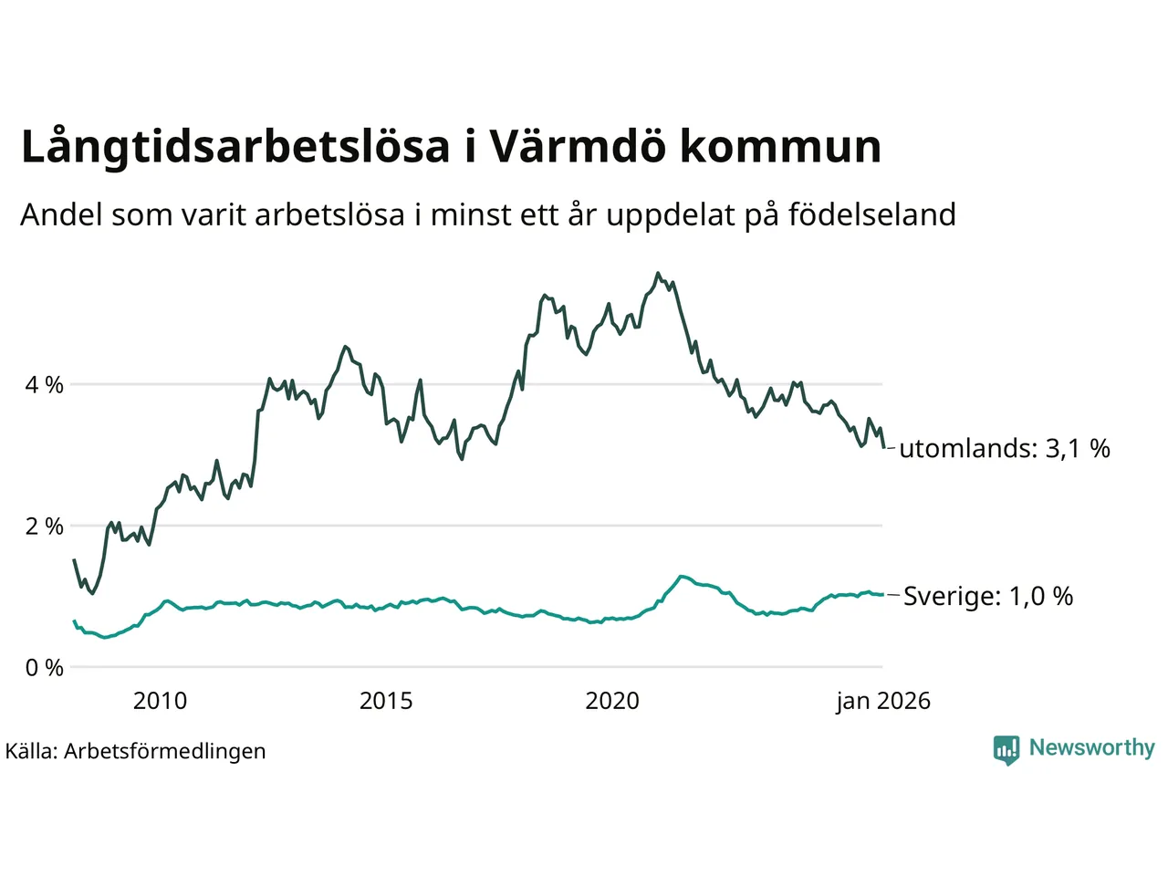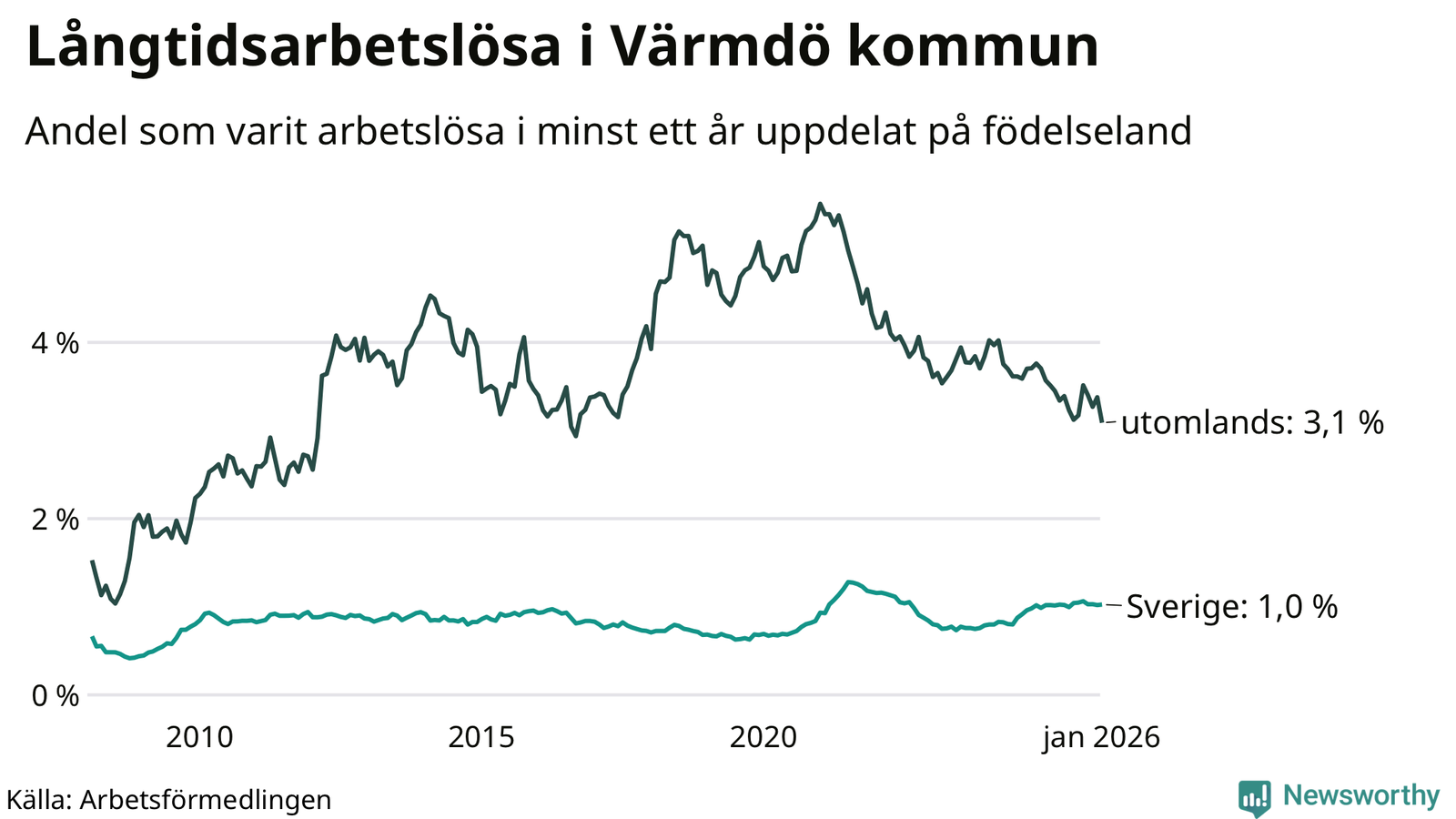 Graf: Andel arbetslösa uppdelat på födelseland i Värmdö