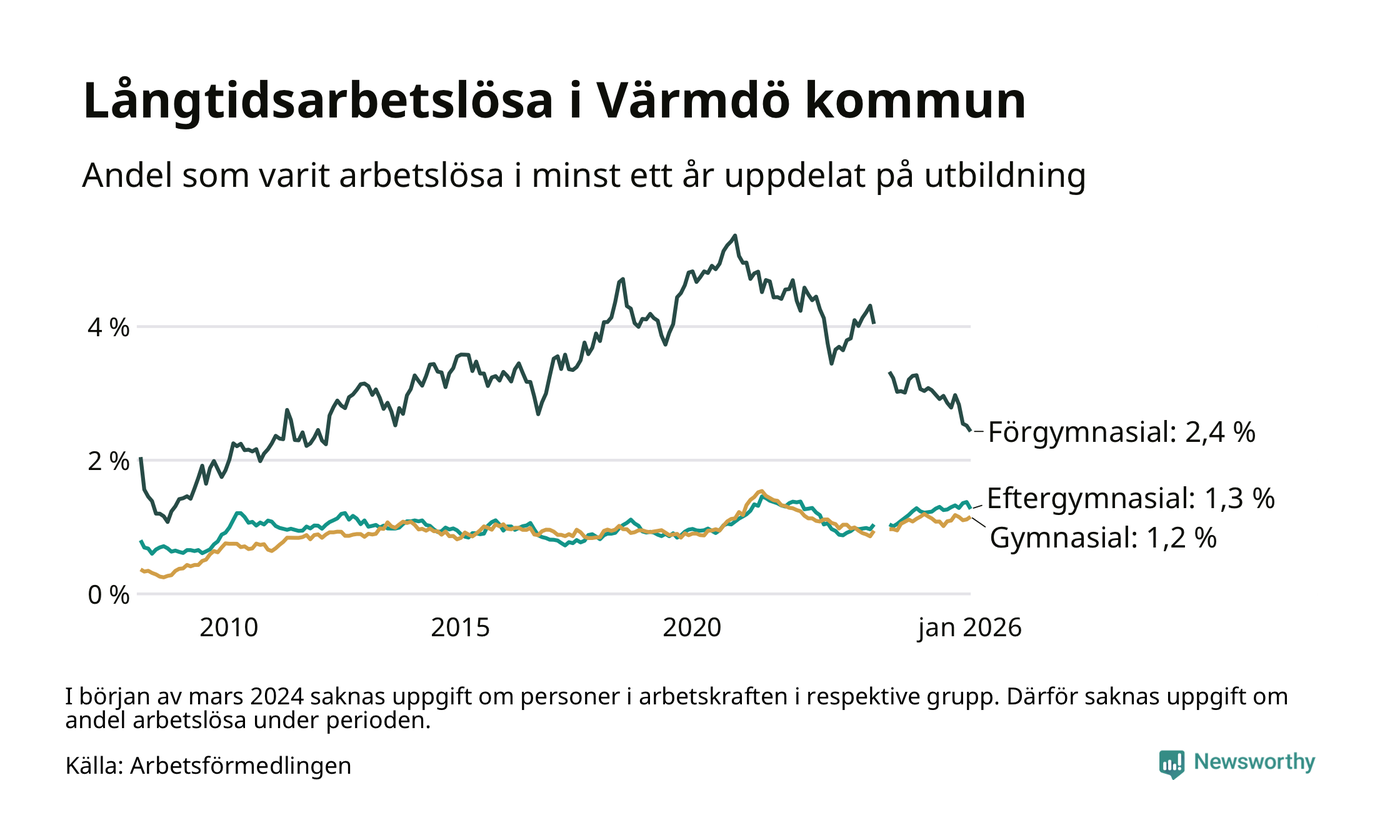 Graf: Andel arbetslösa i Värmdö som varit utan arbete i minst 12 månader