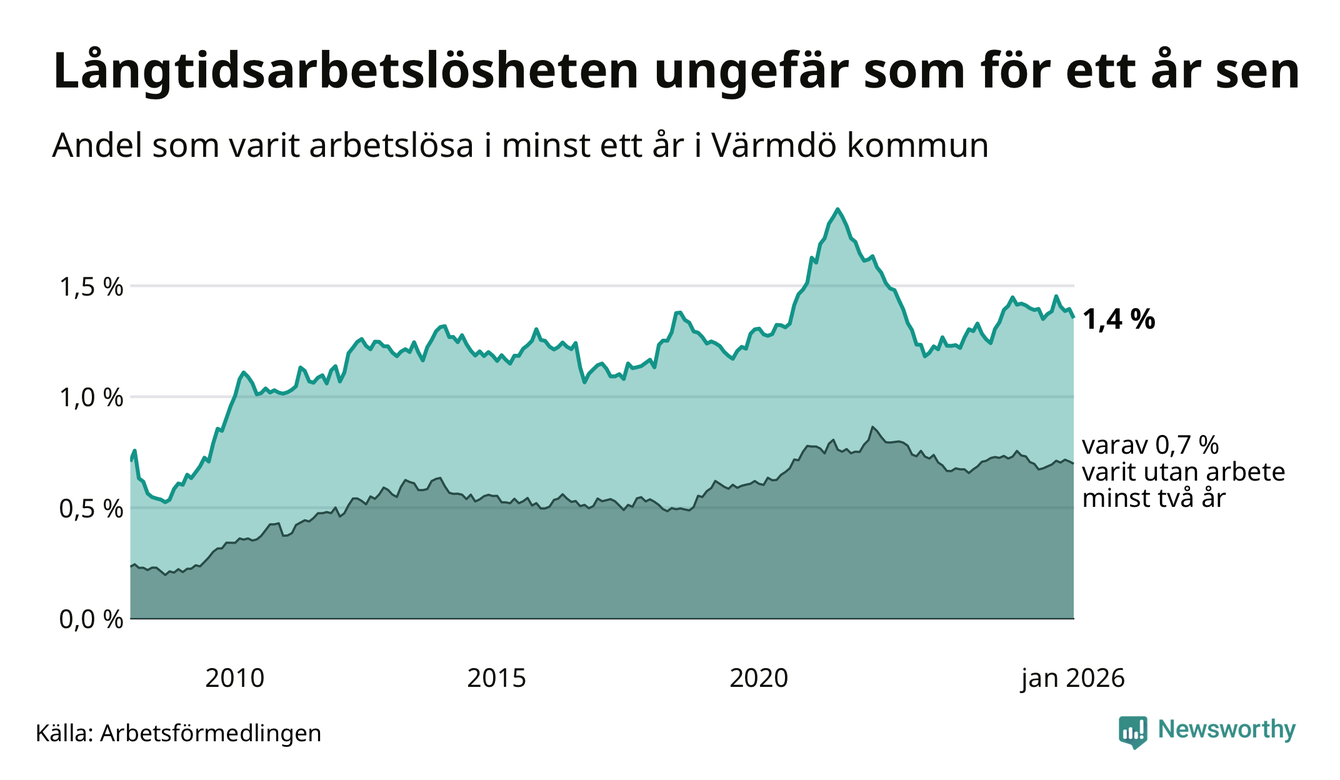 I januari hade 322 Värmdöbor varit arbetslösa i minst ett år, vilket är sju färre än månaden innan. 322 personer motsvarar 1,4 procent av arbetskraften i kommunen – andelen långtidsarbetslösa är ungefär på samma nivå som för ett år sedan.