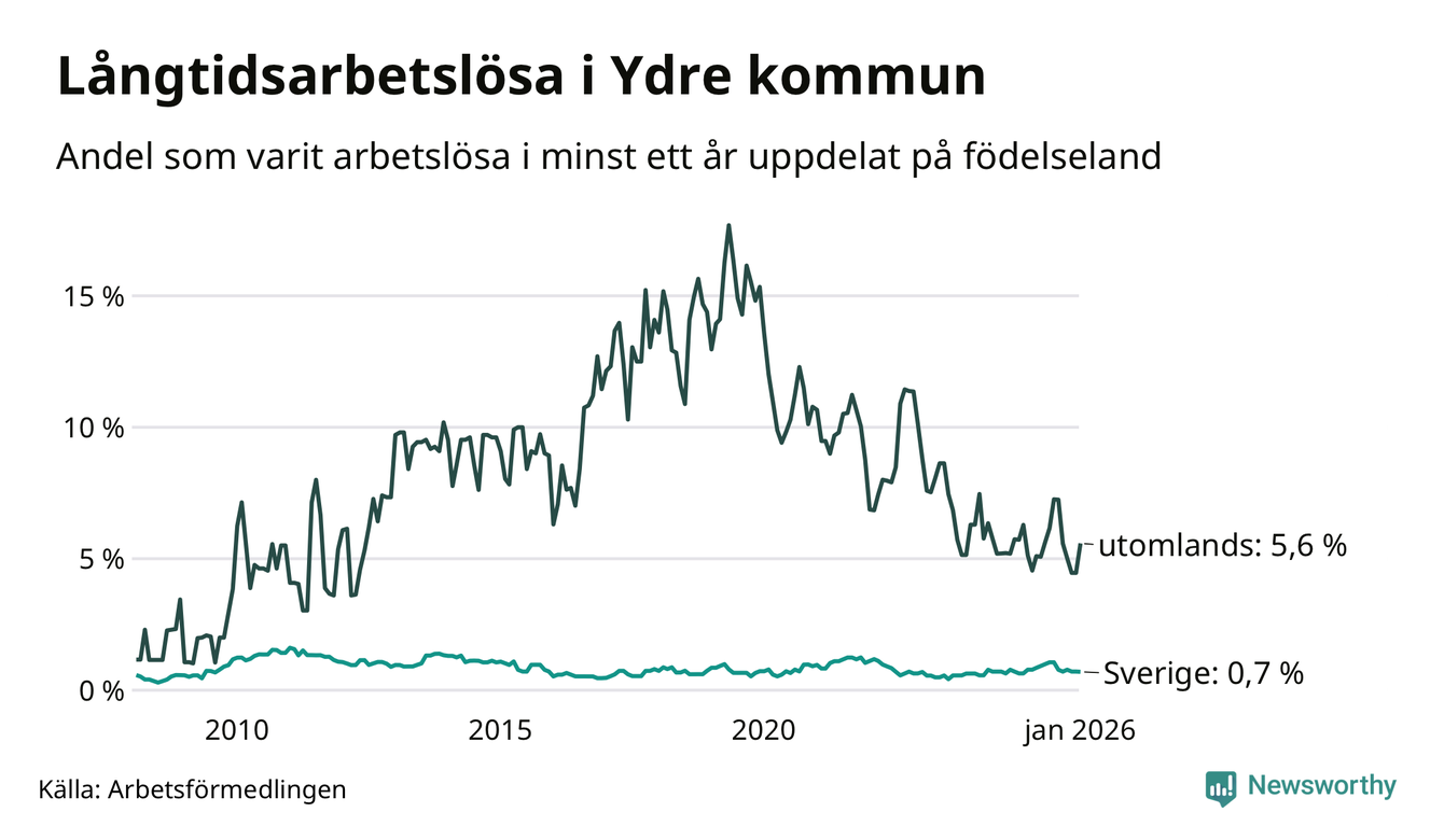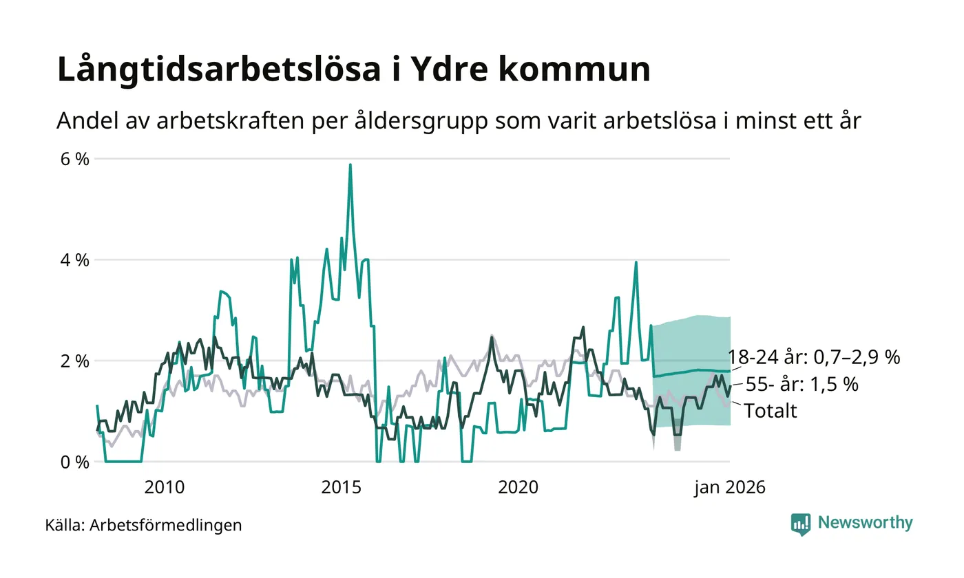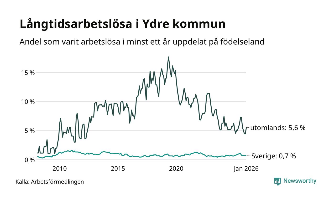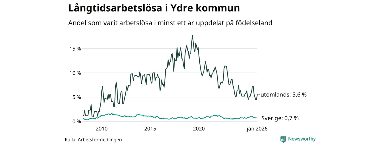 I januari hade 20 Ydrebor varit arbetslösa i minst ett år, vilket är två fler än månaden innan. Det är den första månaden sedan juli 2025 som antalet arbetslösa ökar. 20 personer motsvarar 1,2 procent av arbetskraften i kommunen – andelen långtidsarbetslösa är ungefär på samma nivå som för ett år sedan. Ydre tillhör de kommuner som har lägst andel långtidsarbetslösa i hela landet just nu.