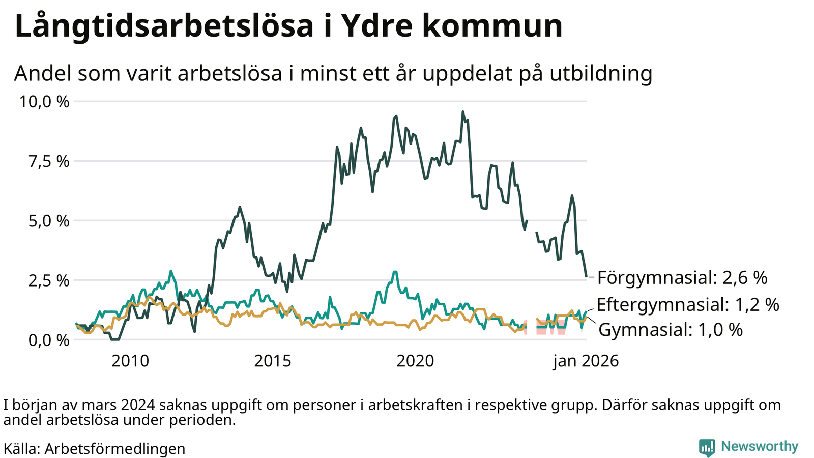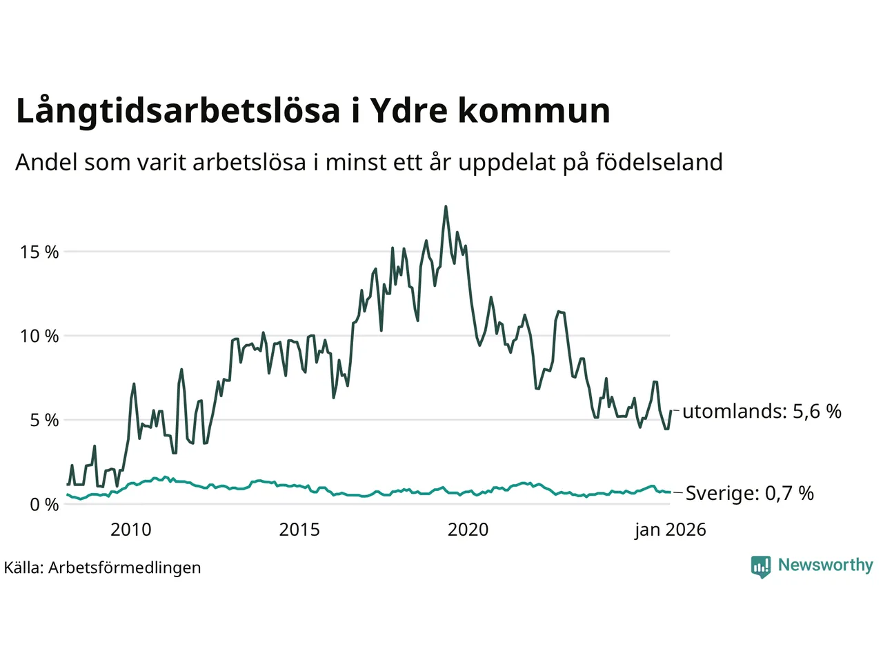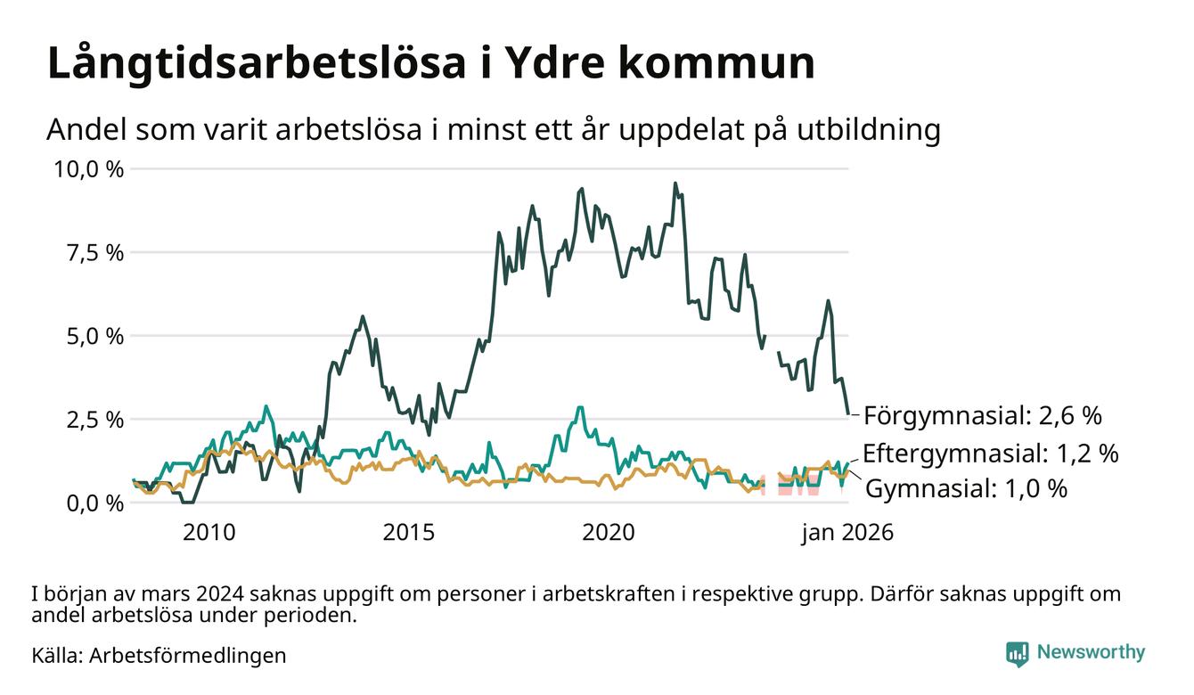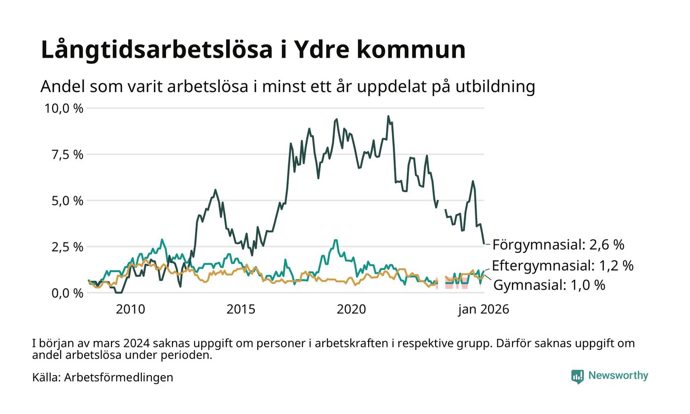 I januari hade 20 Ydrebor varit arbetslösa i minst ett år, vilket är två fler än månaden innan. Det är den första månaden sedan juli 2025 som antalet arbetslösa ökar. 20 personer motsvarar 1,2 procent av arbetskraften i kommunen – andelen långtidsarbetslösa är ungefär på samma nivå som för ett år sedan. Ydre tillhör de kommuner som har lägst andel långtidsarbetslösa i hela landet just nu.