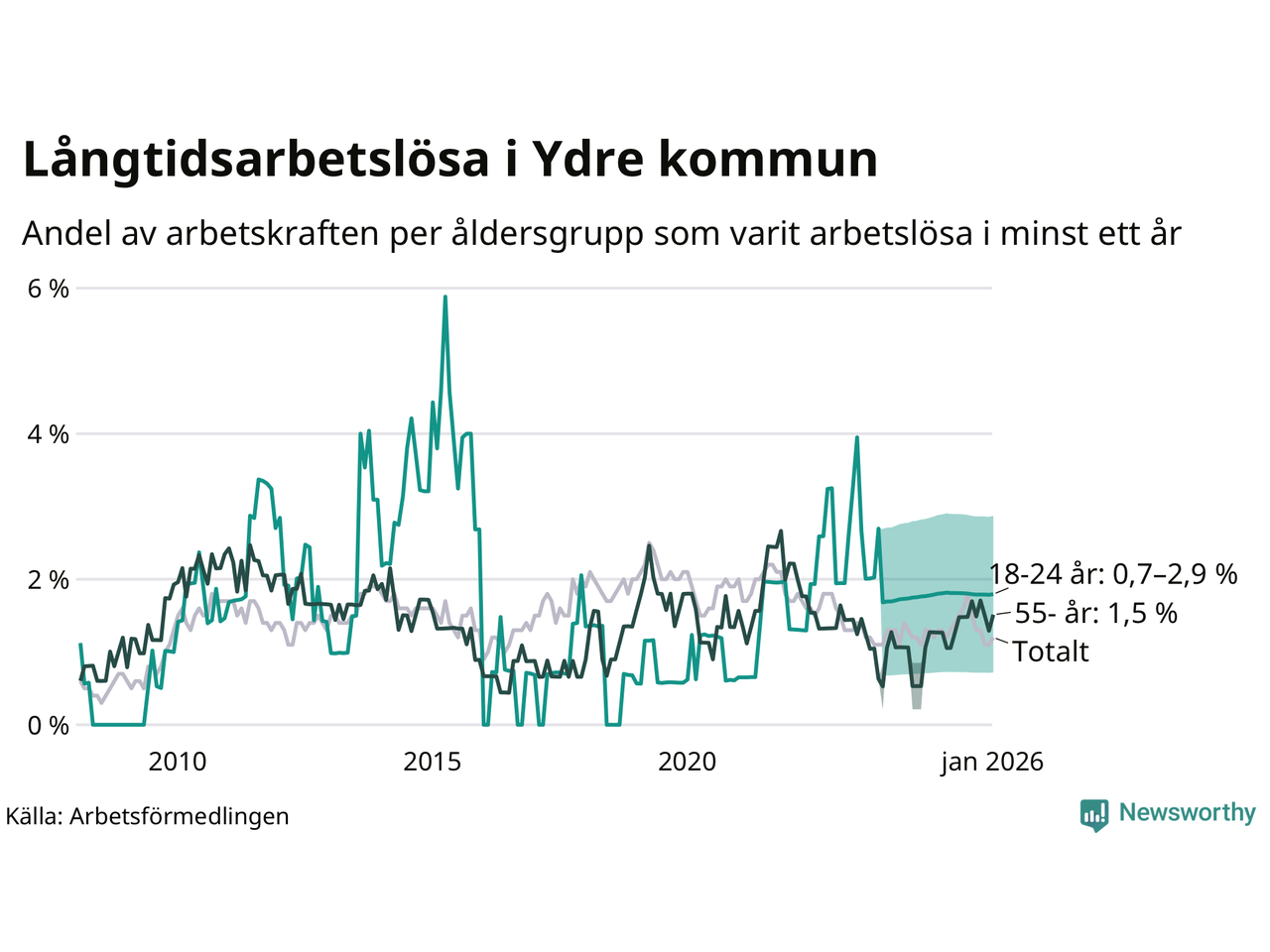 Av de 20 personerna som varit arbetslösa i mer än ett år i Ydre kommun är sju personer mellan 55 och 661 år och mellan en och fyra är mellan 18 och 24 år. För den äldre gruppen är andelen arbetslösa 1,5 procent medan den i den yngre gruppen är mellan 0,7 och 2,9 procent. Även i riket som helhet är långtidsarbetslösheten högre i gruppen äldre.