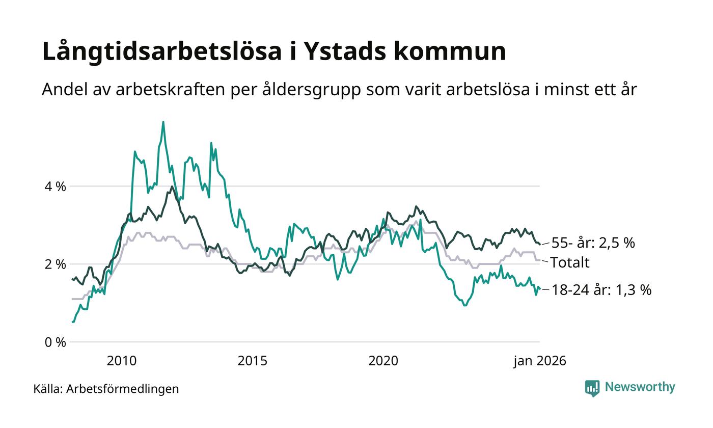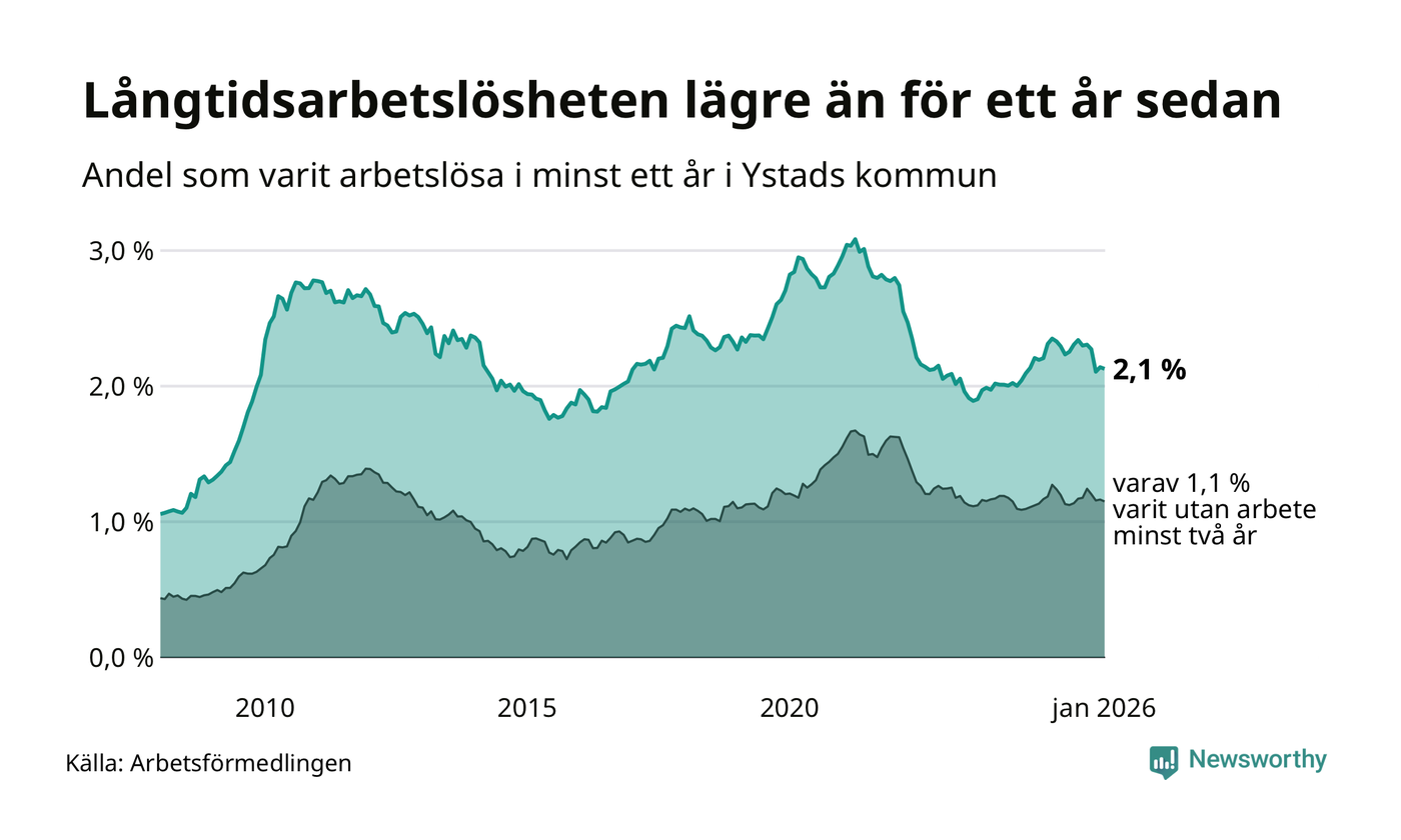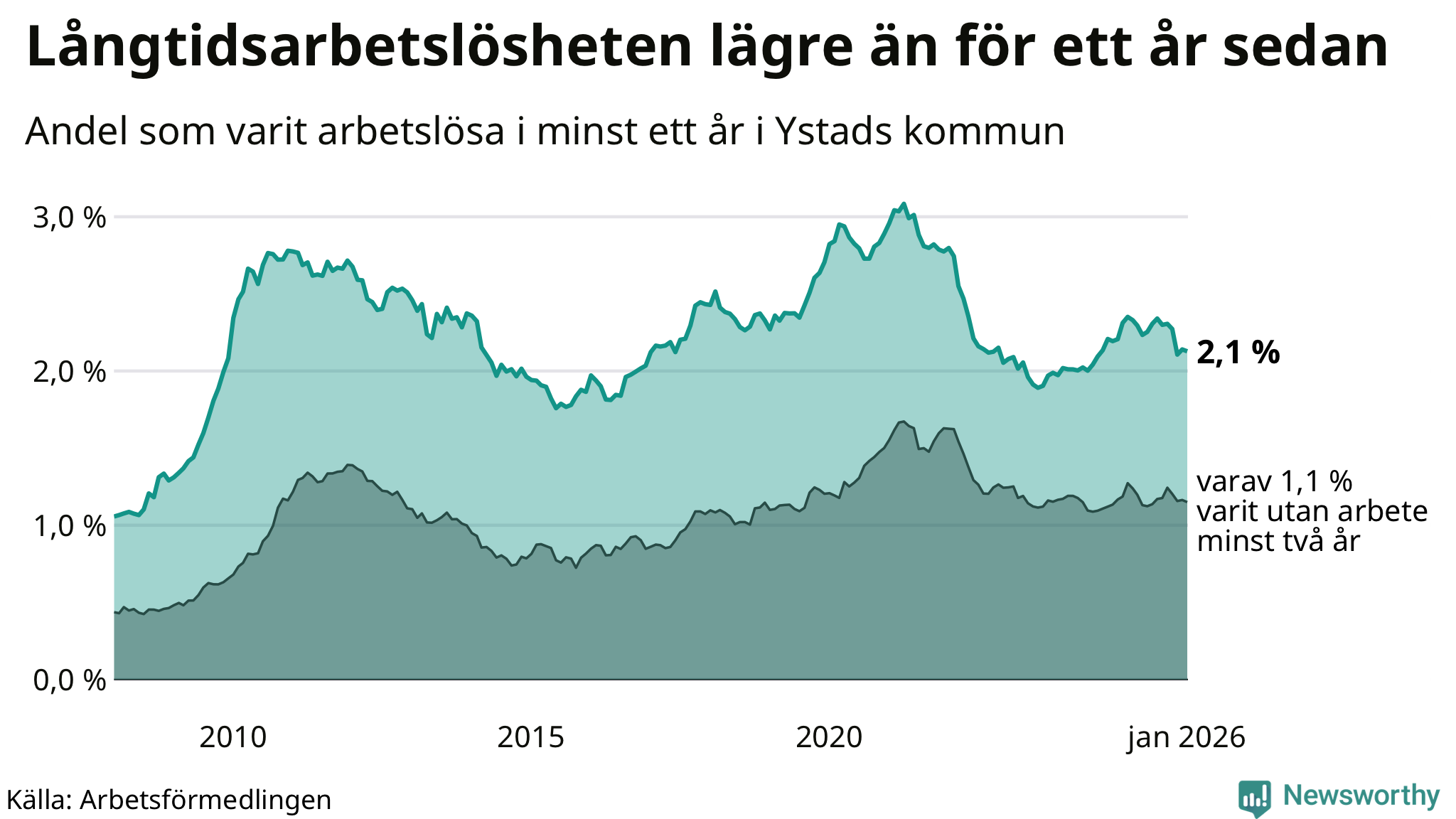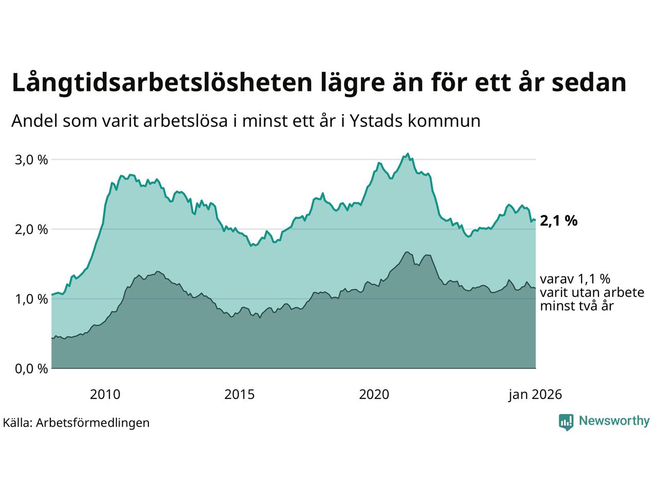 I januari hade 322 Ystadsbor varit arbetslösa i minst ett år, vilket är två fler än månaden innan. 322 personer motsvarar 2,1 procent av arbetskraften i kommunen – andelen långtidsarbetslösa är 0,3 procentenheter lägre än samma månad för ett år sedan.