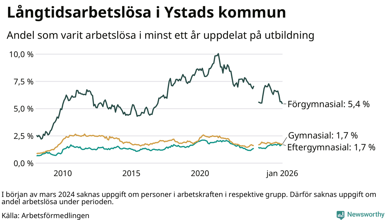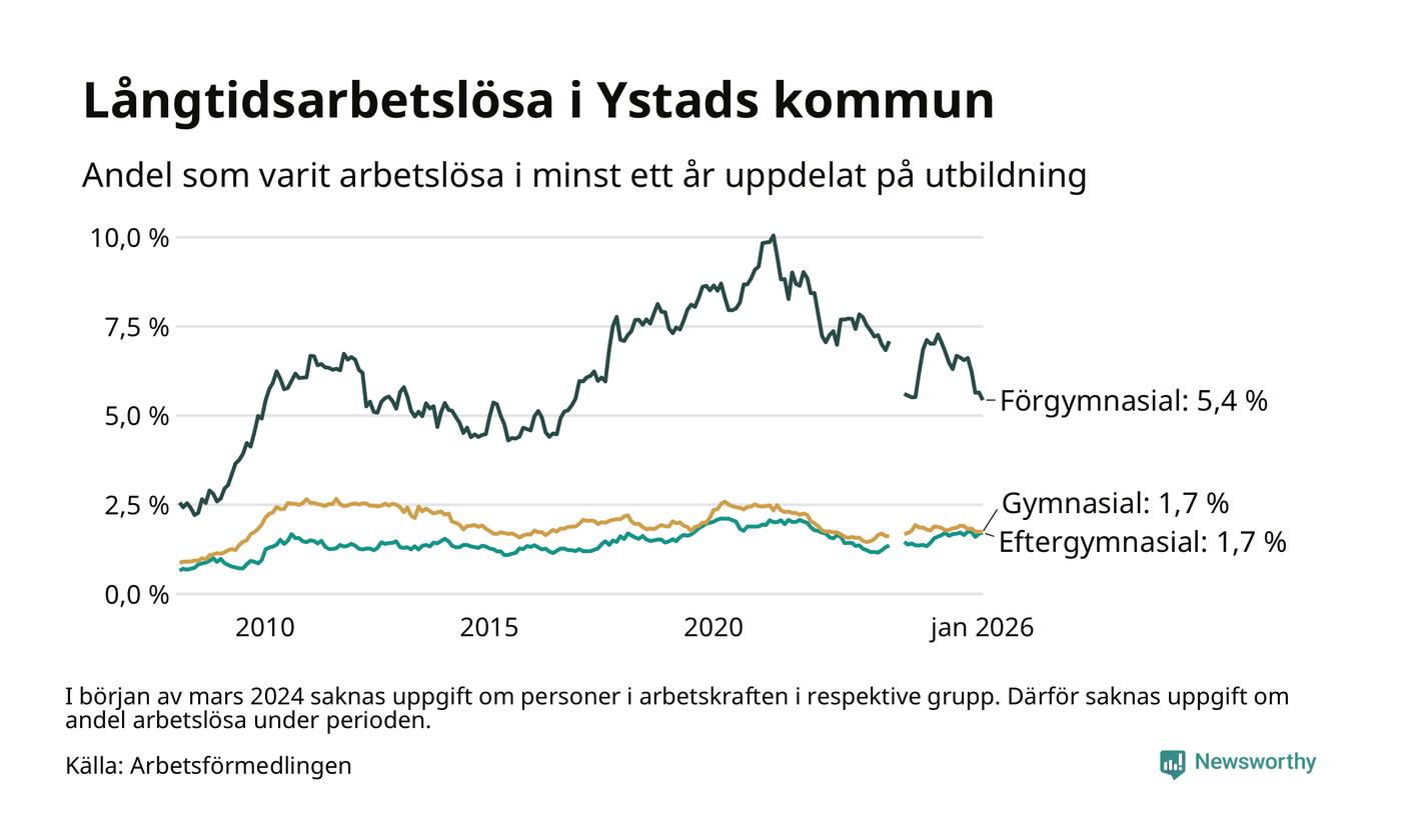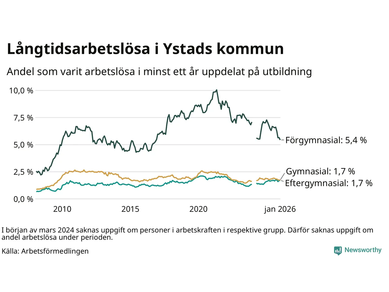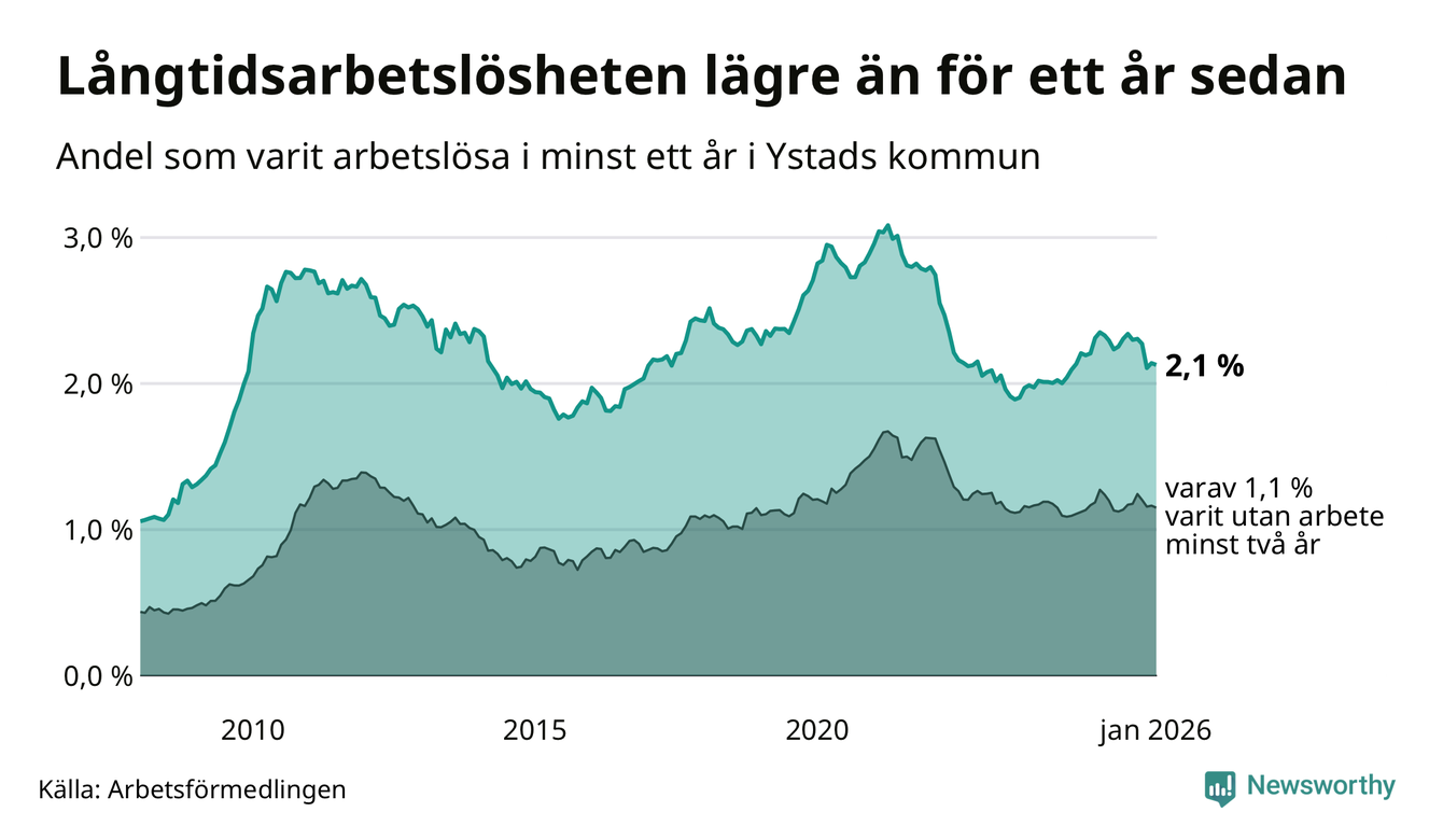 I januari hade 322 Ystadsbor varit arbetslösa i minst ett år, vilket är två fler än månaden innan. 322 personer motsvarar 2,1 procent av arbetskraften i kommunen – andelen långtidsarbetslösa är 0,3 procentenheter lägre än samma månad för ett år sedan.