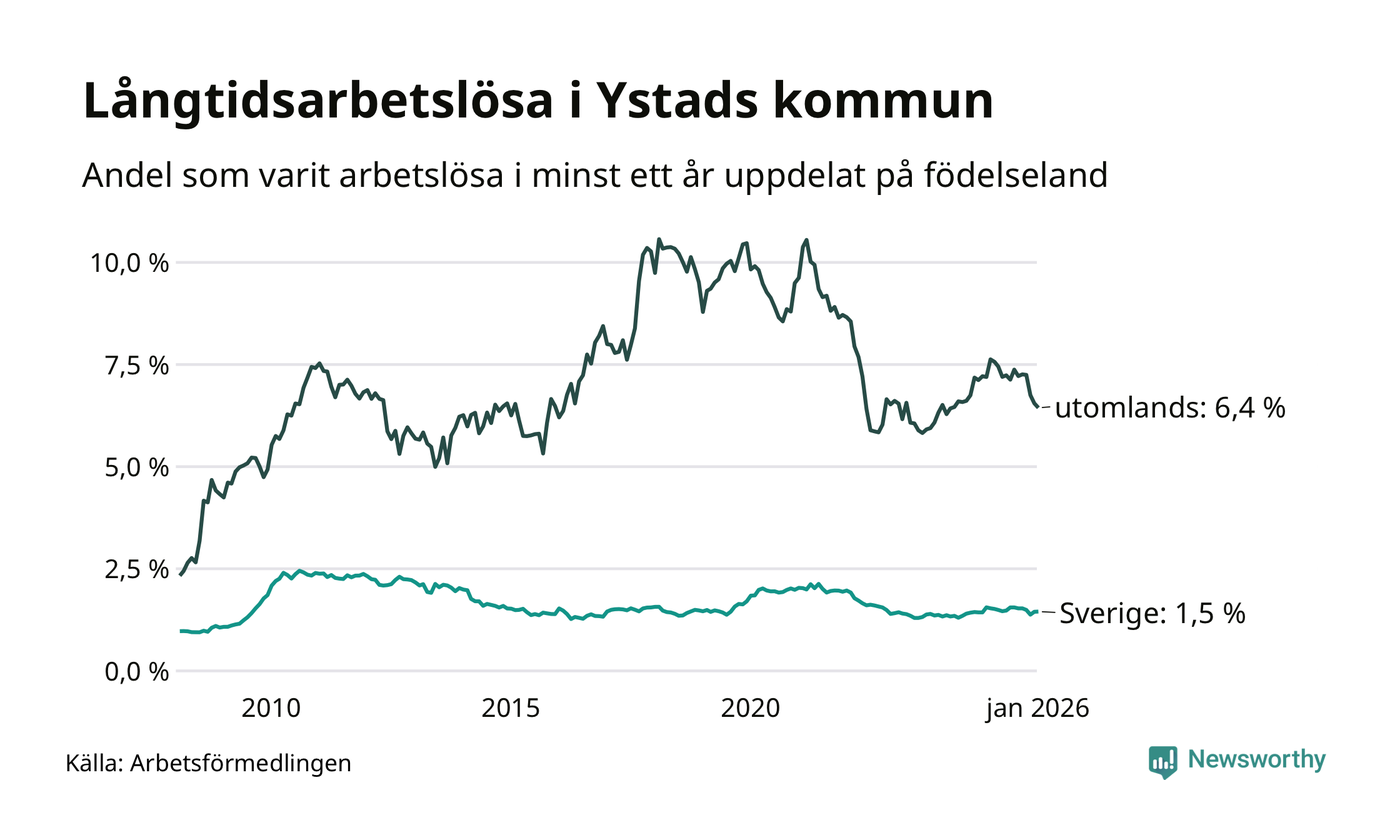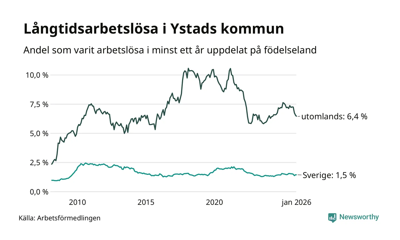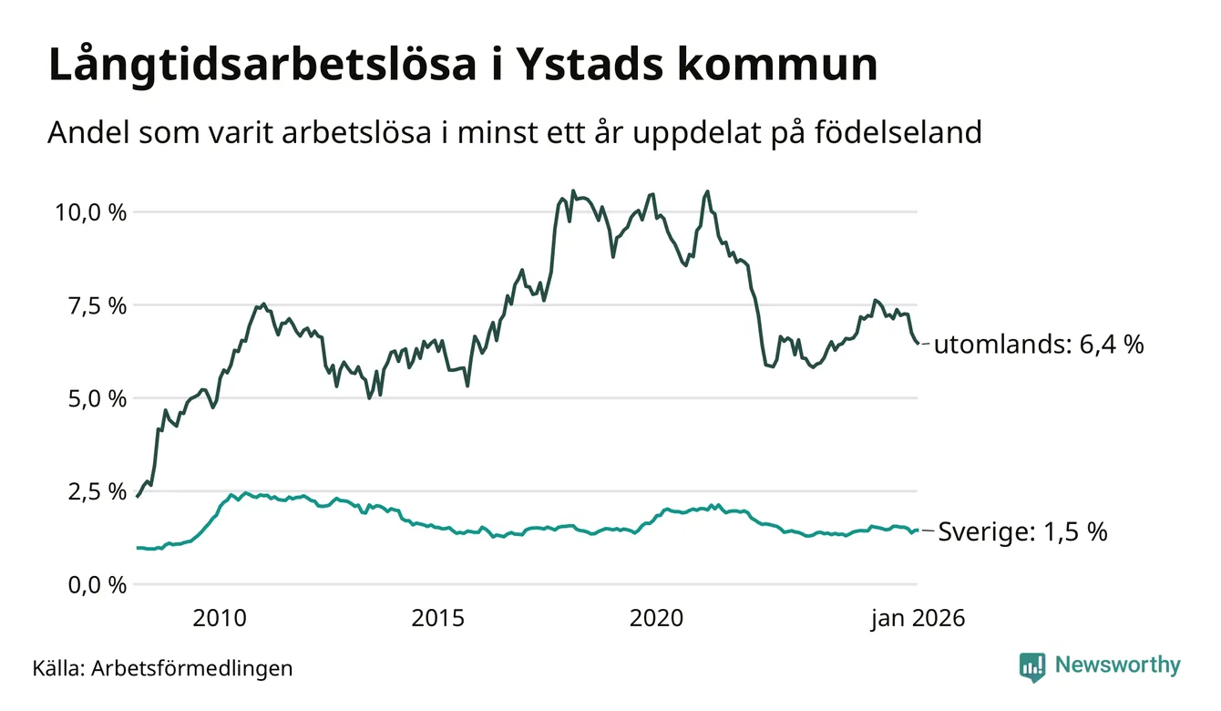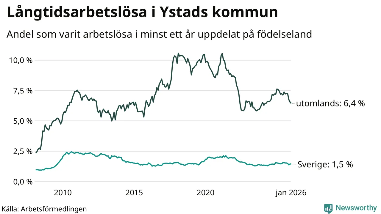 190 av de långtidsarbetslösa i Ystad är födda i Sverige, medan 132 är födda utomlands. Det innebär att långtidsarbetslösheten bland Sverigefödda är 1,5 procent, medan den är fyra gånger så hög – 6,4 procent – bland födda utomlands. Även i riket som helhet är arbetslösheten högre bland utrikesfödda.