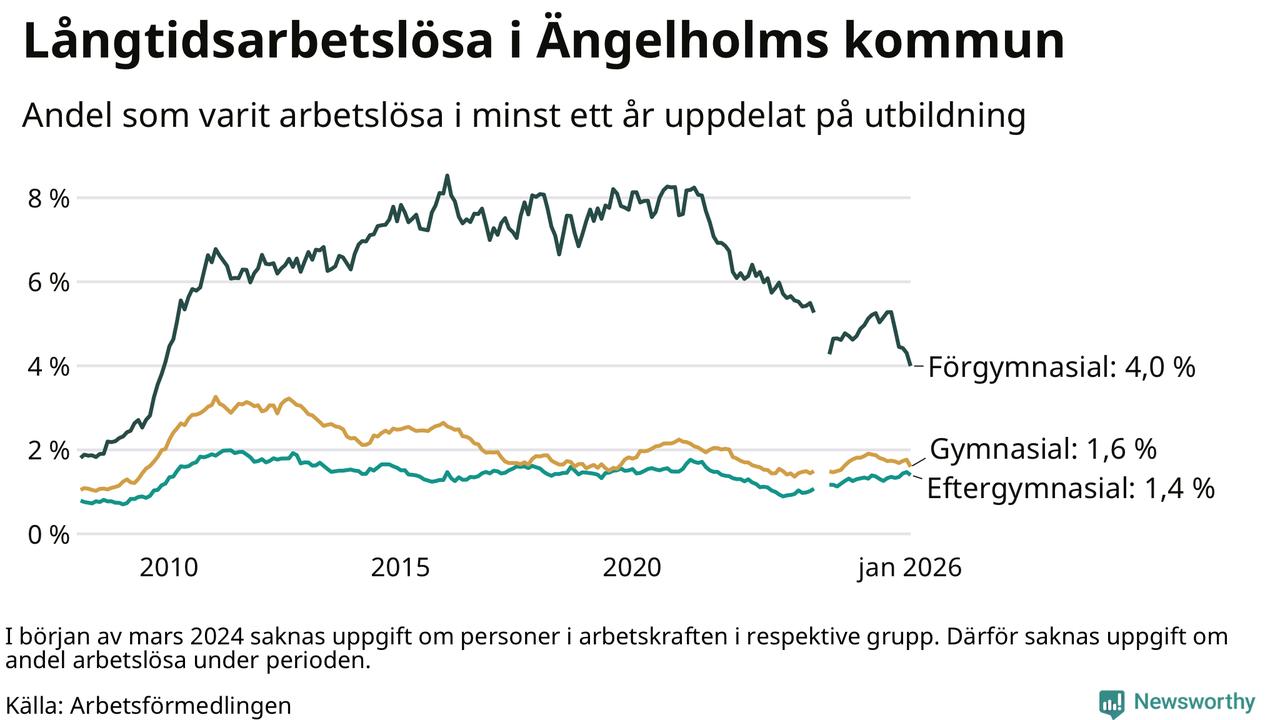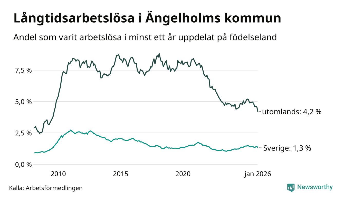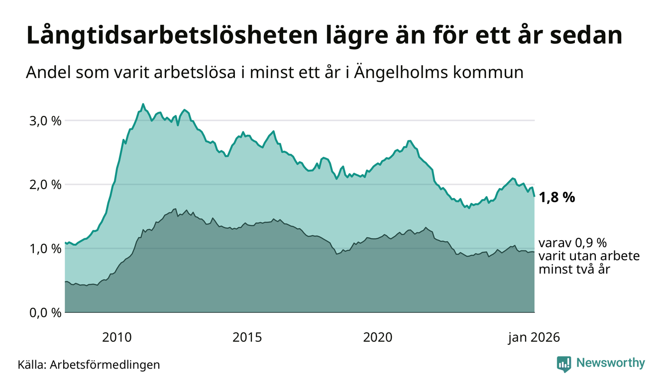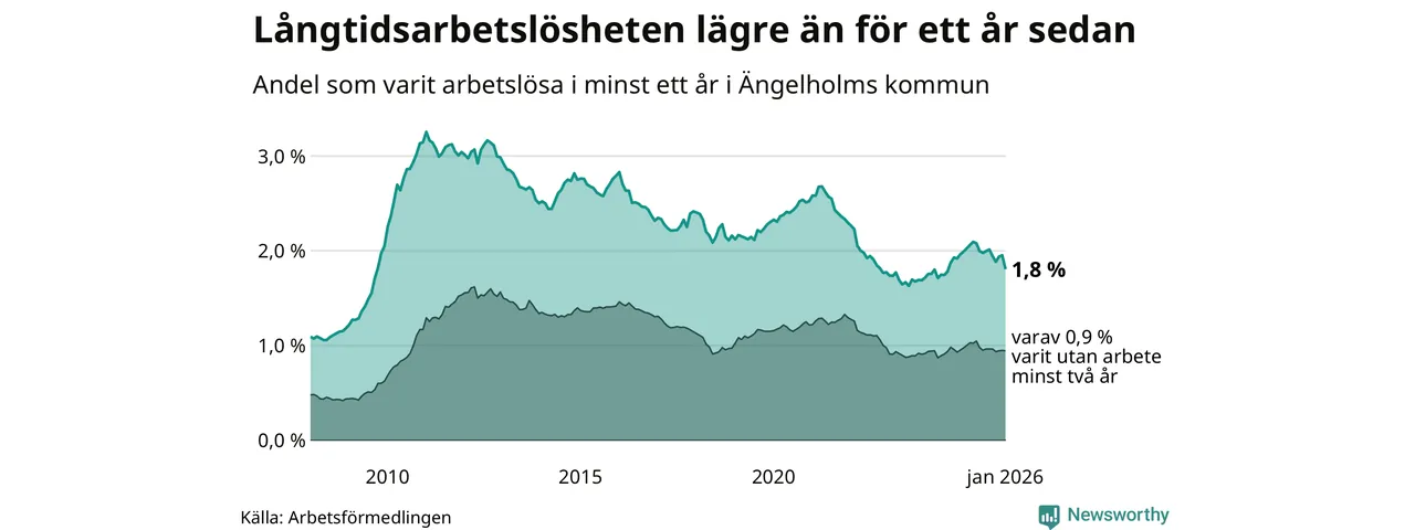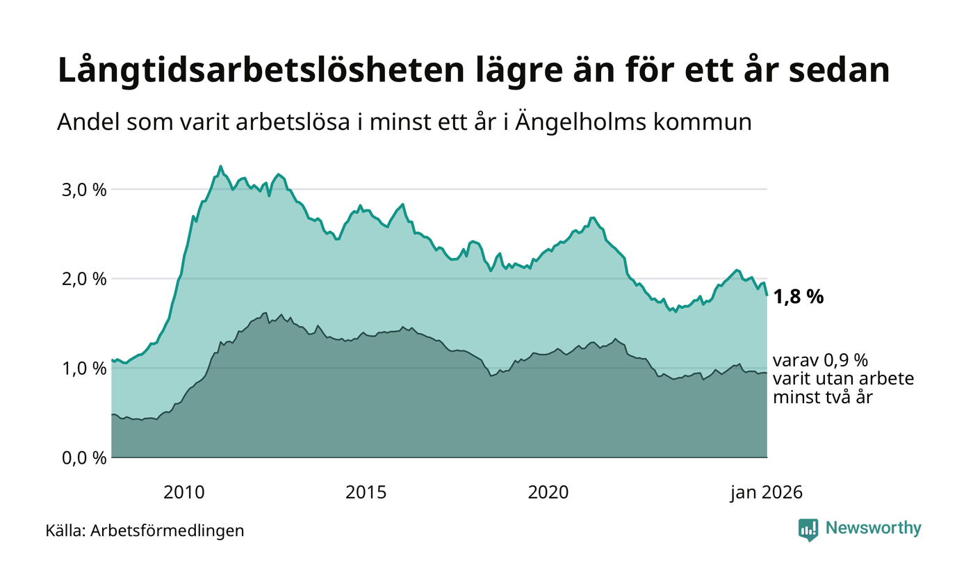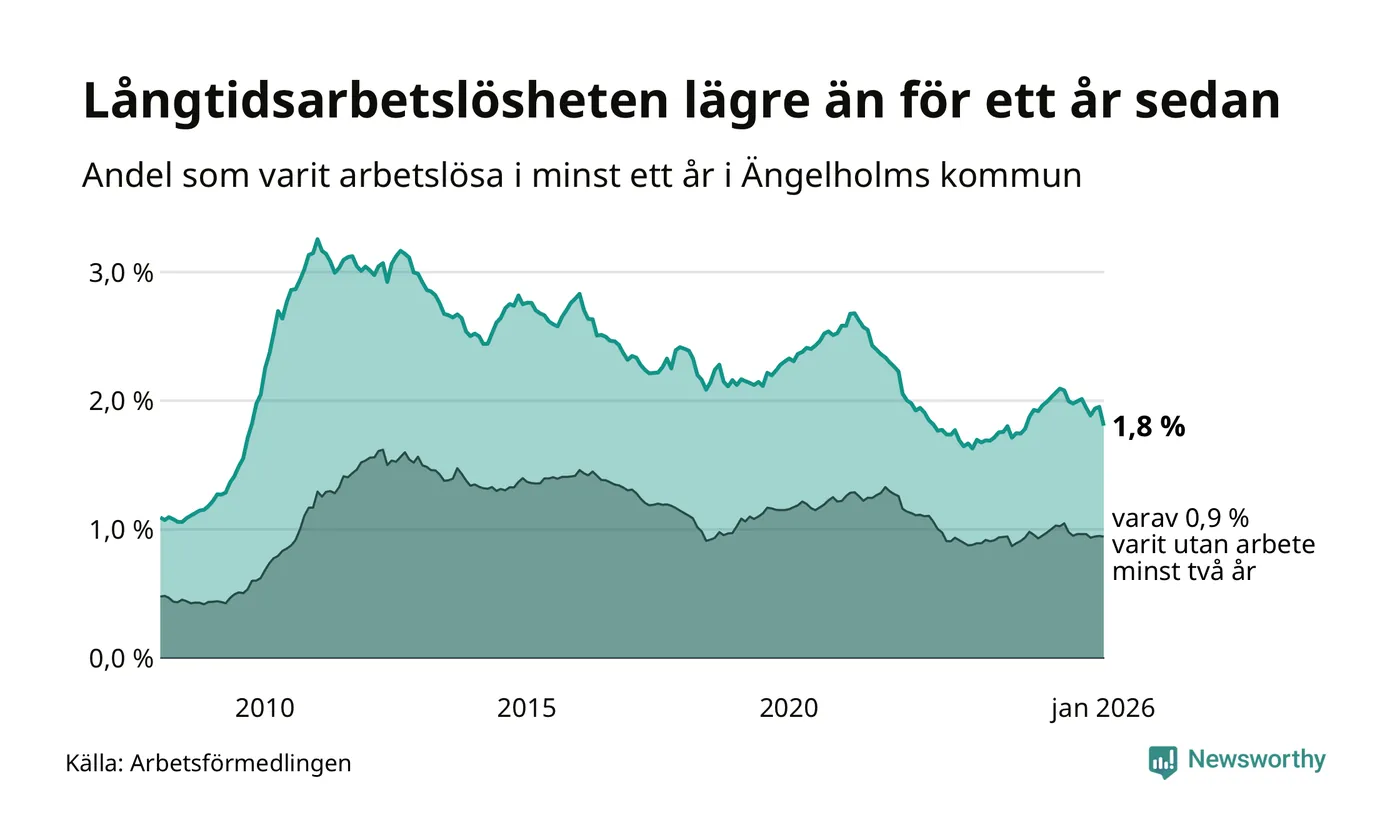 I januari hade 400 Ängelholmsbor varit arbetslösa i minst ett år, vilket är 28 färre än månaden innan. 400 personer motsvarar 1,8 procent av arbetskraften i kommunen – andelen långtidsarbetslösa är 0,2 procentenheter lägre än samma månad för ett år sedan.