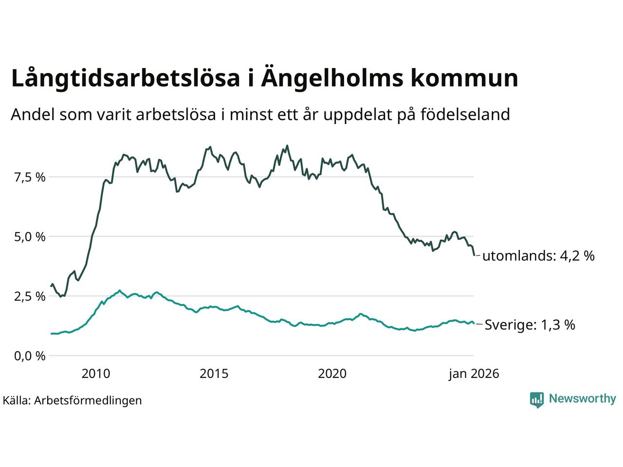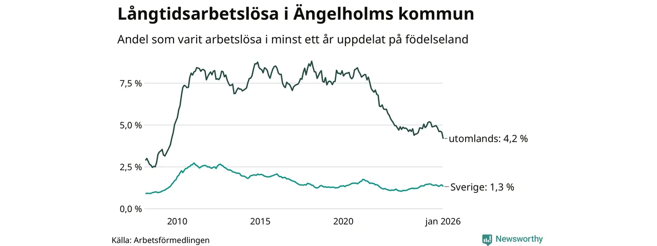 245 av de långtidsarbetslösa i Ängelholm är födda i Sverige, medan 155 är födda utomlands. Det innebär att långtidsarbetslösheten bland Sverigefödda är 1,3 procent, medan den är tre gånger så hög – 4,2 procent – bland födda utomlands. Även i riket som helhet är arbetslösheten högre bland utrikesfödda.