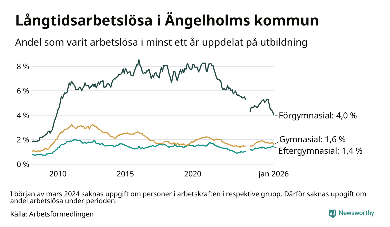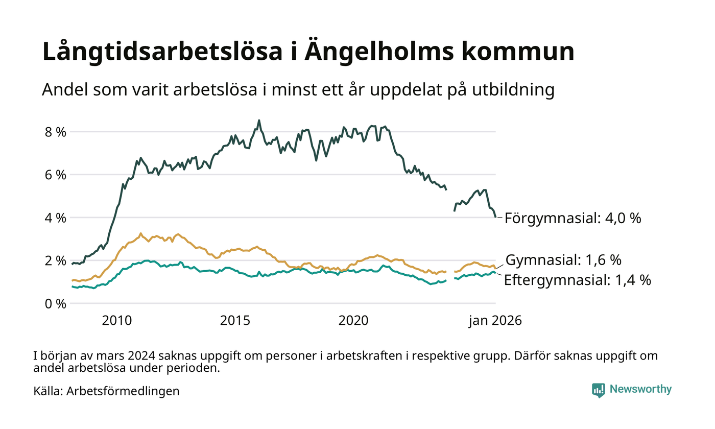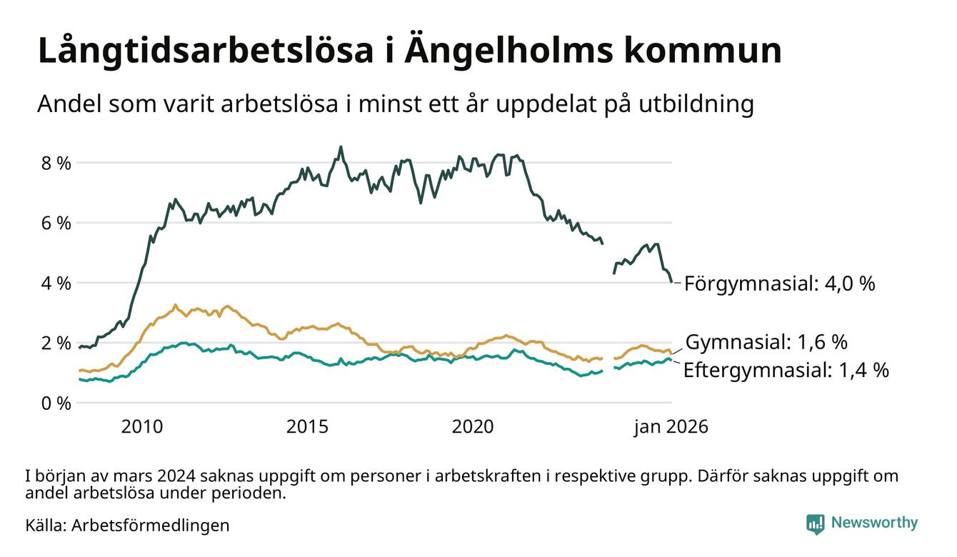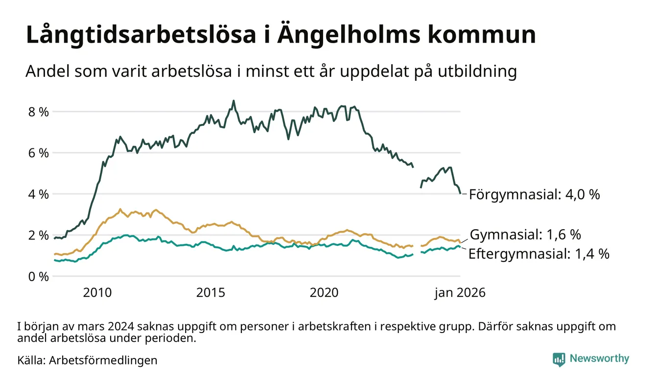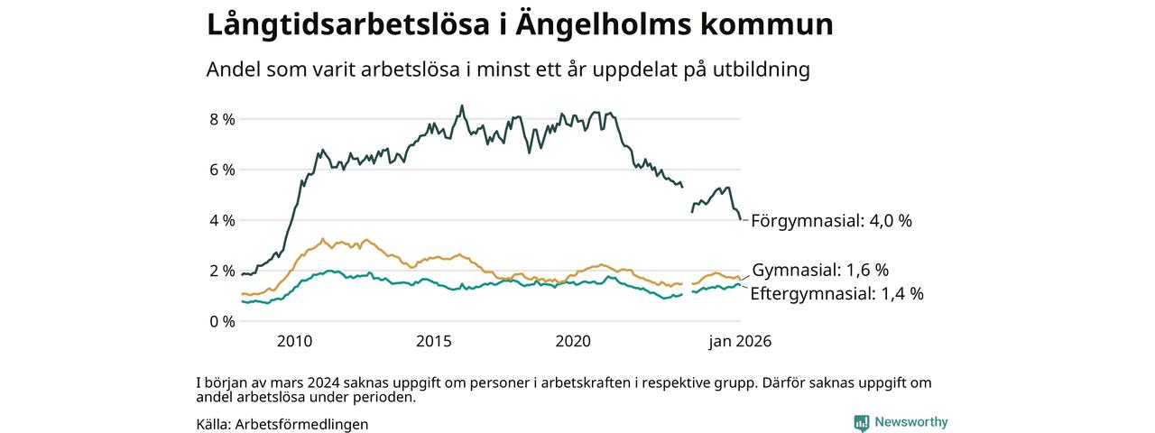 Graf: Andel arbetslösa i Ängelholm som varit utan arbete i minst 12 månader