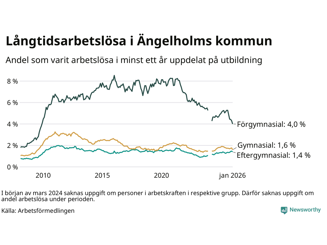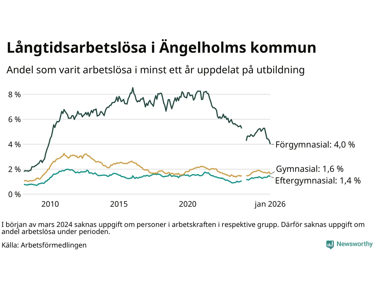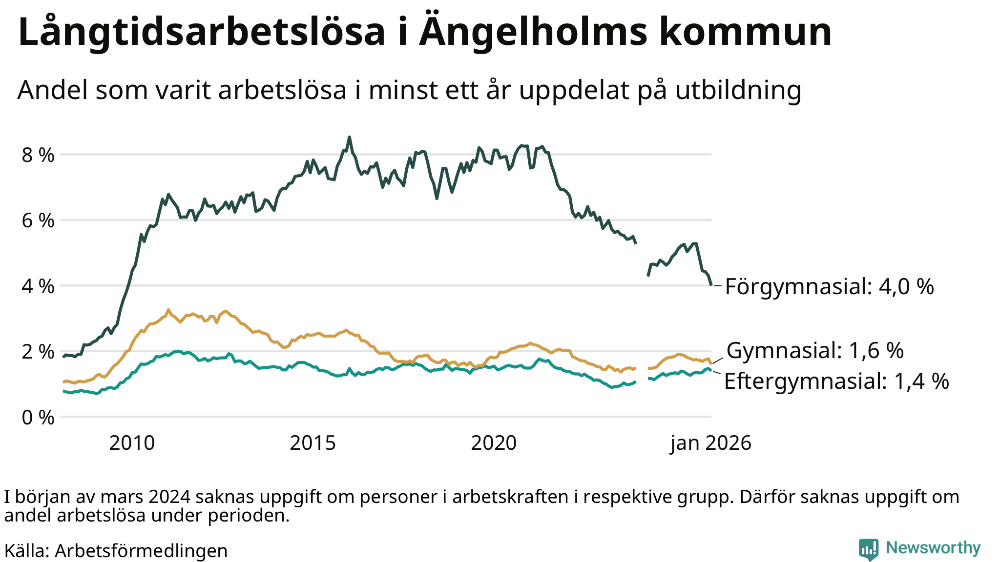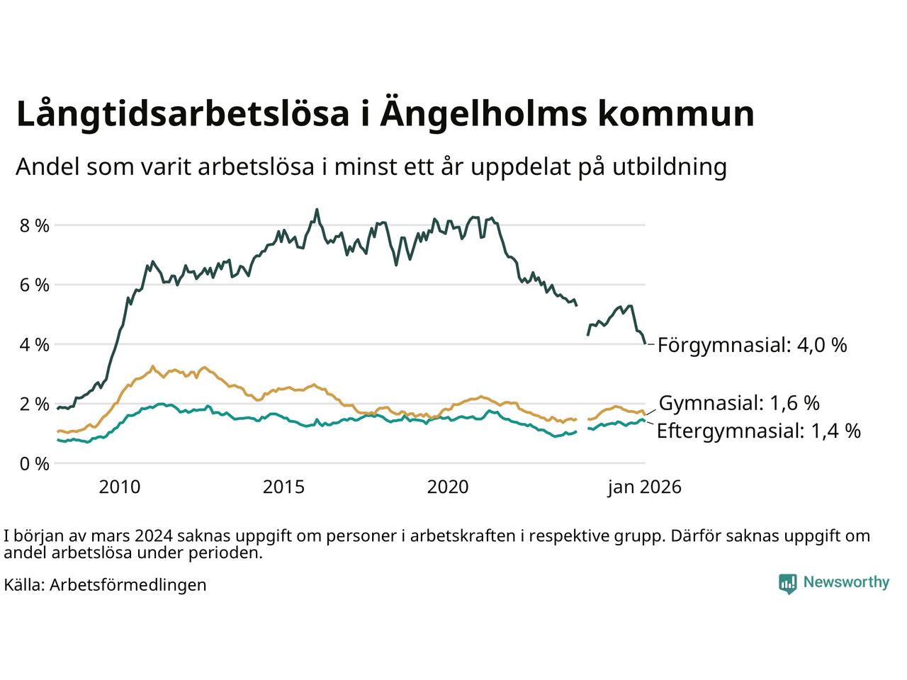 Graf: Andel arbetslösa i Ängelholm som varit utan arbete i minst 12 månader