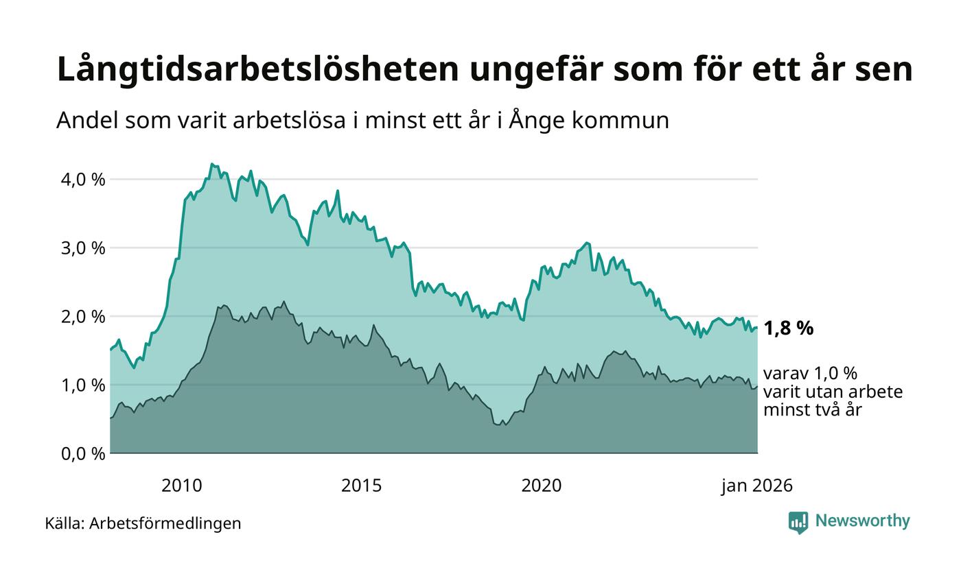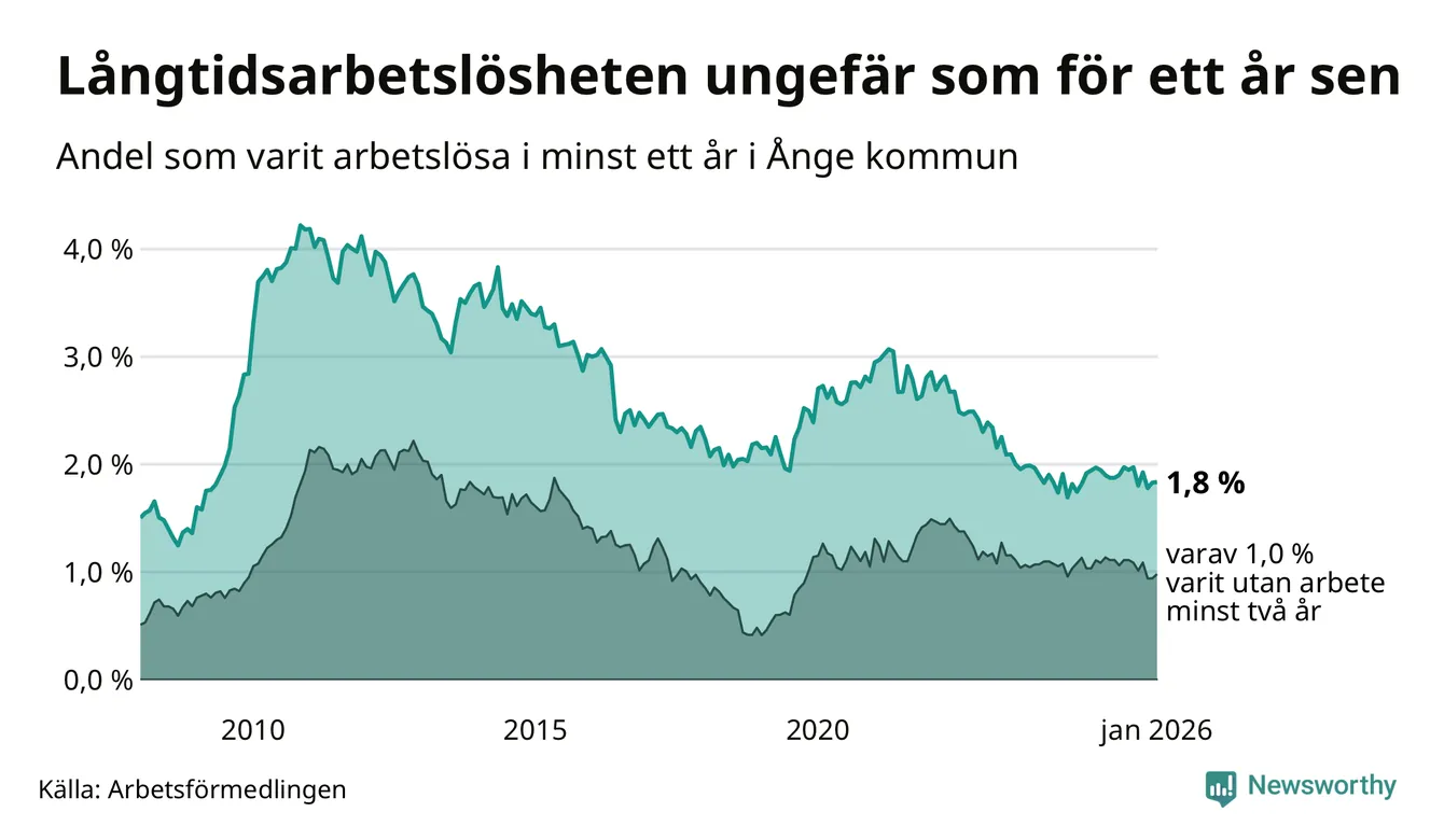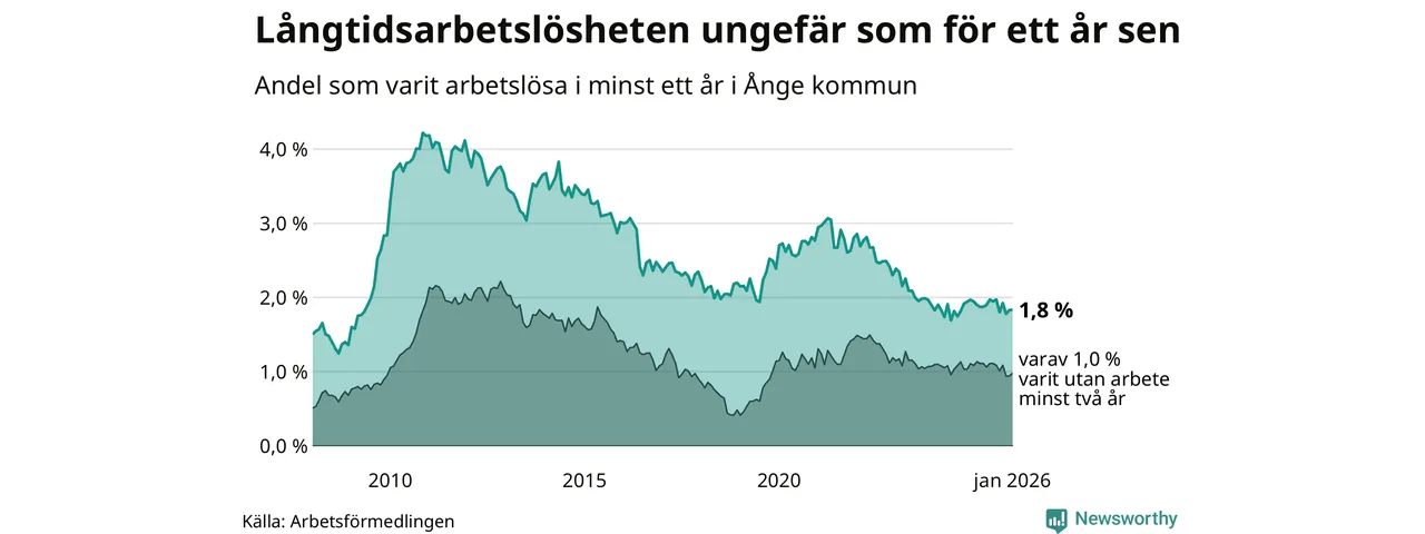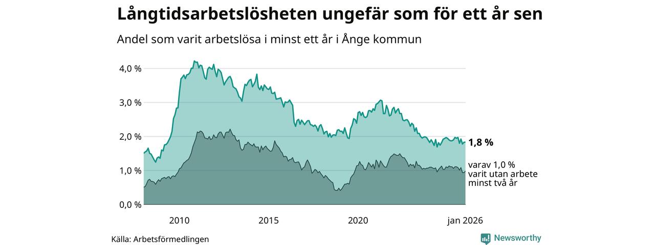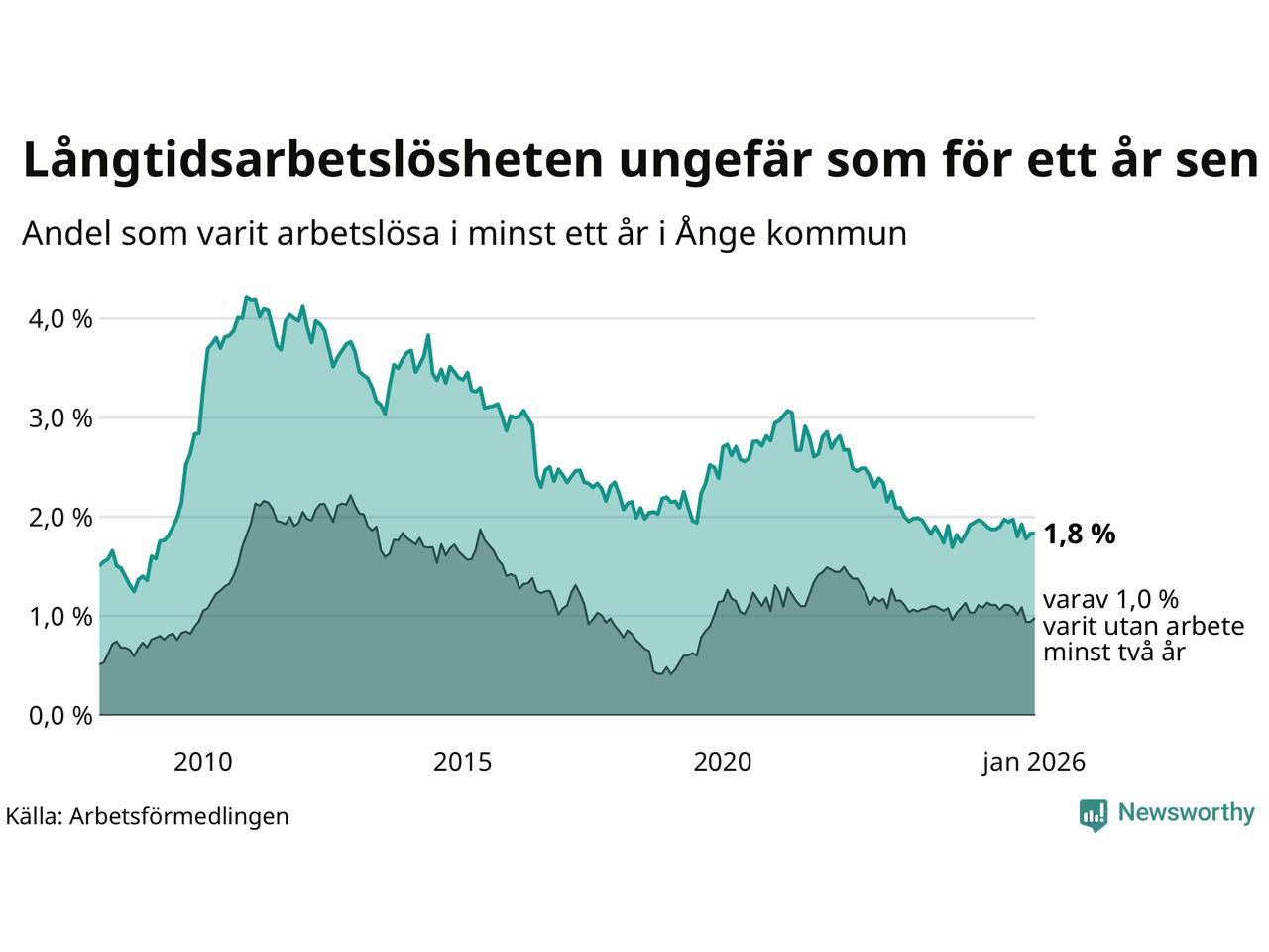I januari hade 75 Ångebor varit arbetslösa i minst ett år, vilket är en fler än månaden innan. 75 personer motsvarar 1,8 procent av arbetskraften i kommunen – andelen långtidsarbetslösa är ungefär på samma nivå som för ett år sedan.