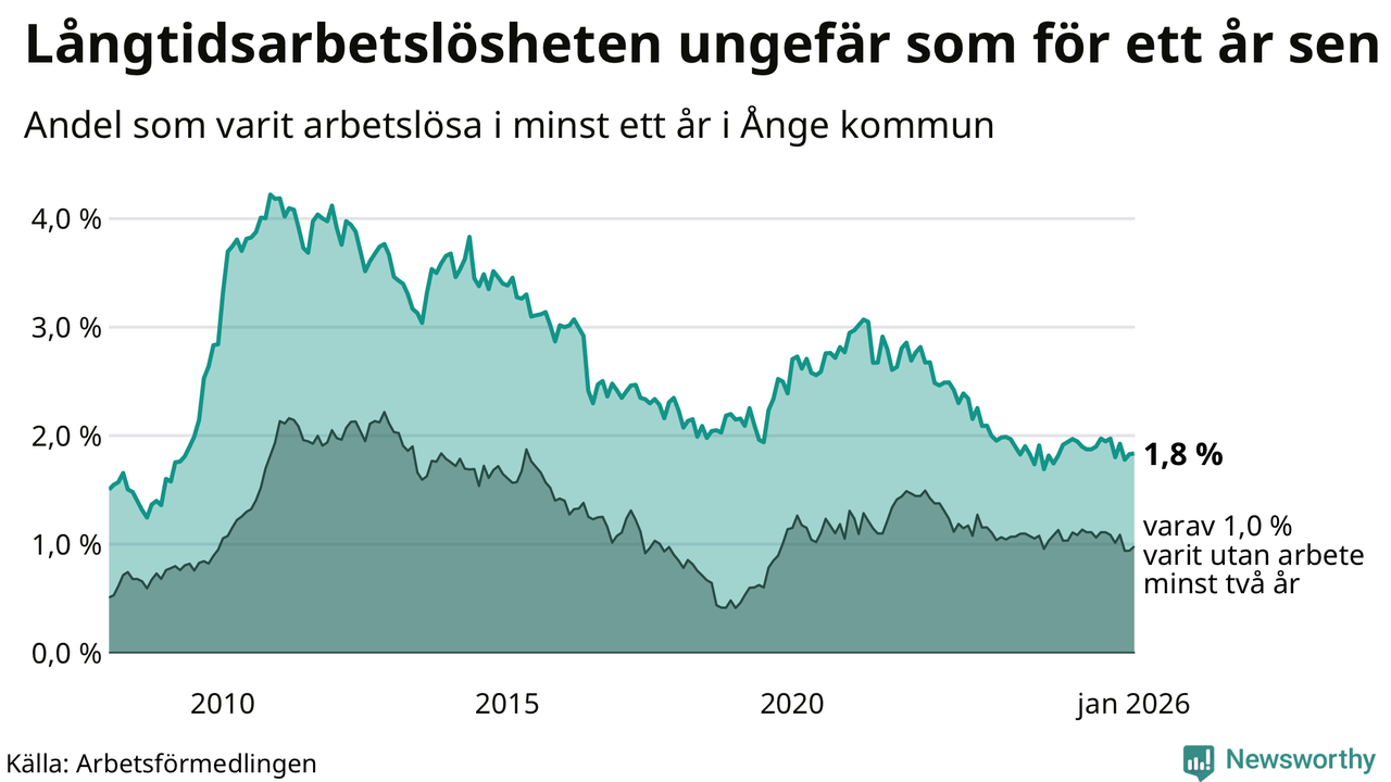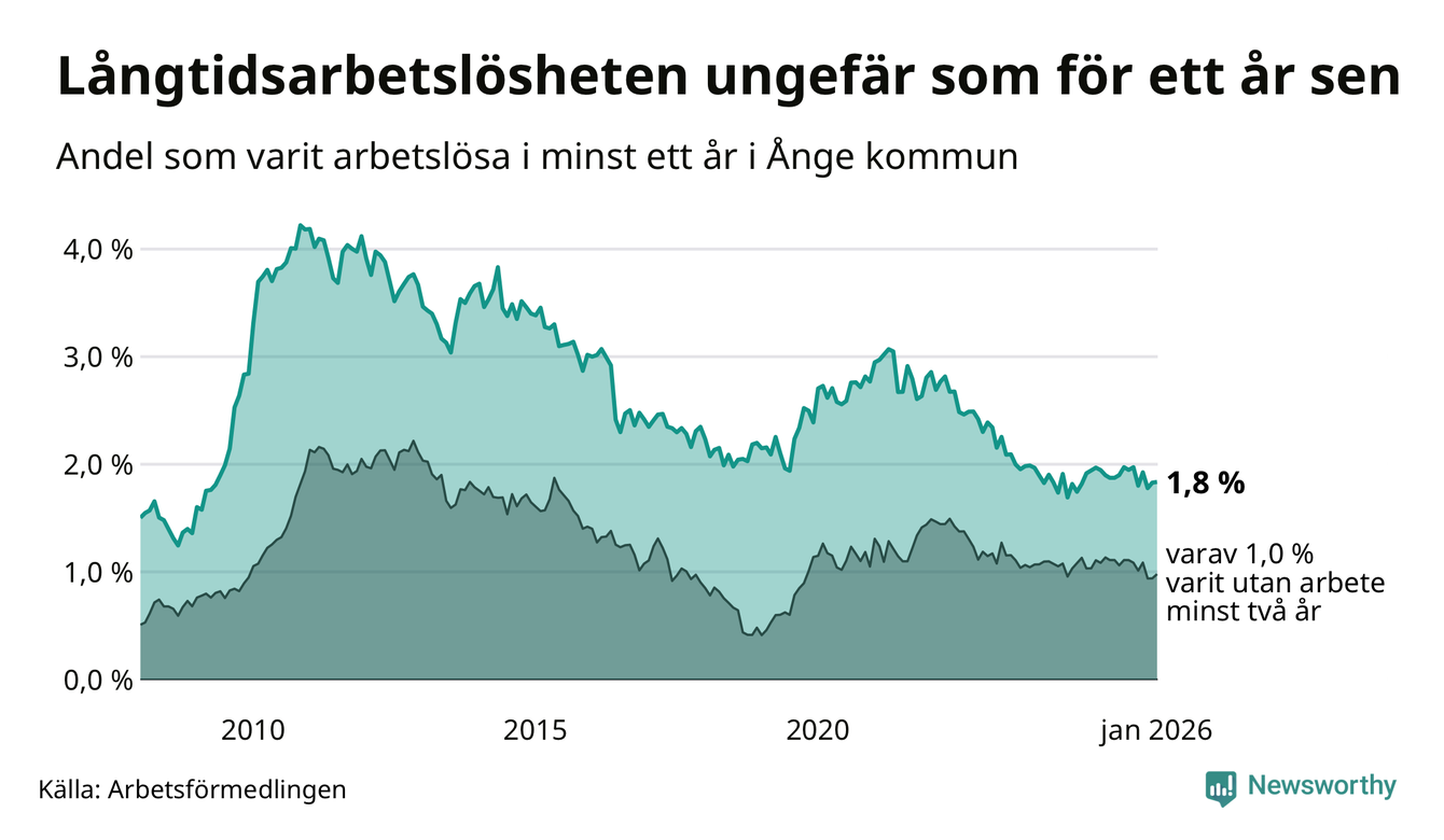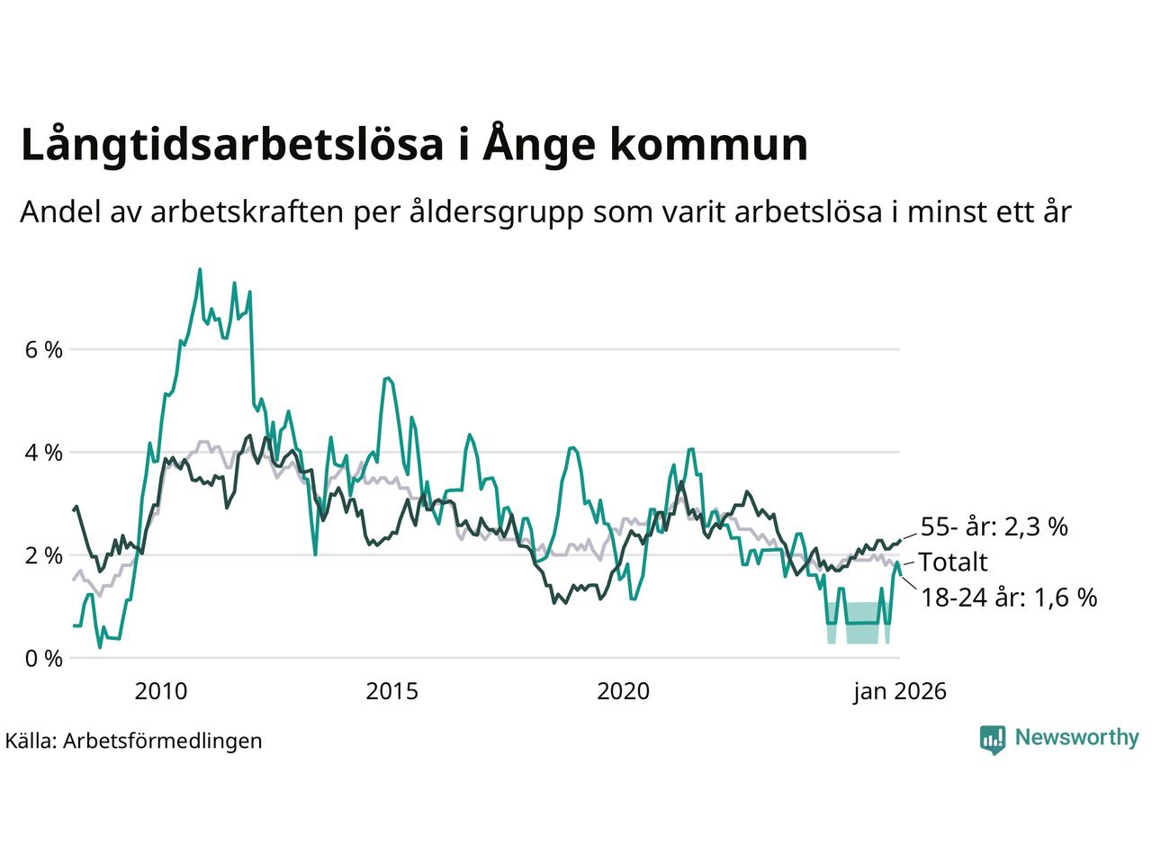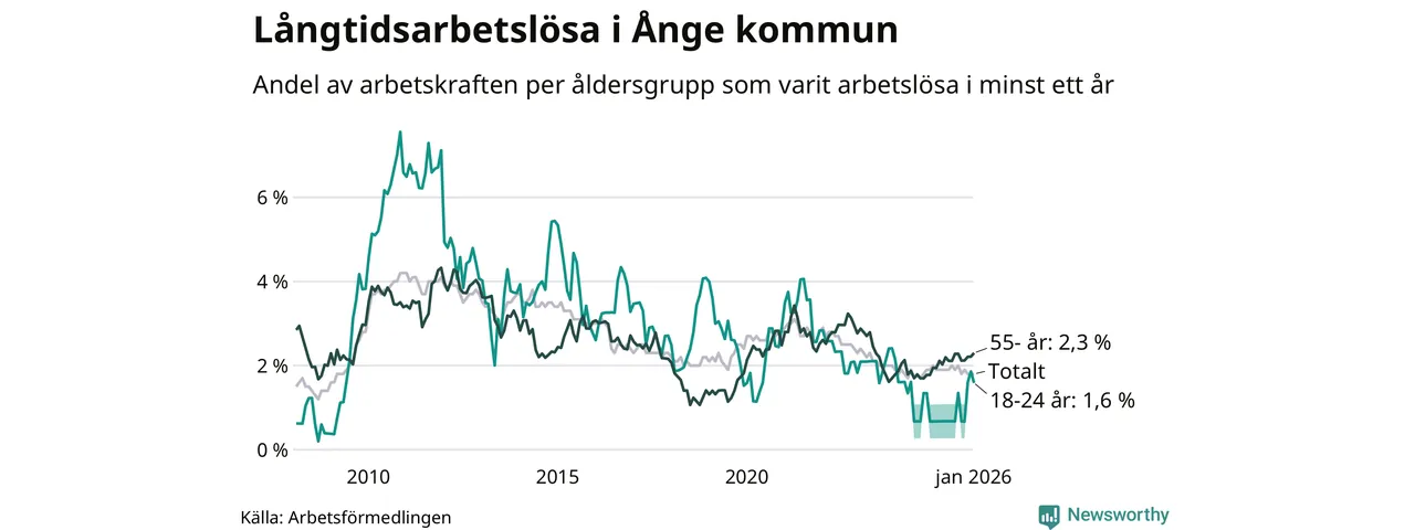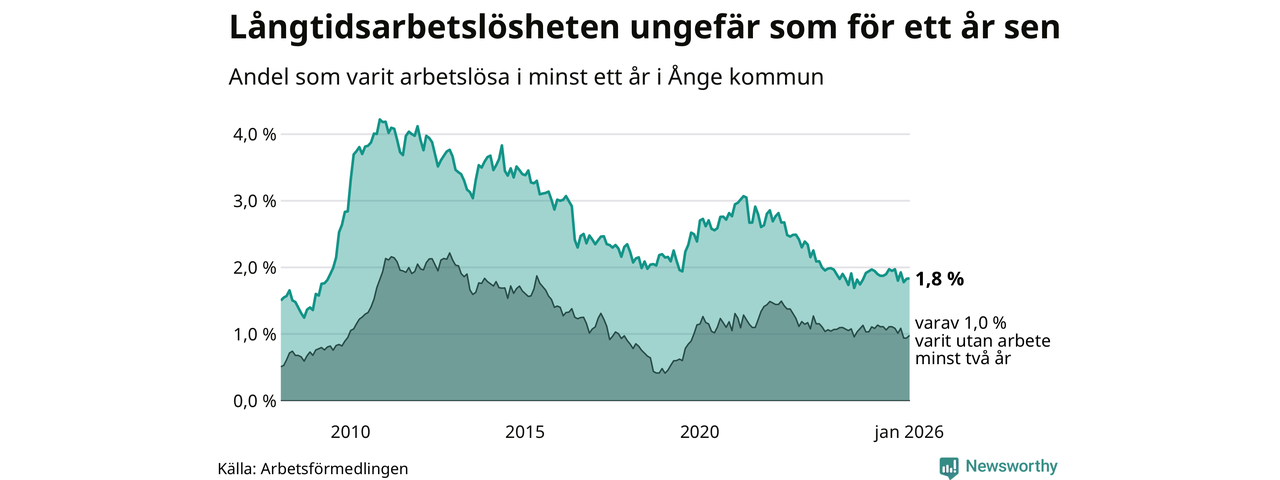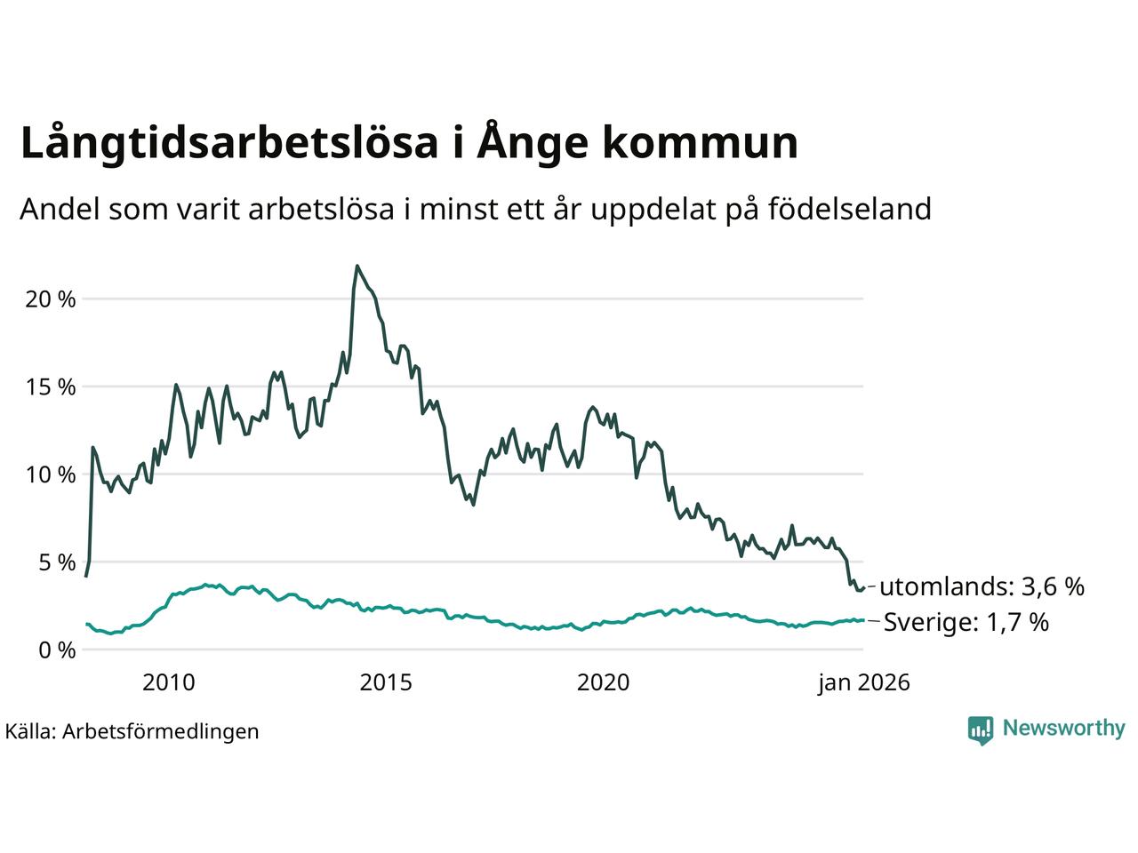 I januari hade 75 Ångebor varit arbetslösa i minst ett år, vilket är en fler än månaden innan. 75 personer motsvarar 1,8 procent av arbetskraften i kommunen – andelen långtidsarbetslösa är ungefär på samma nivå som för ett år sedan.
