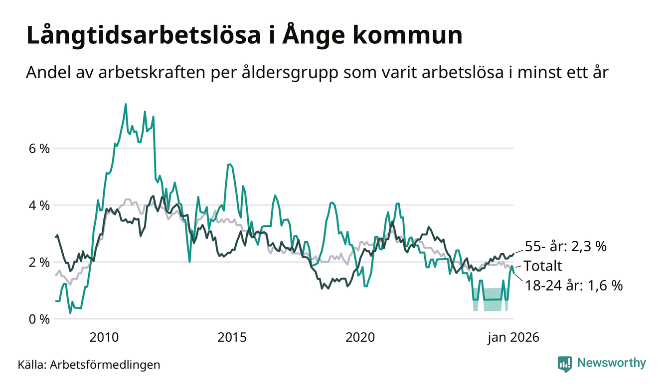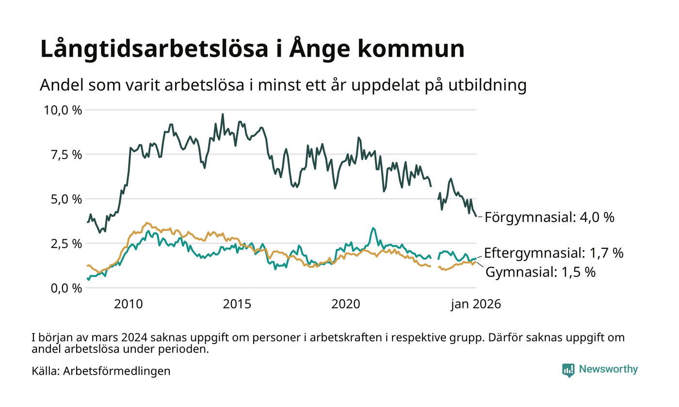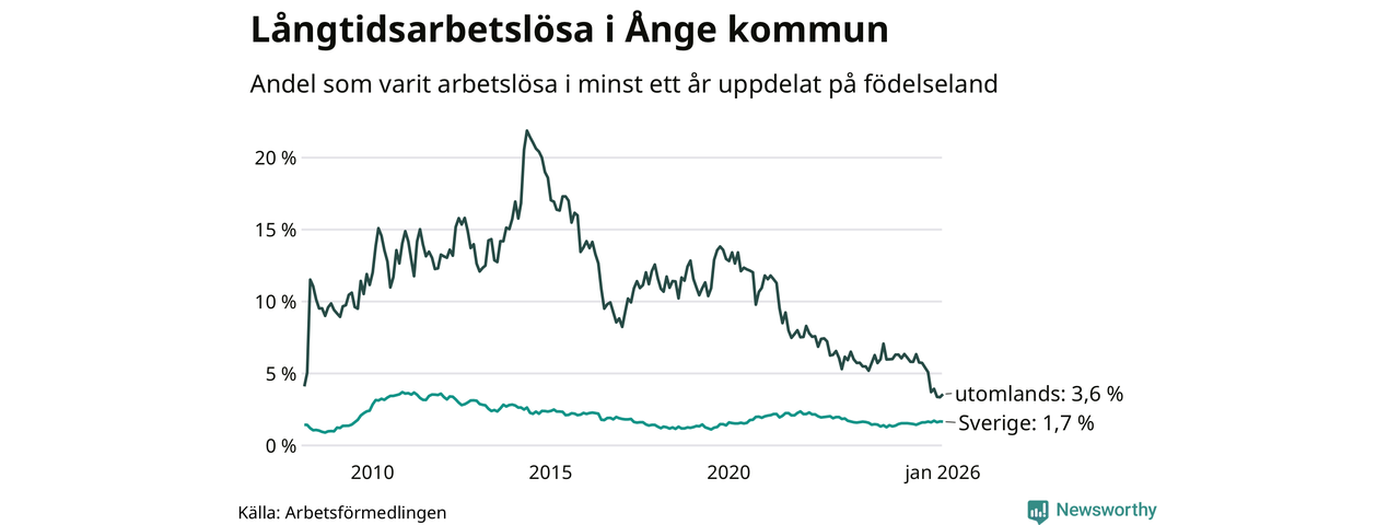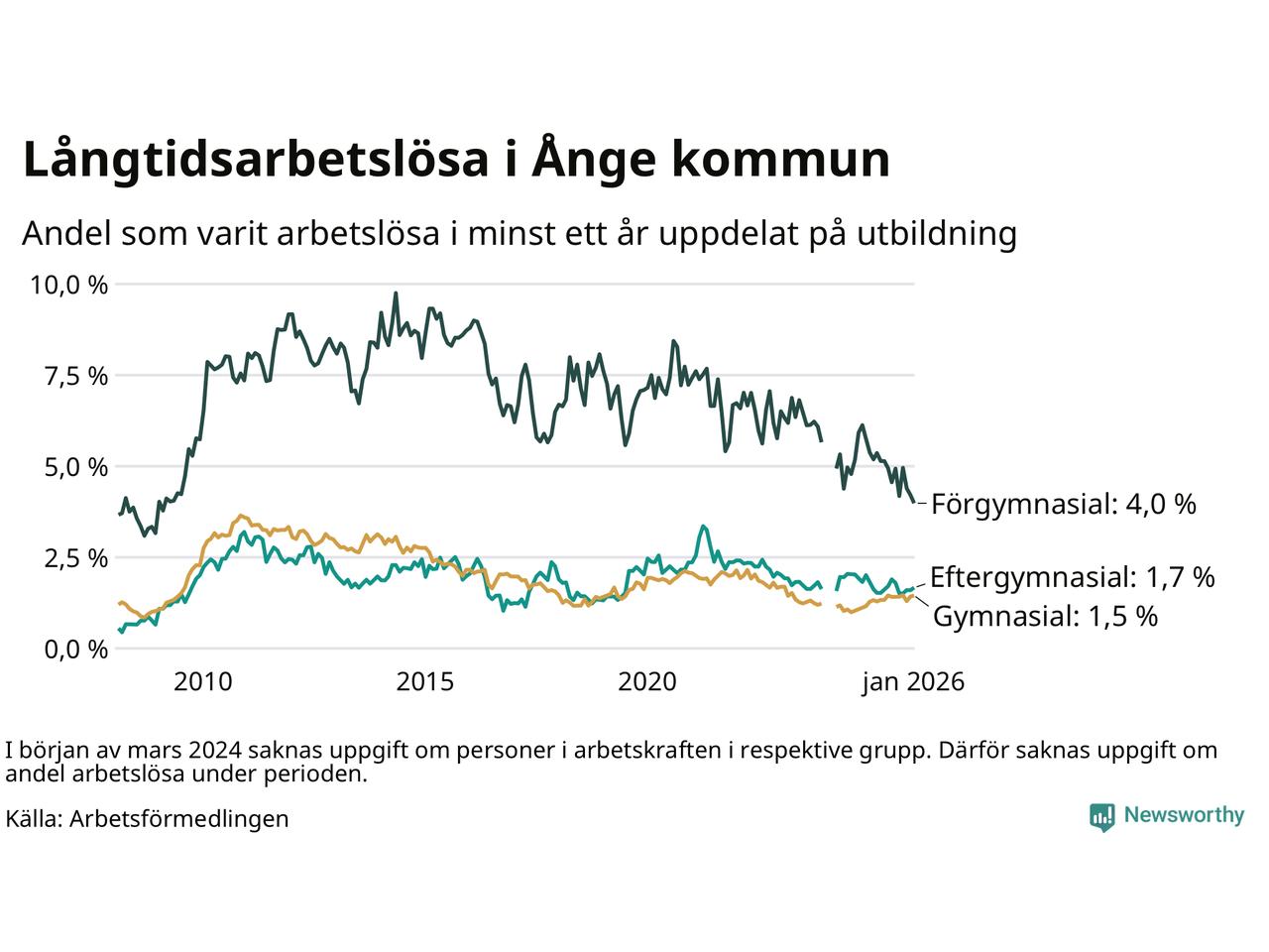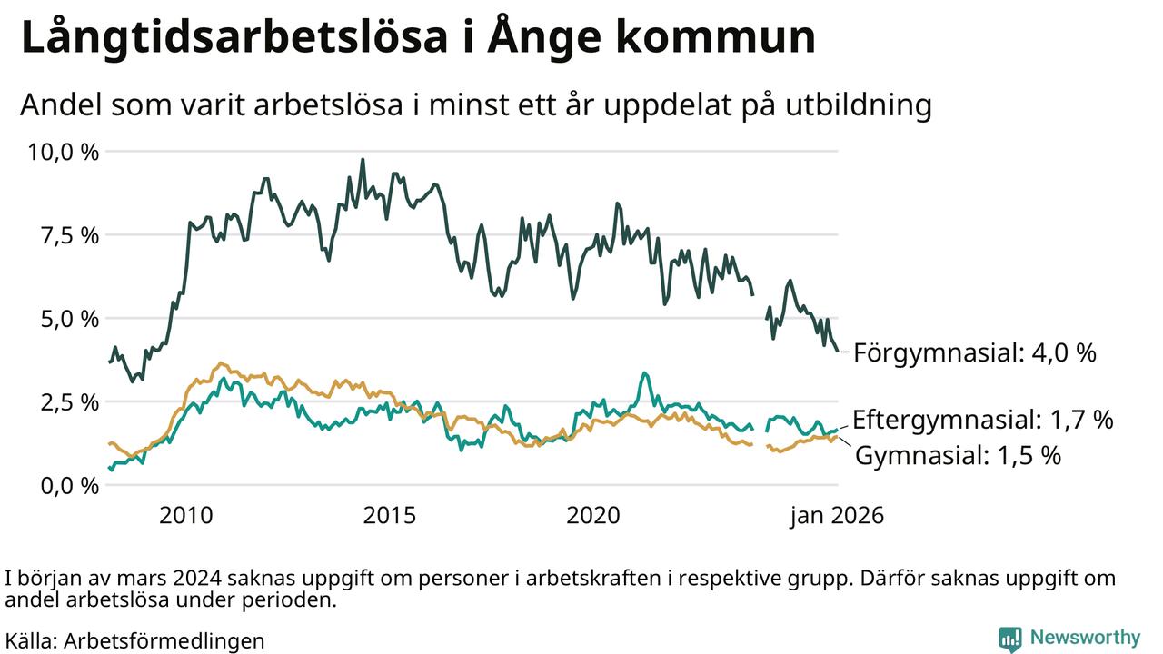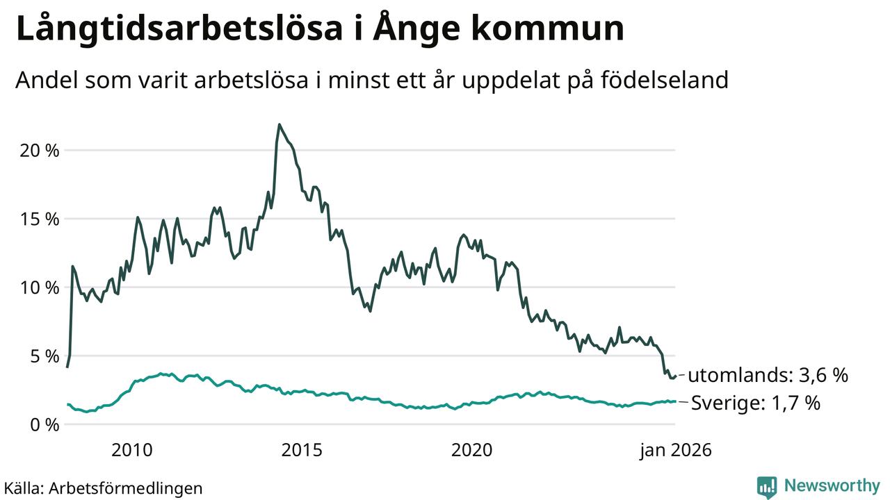 I januari hade 75 Ångebor varit arbetslösa i minst ett år, vilket är en fler än månaden innan. 75 personer motsvarar 1,8 procent av arbetskraften i kommunen – andelen långtidsarbetslösa är ungefär på samma nivå som för ett år sedan.