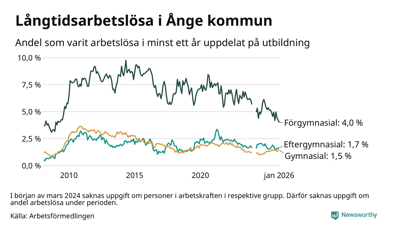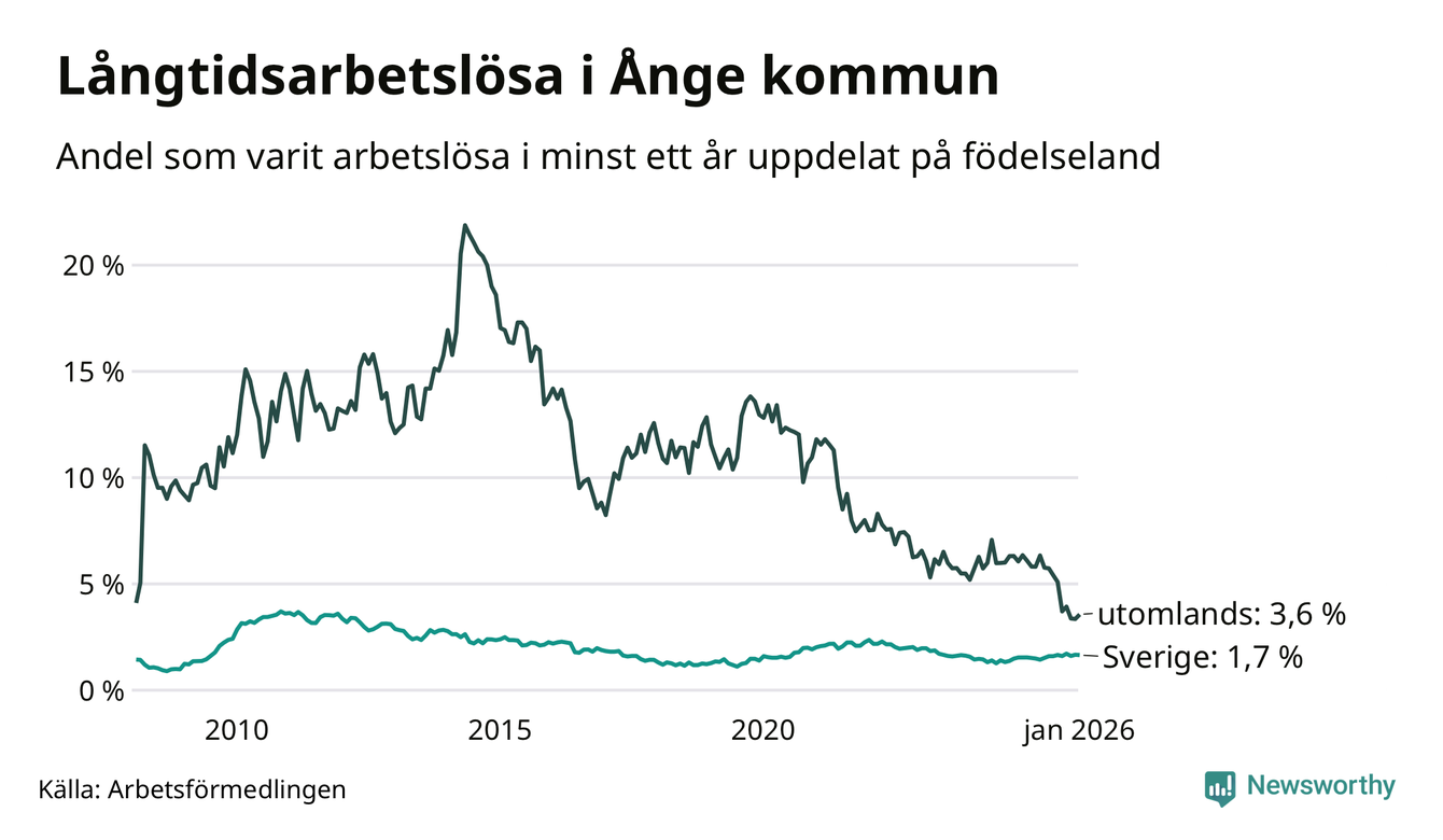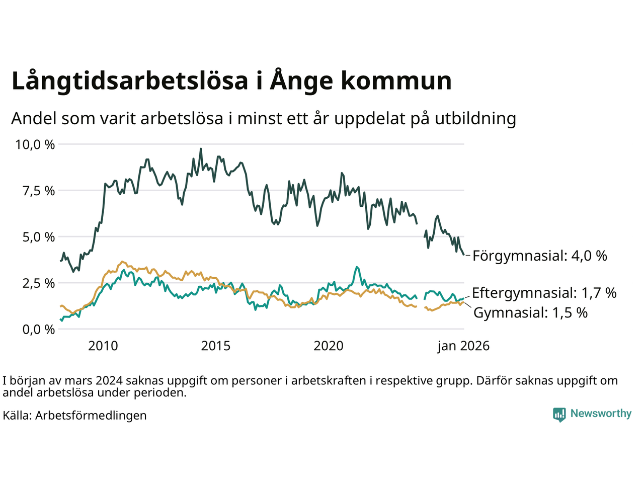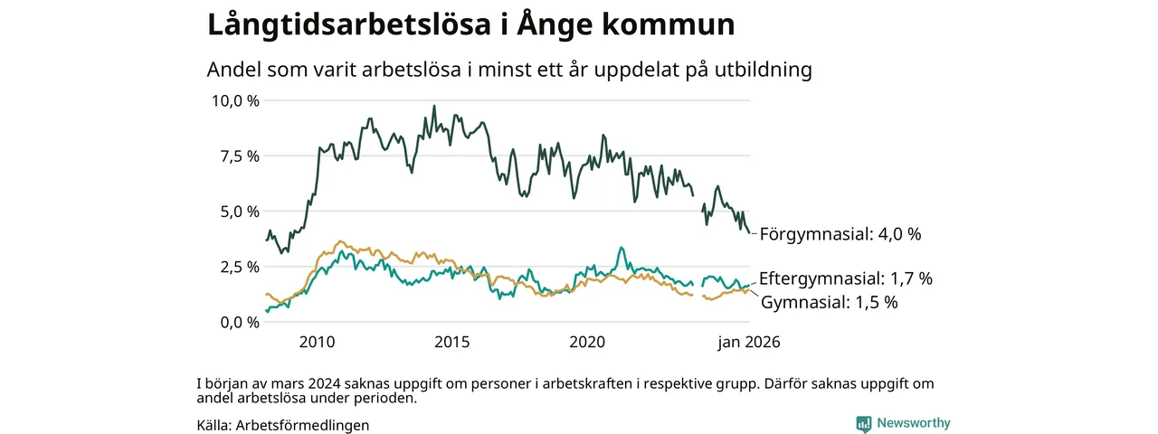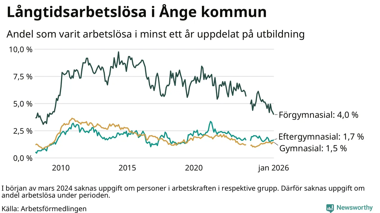 I januari hade 75 Ångebor varit arbetslösa i minst ett år, vilket är en fler än månaden innan. 75 personer motsvarar 1,8 procent av arbetskraften i kommunen – andelen långtidsarbetslösa är ungefär på samma nivå som för ett år sedan.