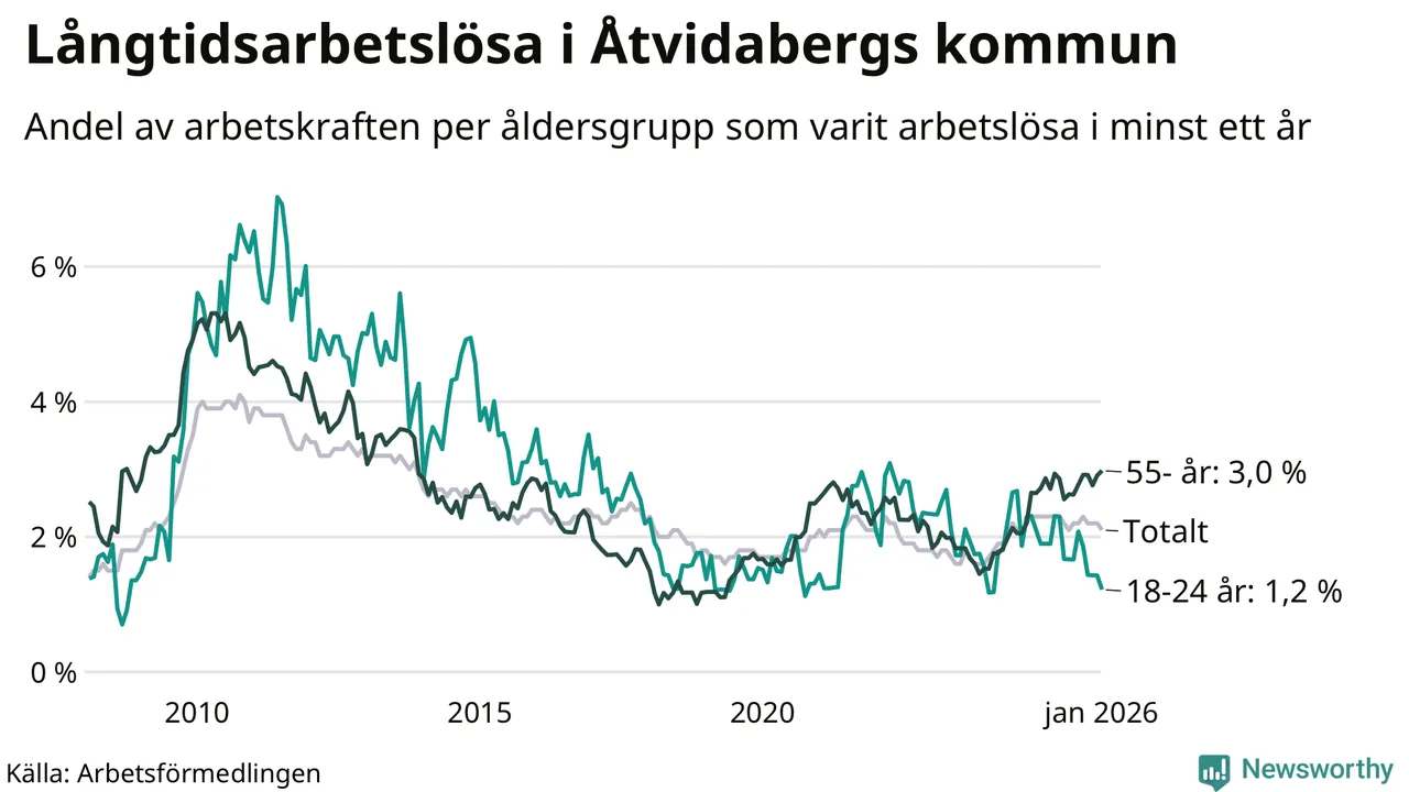 Av de 113 personerna som varit arbetslösa i mer än ett år i Åtvidabergs kommun är 40 personer mellan 55 och 661 år och sex är mellan 18 och 24 år. För den äldre gruppen är andelen arbetslösa 3,0 procent medan den i den yngre gruppen är 1,2 procent. Även i riket som helhet är långtidsarbetslösheten högre i gruppen äldre.