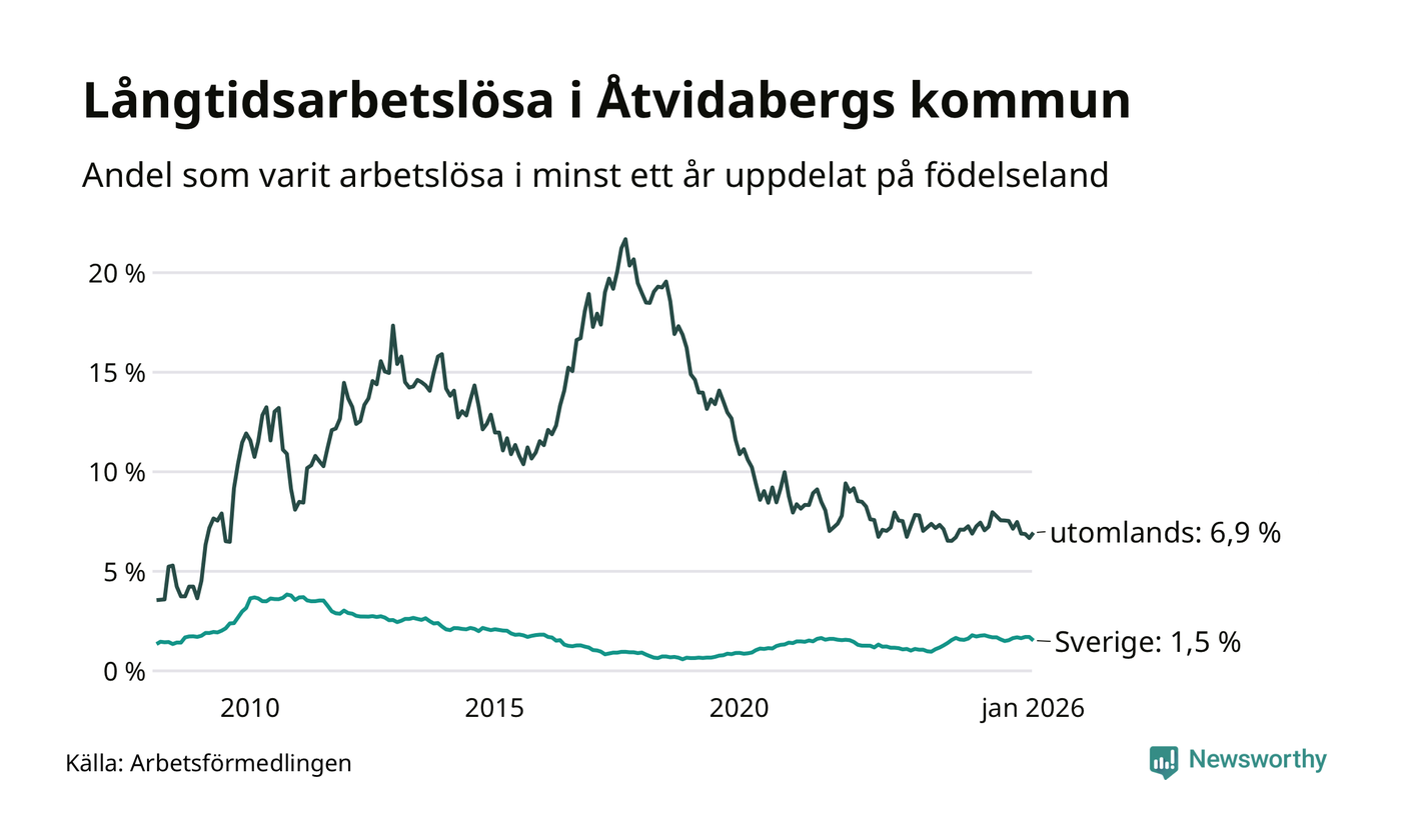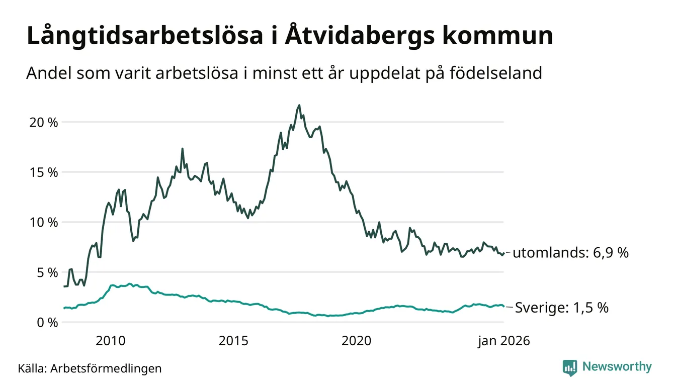 74 av de långtidsarbetslösa i Åtvidaberg är födda i Sverige, medan 39 är födda utomlands. Det innebär att långtidsarbetslösheten bland Sverigefödda är 1,5 procent, medan den är fem gånger så hög – 6,9 procent – bland födda utomlands. Även i riket som helhet är arbetslösheten högre bland utrikesfödda.