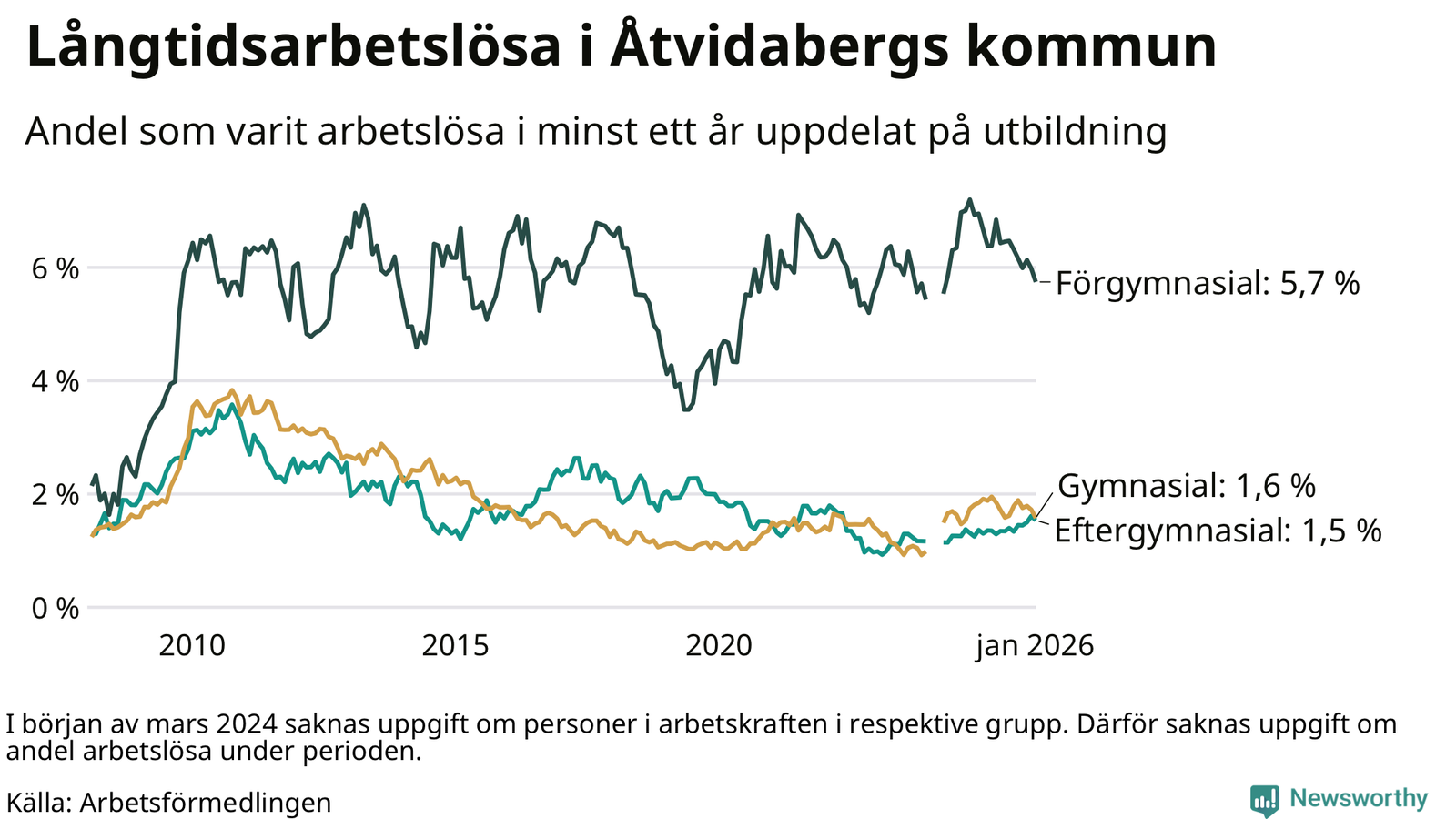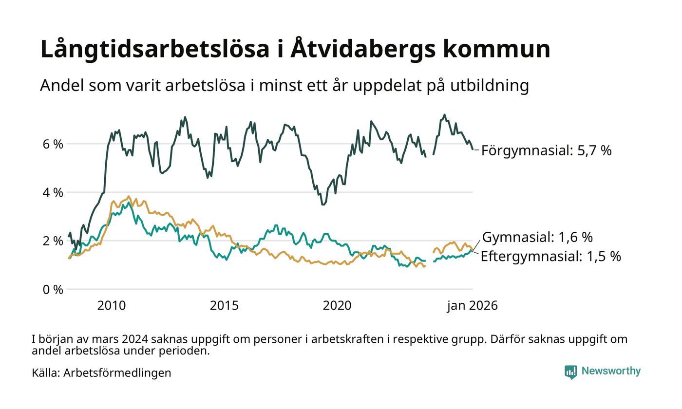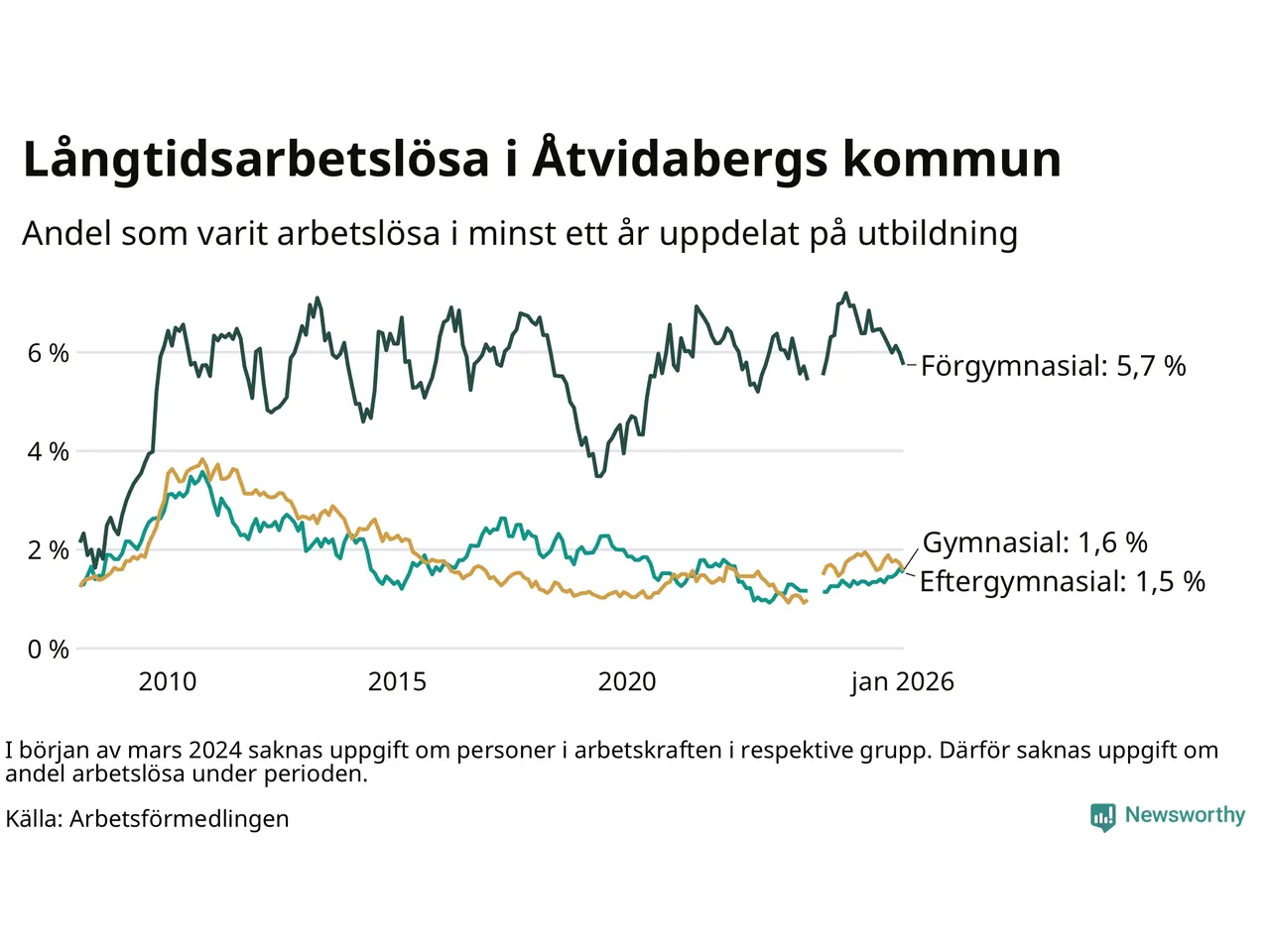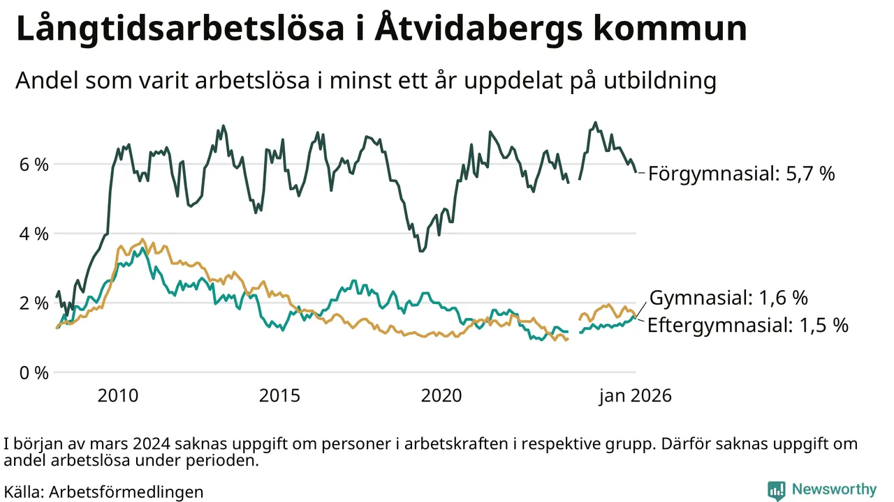 Graf: Andel arbetslösa i Åtvidaberg som varit utan arbete i minst 12 månader