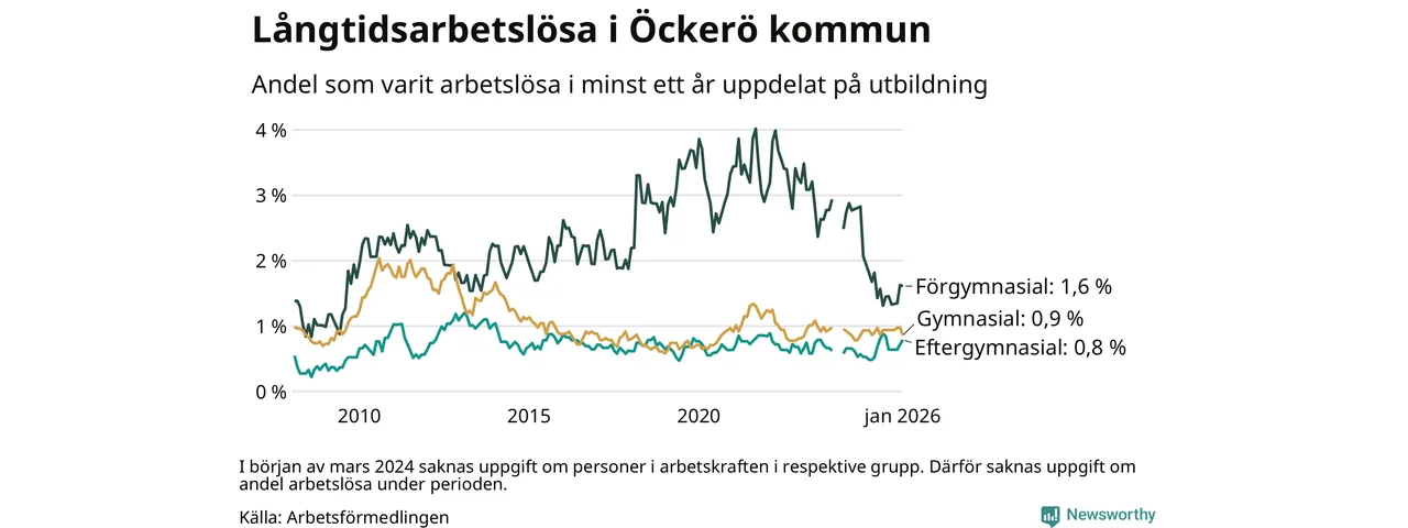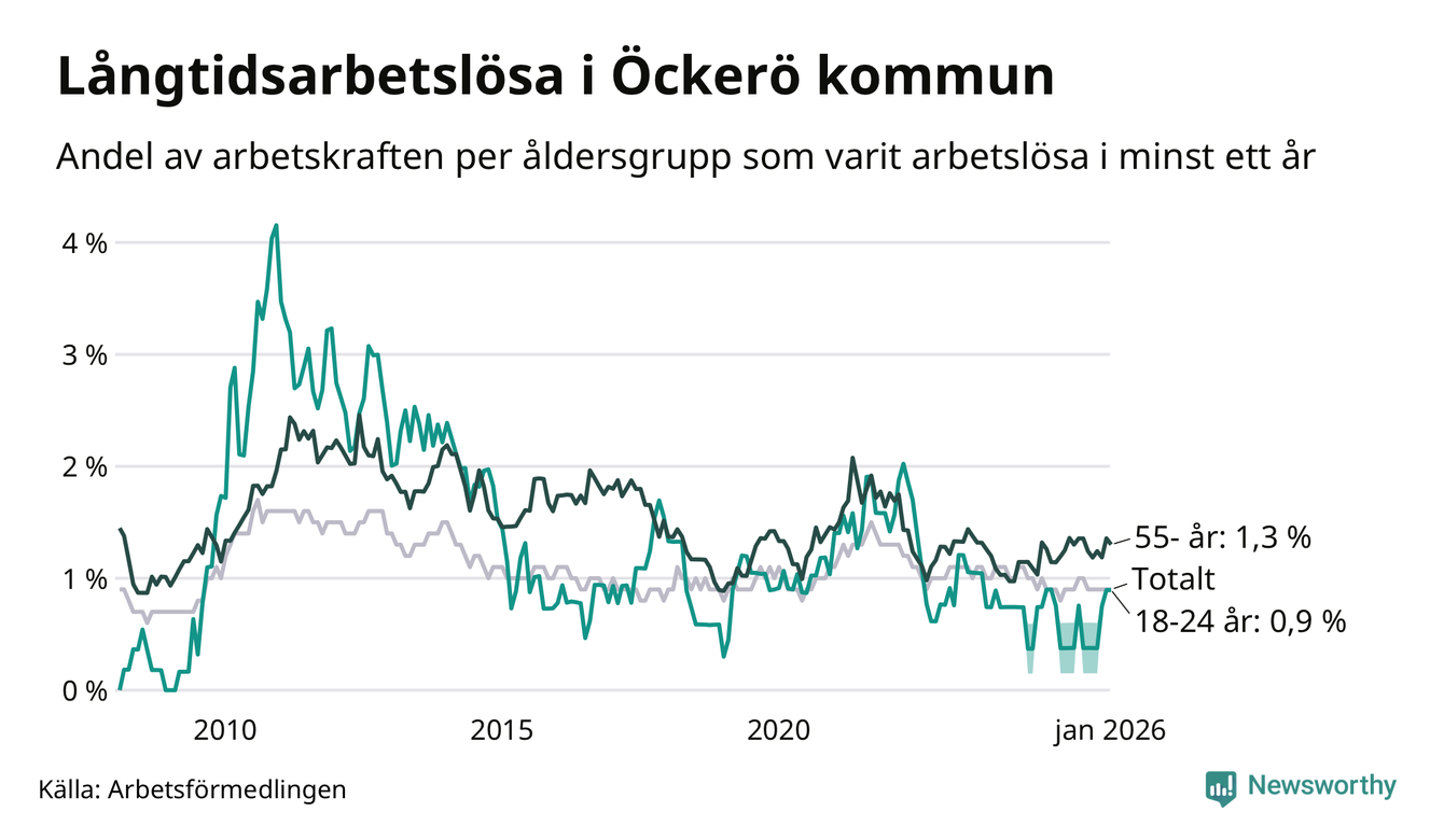 | Andel arbetslösa i minst två år | 0,4 % | 1,3 % | 1,6 % |