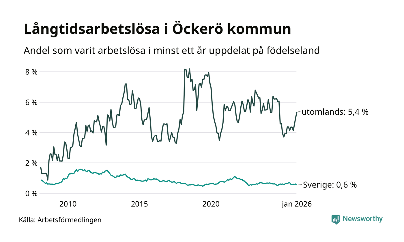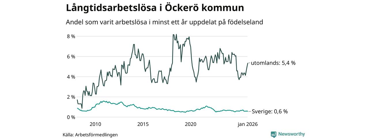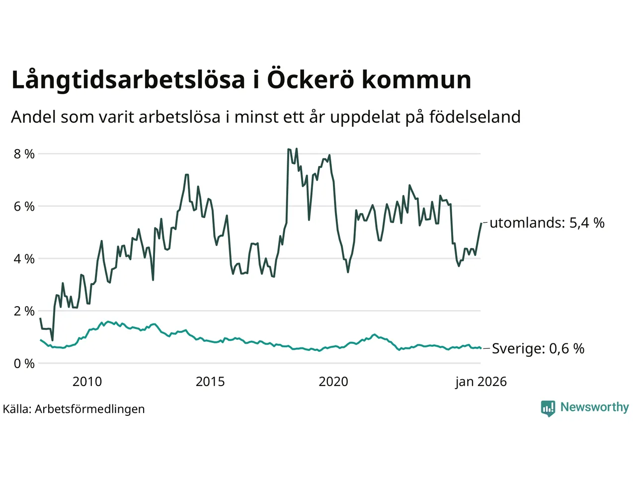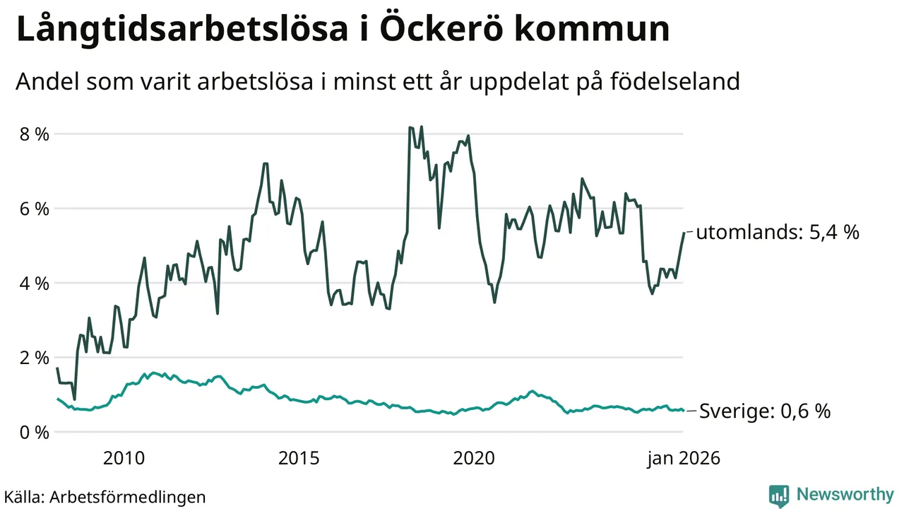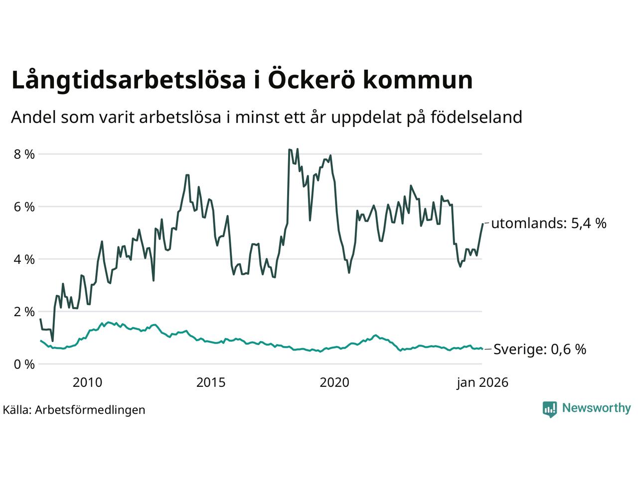 31 av de långtidsarbetslösa på Öckerö är födda i Sverige, medan 25 är födda utomlands. Det innebär att långtidsarbetslösheten bland Sverigefödda är 0,6 procent, medan den är nio gånger så hög – 5,4 procent – bland födda utomlands. Även i riket som helhet är arbetslösheten högre bland utrikesfödda.