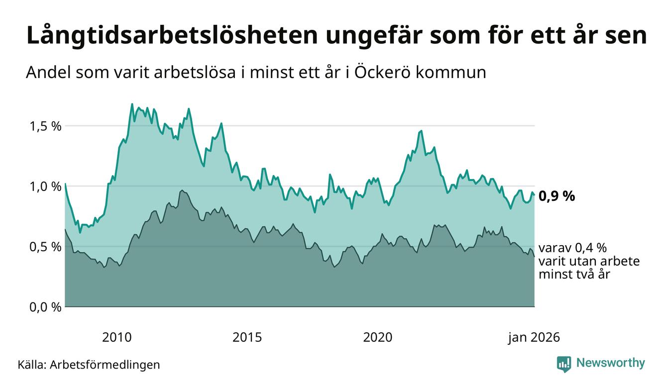 I januari hade 56 Öckeröbor varit arbetslösa i minst ett år, vilket är en färre än månaden innan. 56 personer motsvarar 0,9 procent av arbetskraften i kommunen – andelen långtidsarbetslösa är ungefär på samma nivå som för ett år sedan. Öckerö tillhör de kommuner som har lägst andel långtidsarbetslösa i hela landet just nu.
