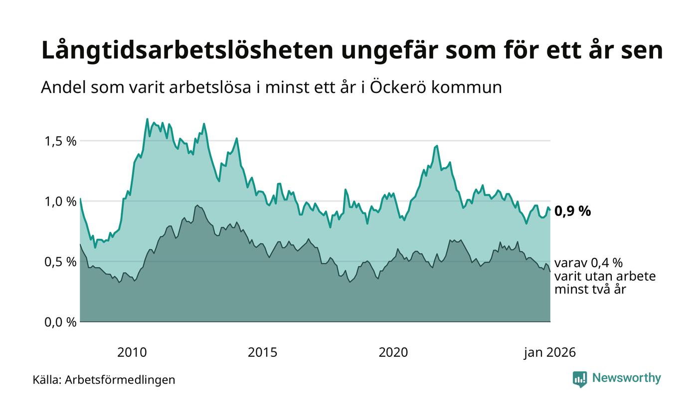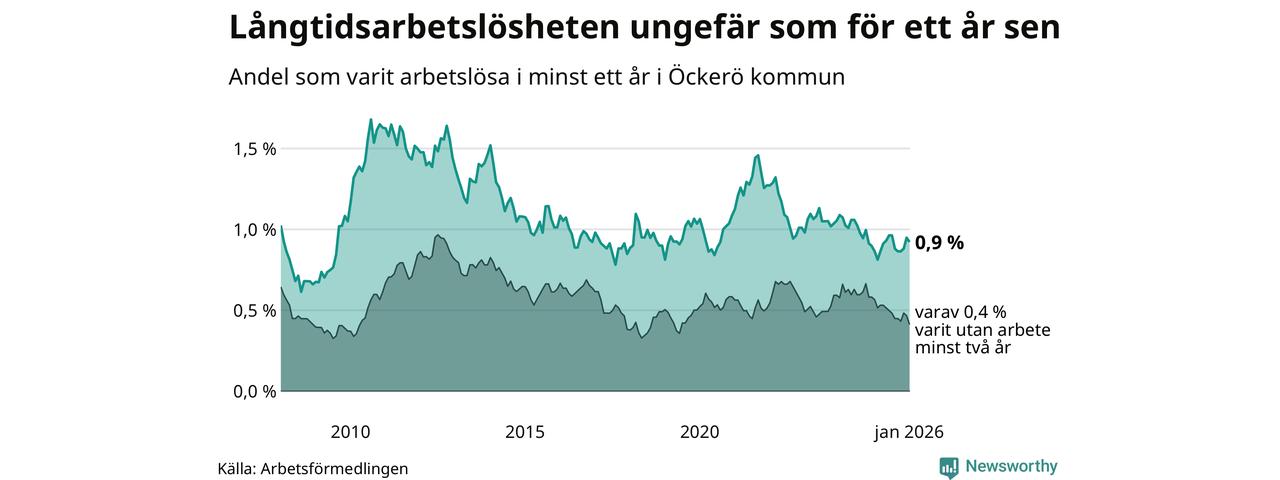 Andelen som varit utan arbete i minst ett år på Öckerö var ungefär lika stor i januari jämfört med samma månad för ett år sedan. Det visar Arbetsfömedlingens senaste månadsstatistik.