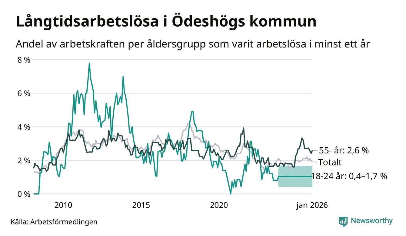 Av de 47 personerna som varit arbetslösa i mer än ett år i Ödeshögs kommun är 16 personer mellan 55 och 661 år och mellan en och fyra är mellan 18 och 24 år. För den äldre gruppen är andelen arbetslösa 2,6 procent medan den i den yngre gruppen är mellan 0,4 och 1,7 procent. Även i riket som helhet är långtidsarbetslösheten högre i gruppen äldre.