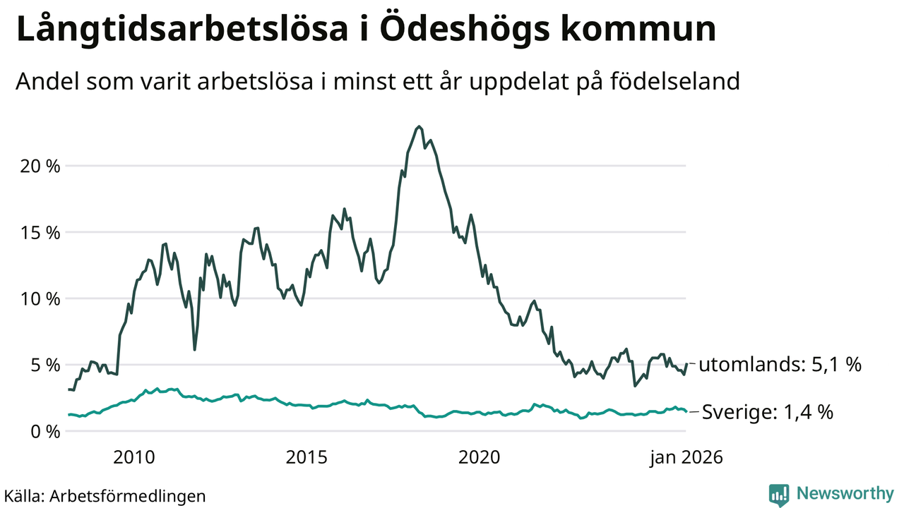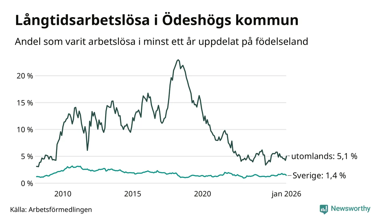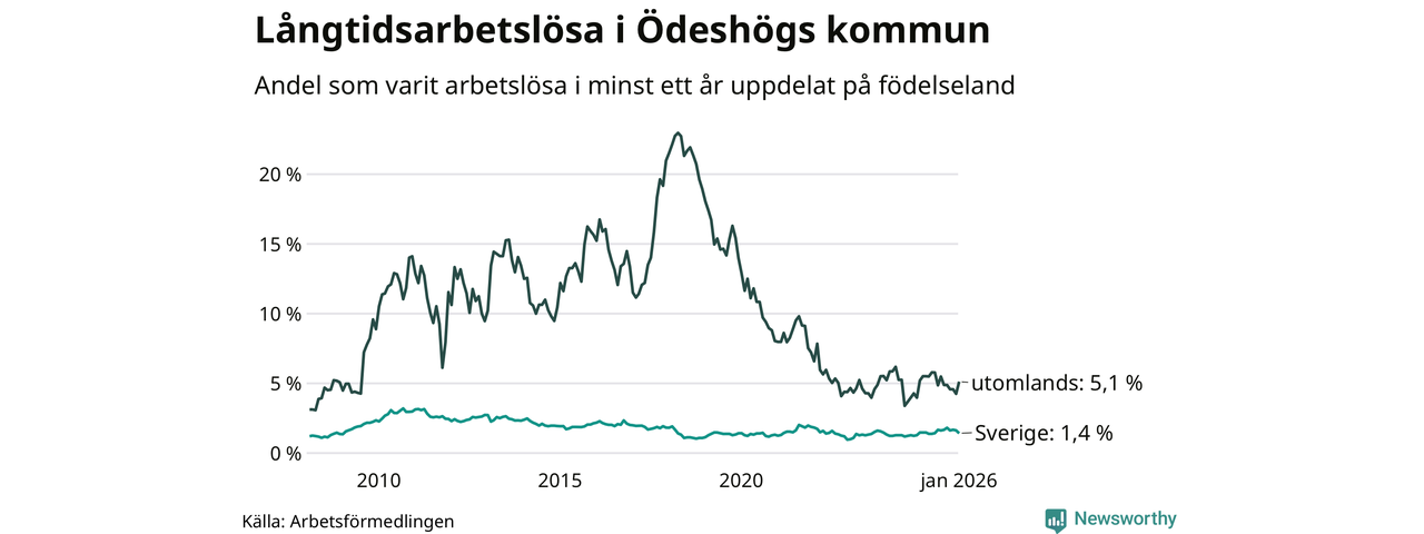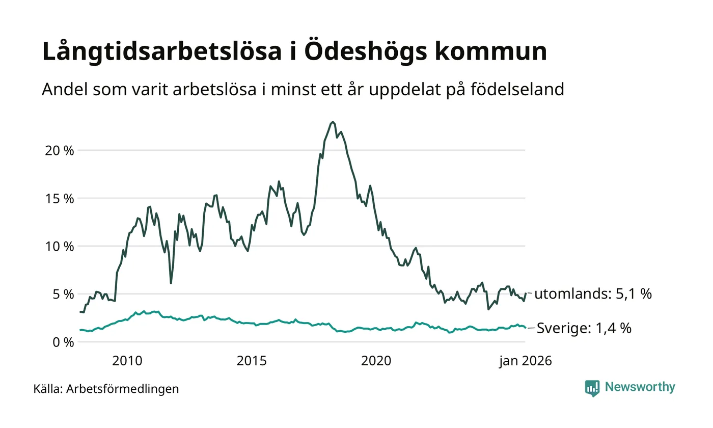 30 av de långtidsarbetslösa i Ödeshög är födda i Sverige, medan 17 är födda utomlands. Det innebär att långtidsarbetslösheten bland Sverigefödda är 1,4 procent, medan den är fyra gånger så hög – 5,1 procent – bland födda utomlands. Även i riket som helhet är arbetslösheten högre bland utrikesfödda.