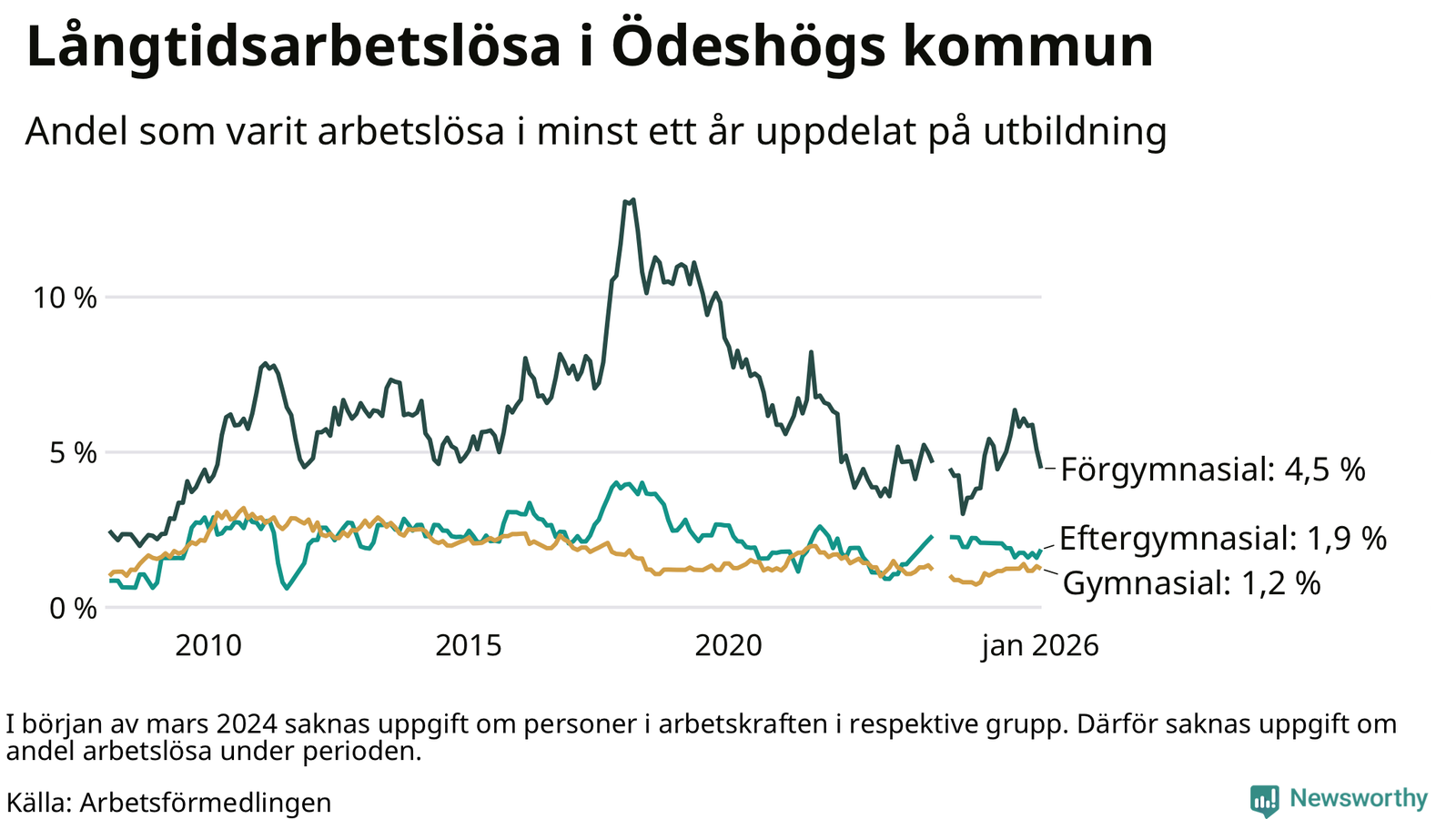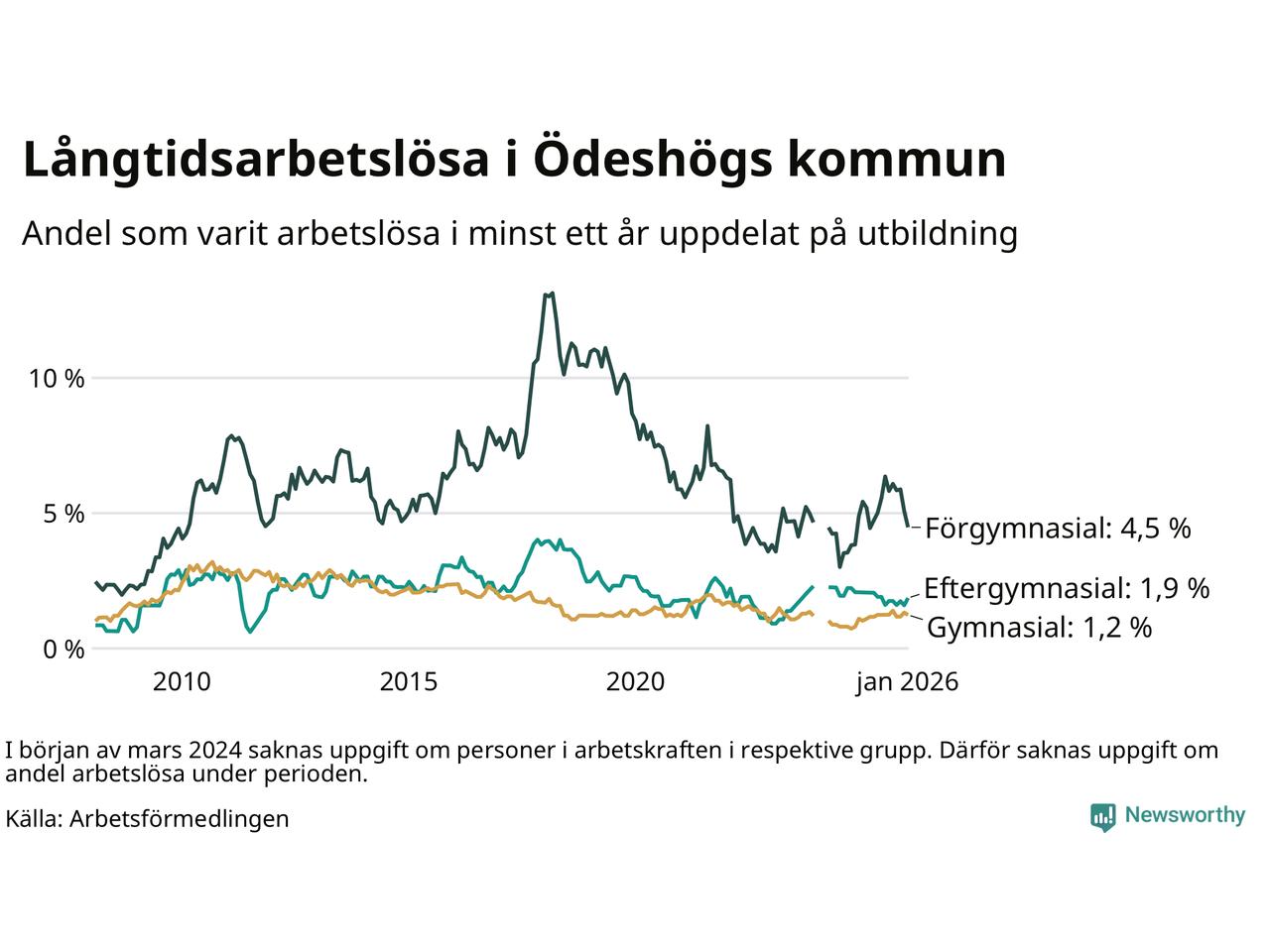 Graf: Andel arbetslösa i Ödeshög som varit utan arbete i minst 12 månader