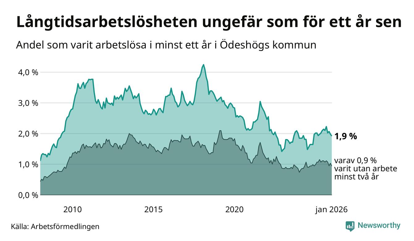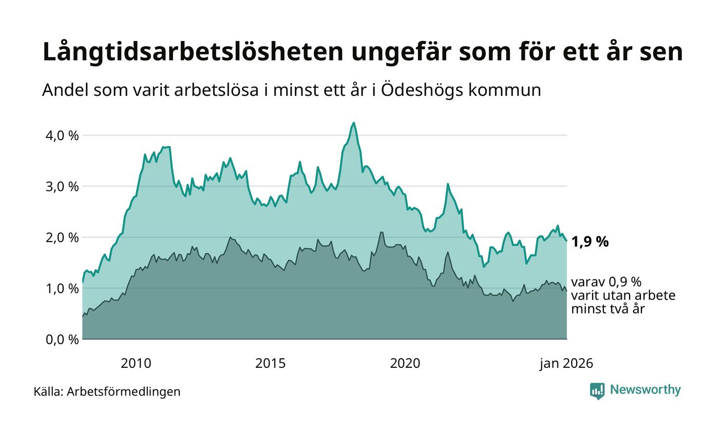 I januari hade 47 Ödeshögsbor varit arbetslösa i minst ett år, vilket är en färre än månaden innan. 47 personer motsvarar 1,9 procent av arbetskraften i kommunen – andelen långtidsarbetslösa är ungefär på samma nivå som för ett år sedan.