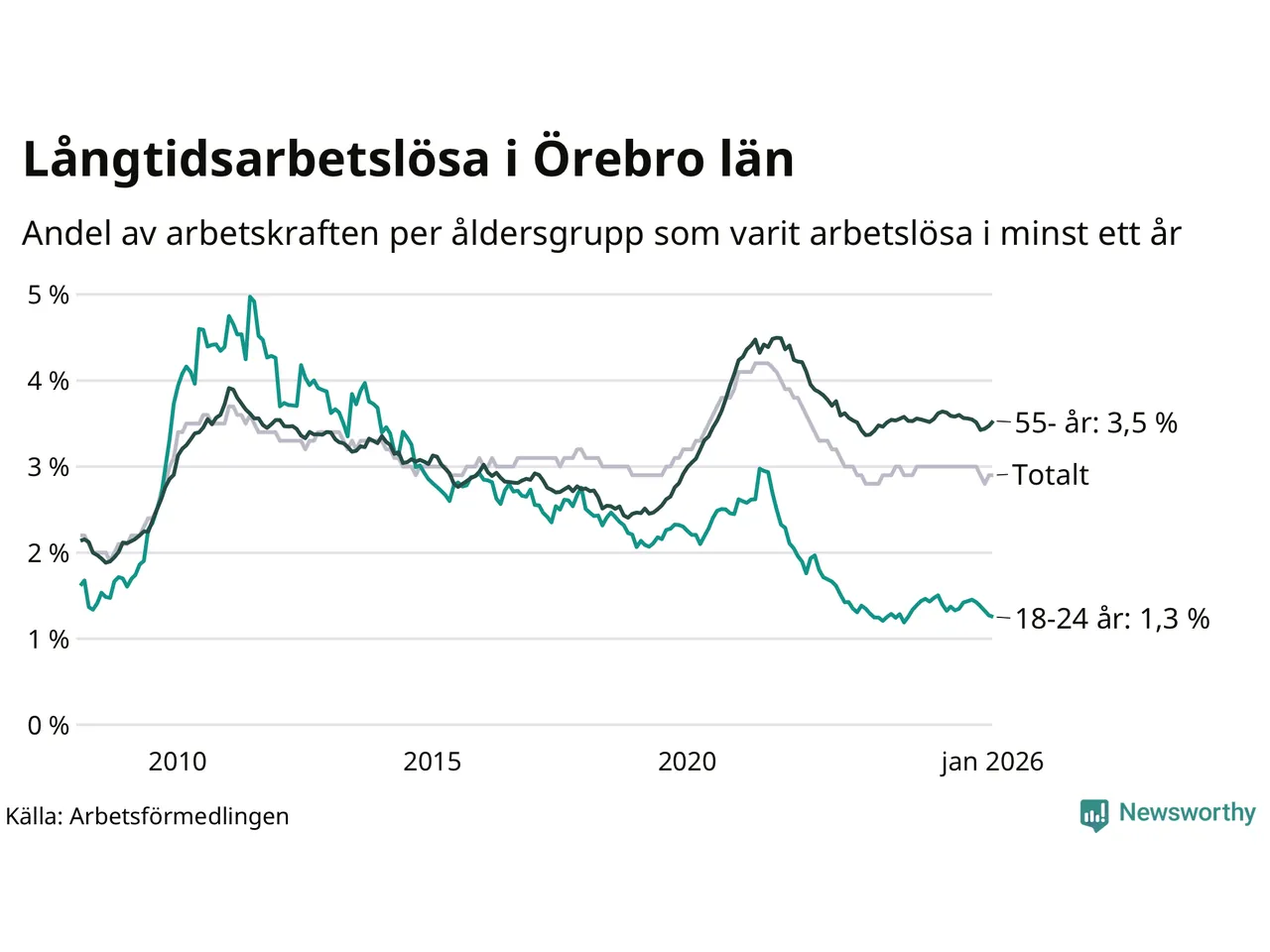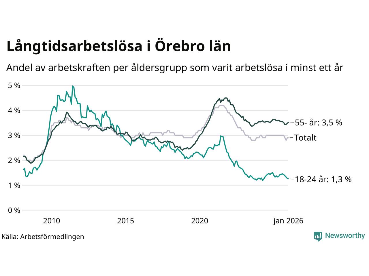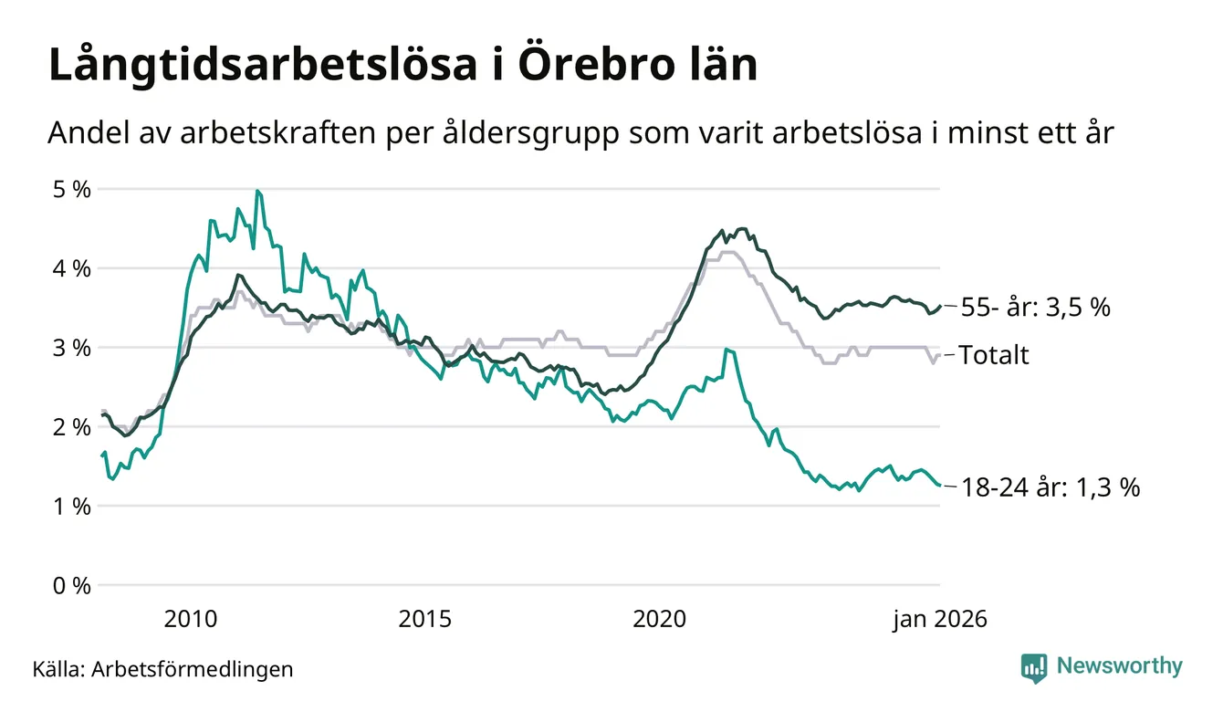 Av de 4 385 personerna som varit arbetslösa i mer än ett år i Örebro län är 1 146 personer mellan 55 och 661 år och mellan 215 och 215 är mellan 18 och 24 år. För den äldre gruppen är andelen arbetslösa 3,5 procent medan den i den yngre gruppen är 1,3 procent. Även i riket som helhet är långtidsarbetslösheten högre i gruppen äldre.
