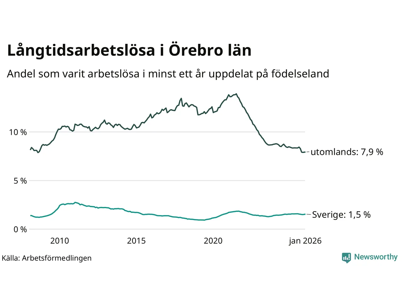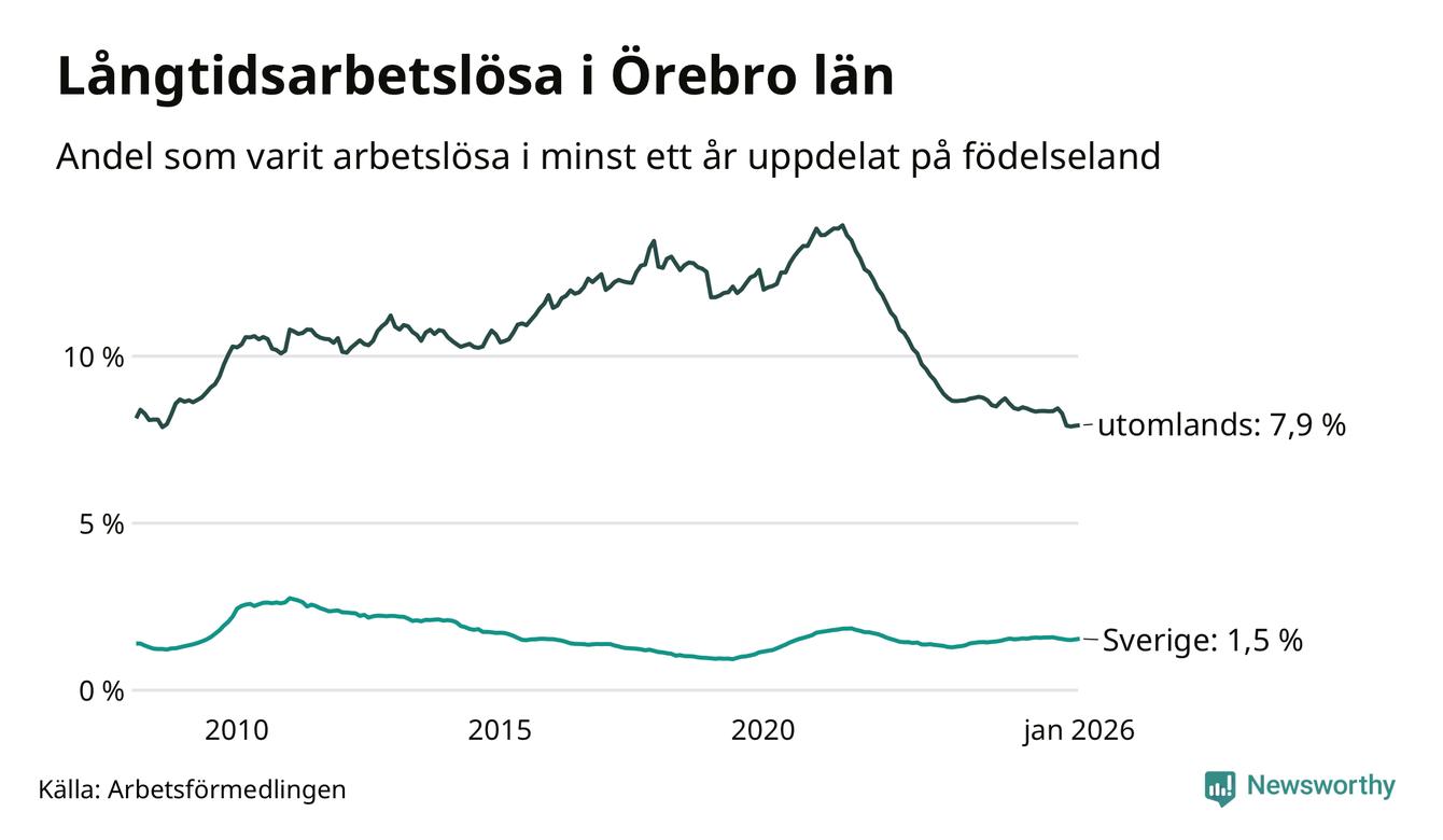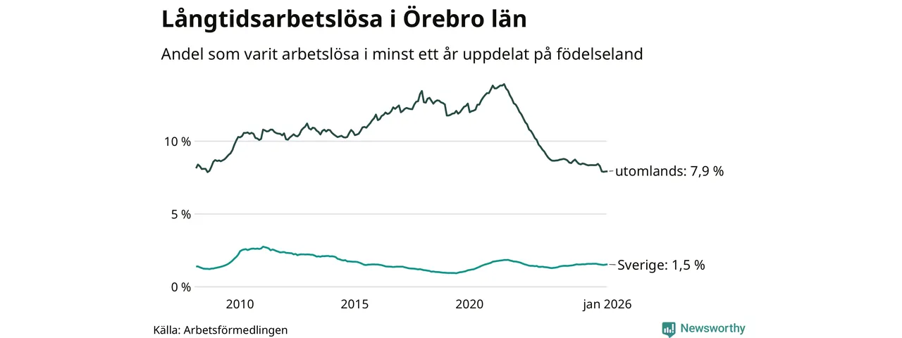 1 848 av de långtidsarbetslösa i Örebro län är födda i Sverige och mellan 2 538 och 2 541 är födda utomlands. Det innebär att långtidsarbetslösheten bland Sverigefödda är 1,5 procent, medan den ligger på 7,9 procent för utlandsfödda.