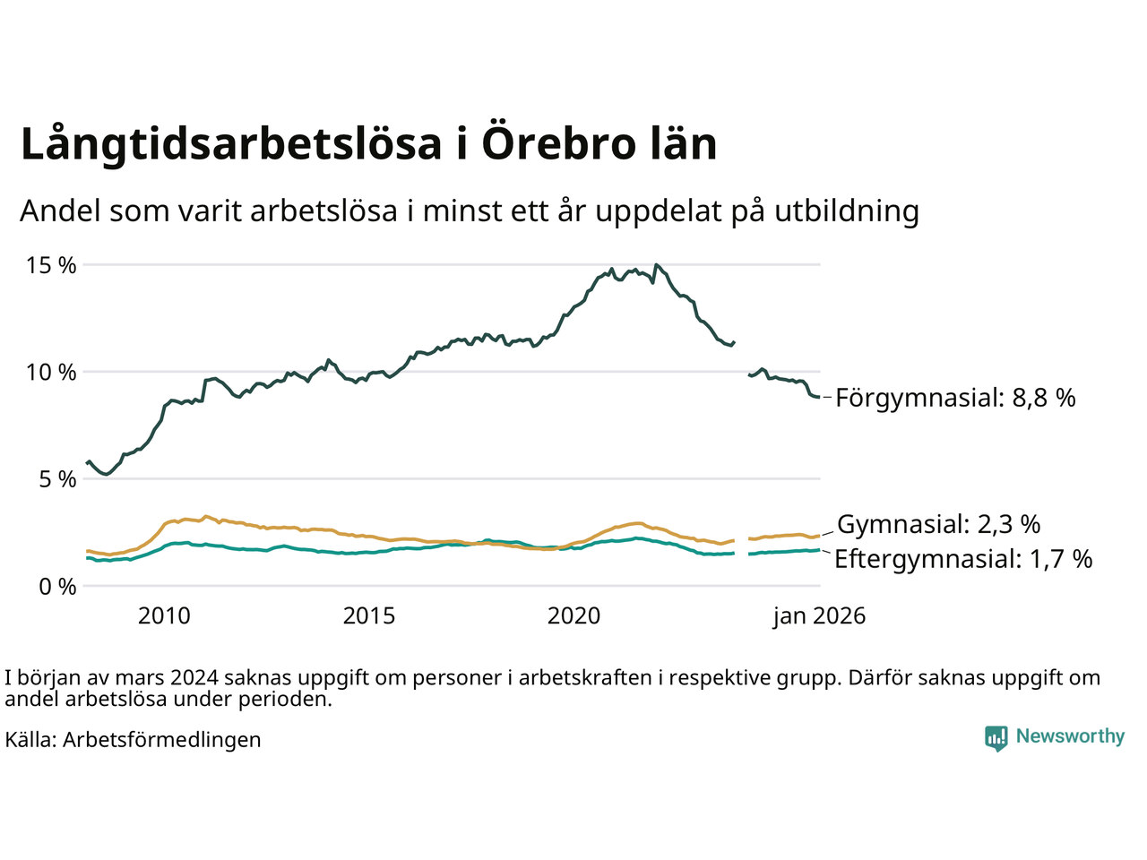 Graf: Andel arbetslösa i Örebro län som varit utan arbete i minst 12 månader
