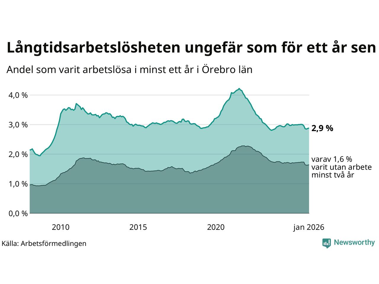 I januari hade 4 385 Örebrobor varit arbetslösa i minst ett år, vilket är 55 fler än månaden innan. 4 385 personer motsvarar 2,9 procent av arbetskraften i länet – andelen långtidsarbetslösa är ungefär på samma nivå som för ett år sedan.