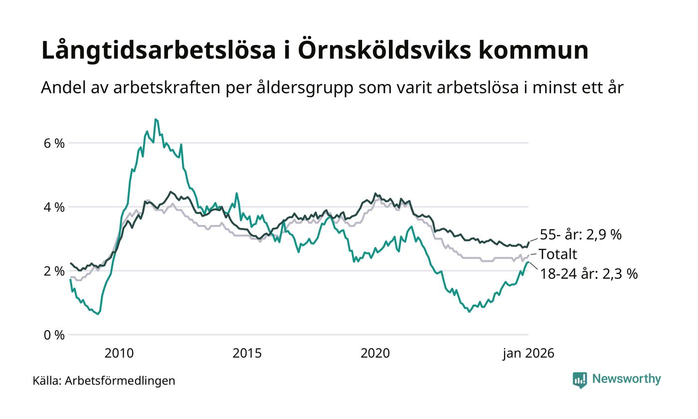 Av de 657 personerna som varit arbetslösa i mer än ett år i Örnsköldsviks kommun är 182 personer mellan 55 och 661 år och 60 är mellan 18 och 24 år. För den äldre gruppen är andelen arbetslösa 2,9 procent medan den i den yngre gruppen är 2,3 procent. Även i riket som helhet är långtidsarbetslösheten högre i gruppen äldre.