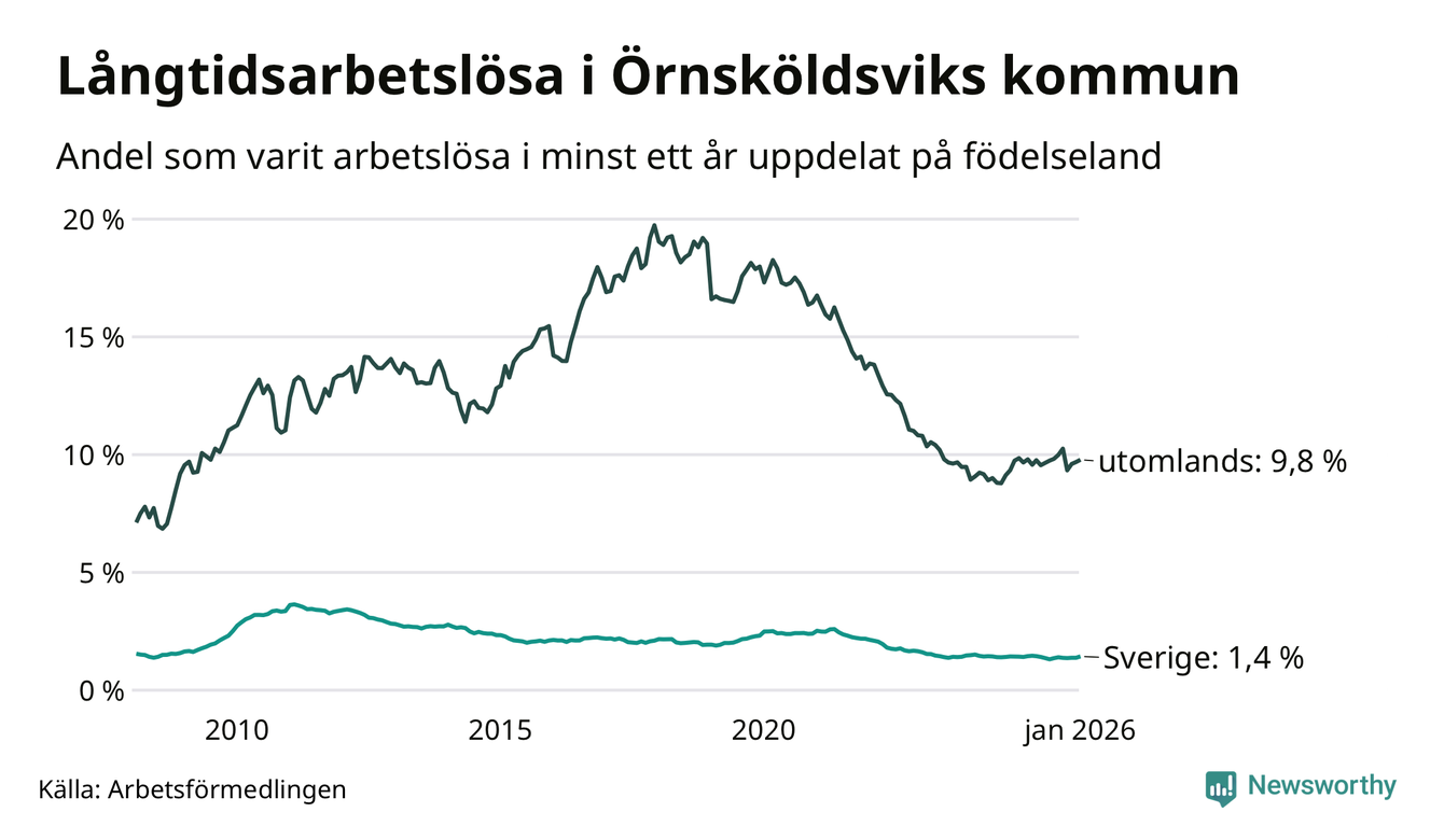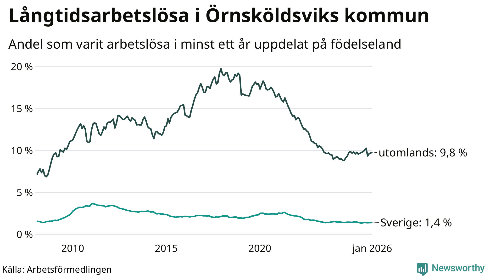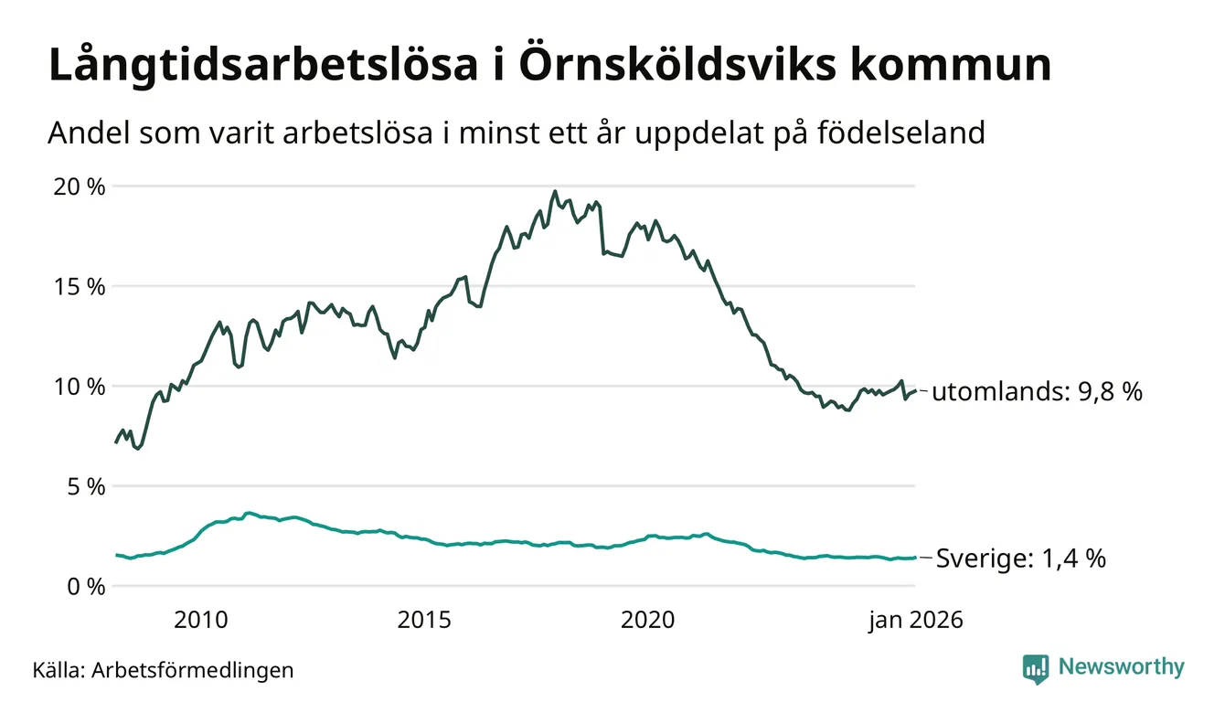 338 av de långtidsarbetslösa i Örnsköldsvik är födda i Sverige, medan 319 är födda utomlands. Det innebär att långtidsarbetslösheten bland Sverigefödda är 1,4 procent, medan den är sju gånger så hög – 9,8 procent – bland födda utomlands. Även i riket som helhet är arbetslösheten högre bland utrikesfödda.