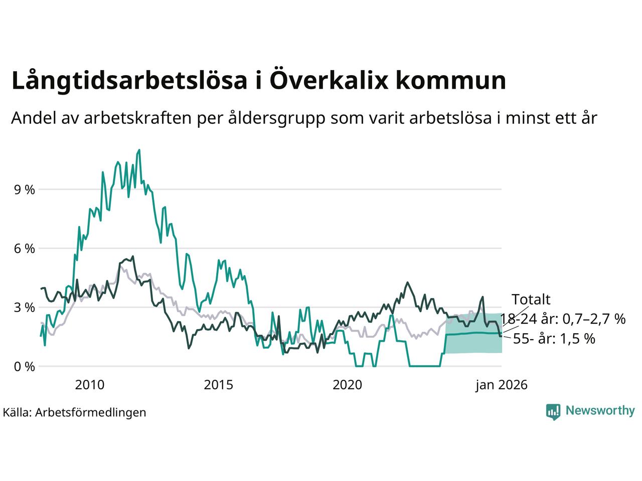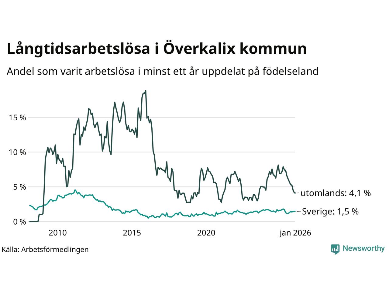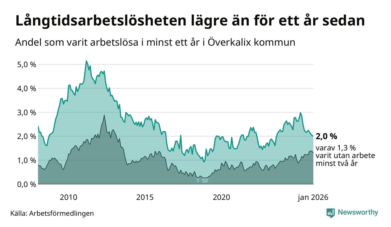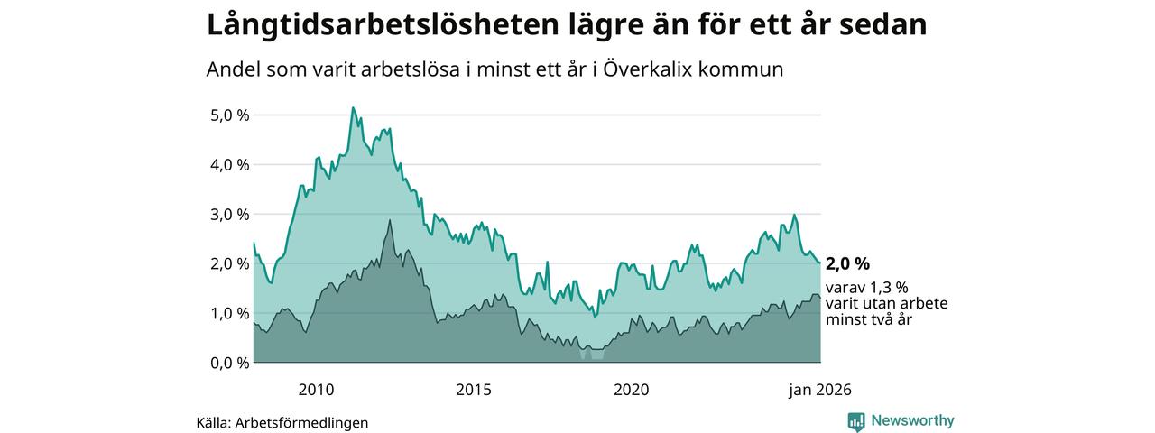 I januari hade 28 Överkalixbor varit arbetslösa i minst ett år, vilket är lika många som månaden innan. Det är den fjärde månaden i rad med minskande eller oförändrat antal långtidsarbetslösa. 28 personer motsvarar 2,0 procent av arbetskraften i kommunen – andelen långtidsarbetslösa är 0,6 procentenheter lägre än samma månad för ett år sedan.