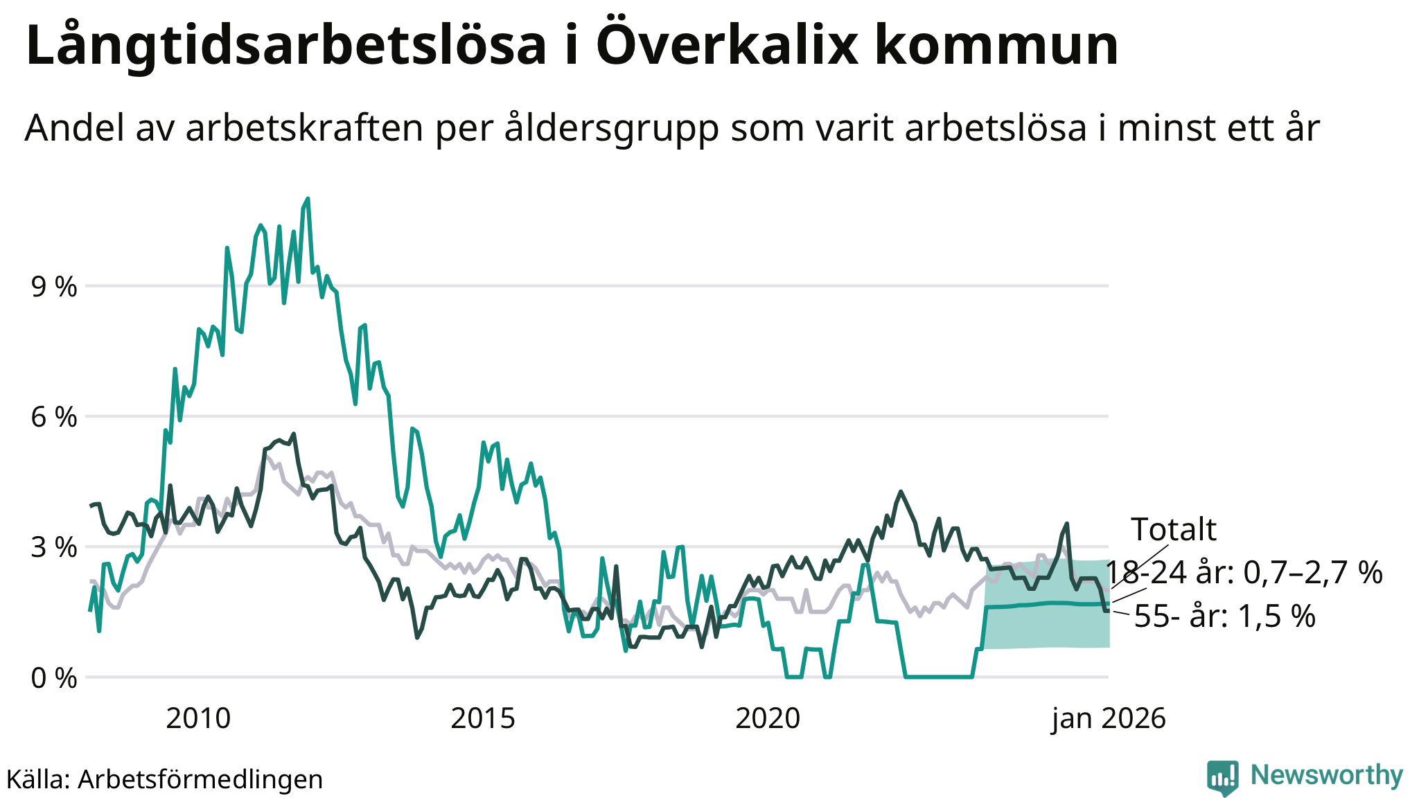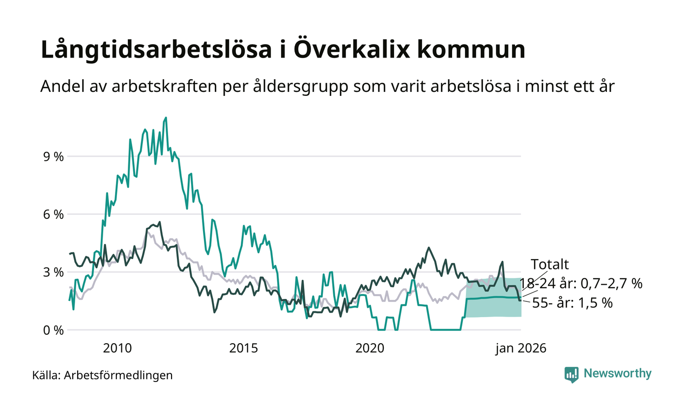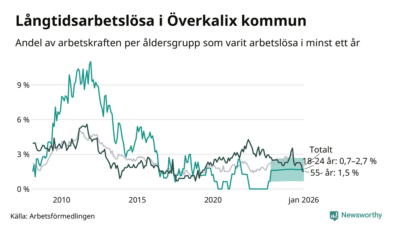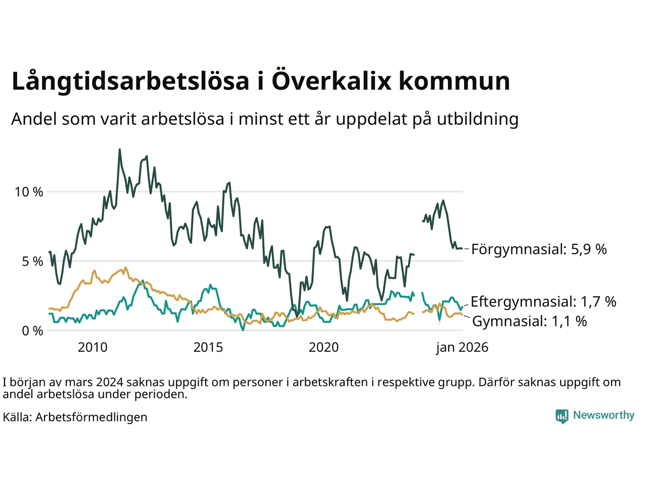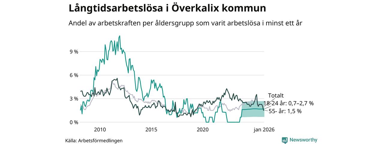 I januari hade 28 Överkalixbor varit arbetslösa i minst ett år, vilket är lika många som månaden innan. Det är den fjärde månaden i rad med minskande eller oförändrat antal långtidsarbetslösa. 28 personer motsvarar 2,0 procent av arbetskraften i kommunen – andelen långtidsarbetslösa är 0,6 procentenheter lägre än samma månad för ett år sedan.