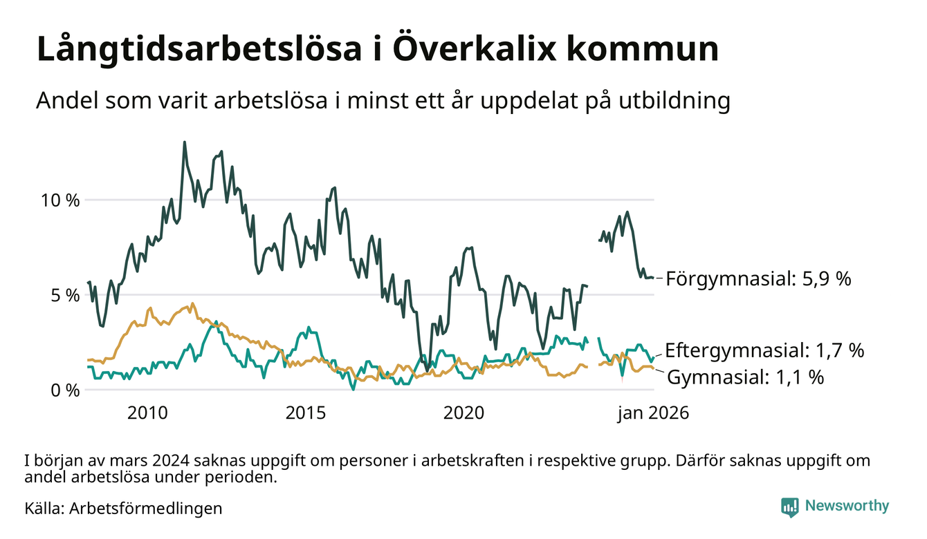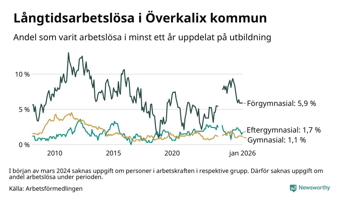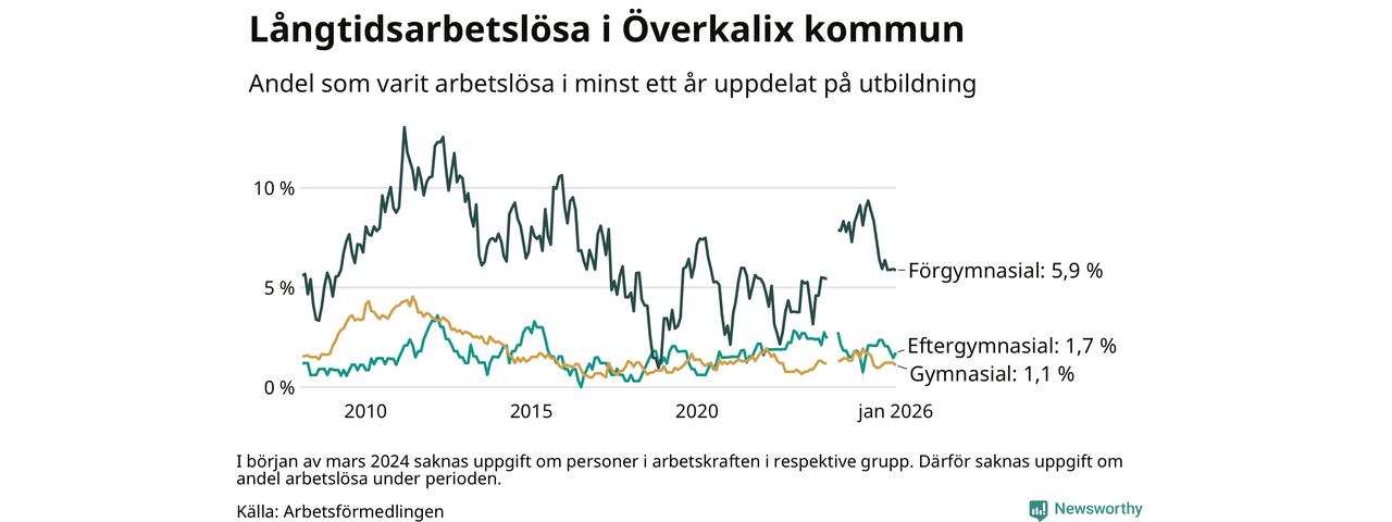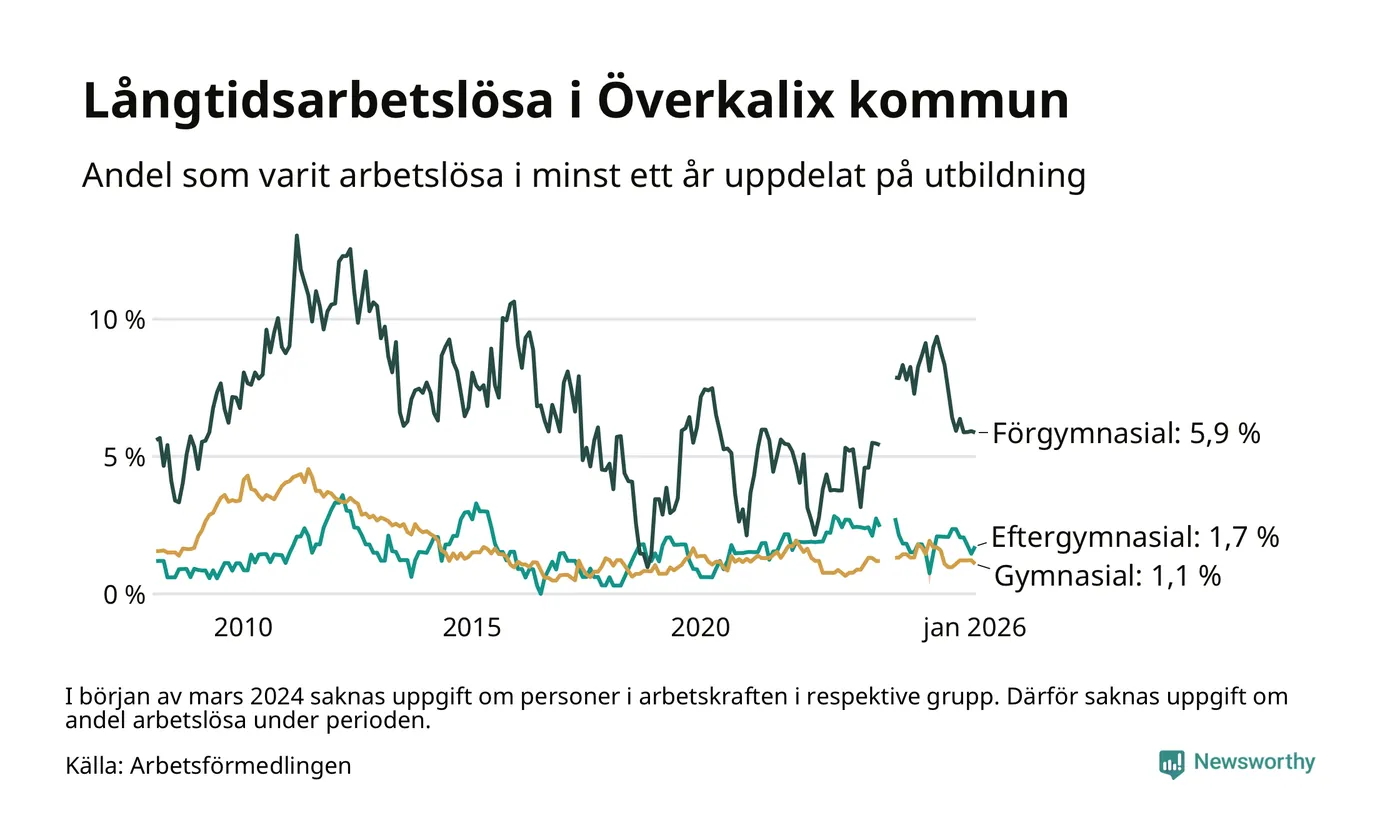 I januari hade 28 Överkalixbor varit arbetslösa i minst ett år, vilket är lika många som månaden innan. Det är den fjärde månaden i rad med minskande eller oförändrat antal långtidsarbetslösa. 28 personer motsvarar 2,0 procent av arbetskraften i kommunen – andelen långtidsarbetslösa är 0,6 procentenheter lägre än samma månad för ett år sedan.
