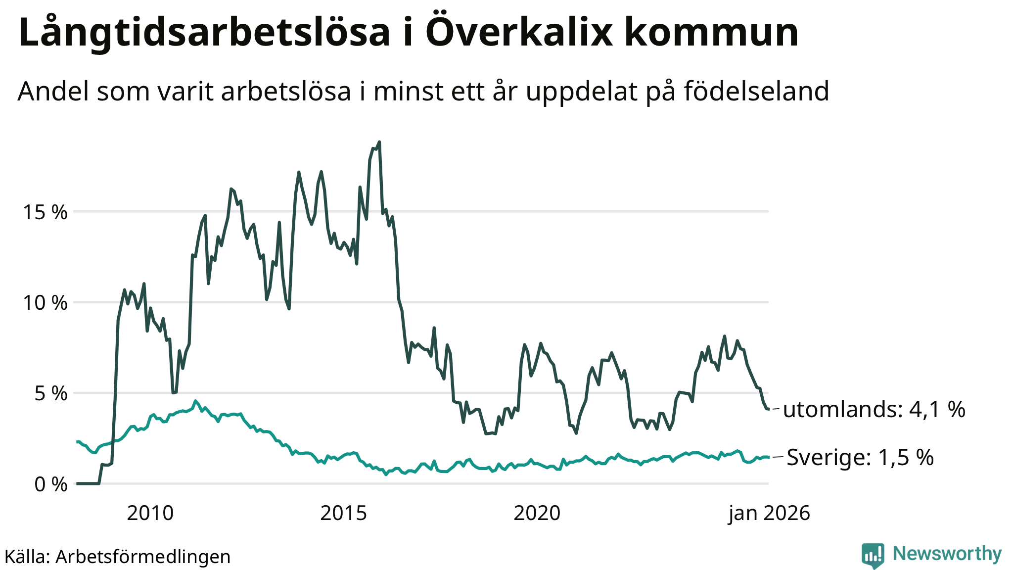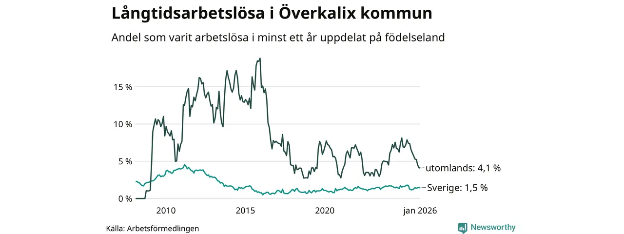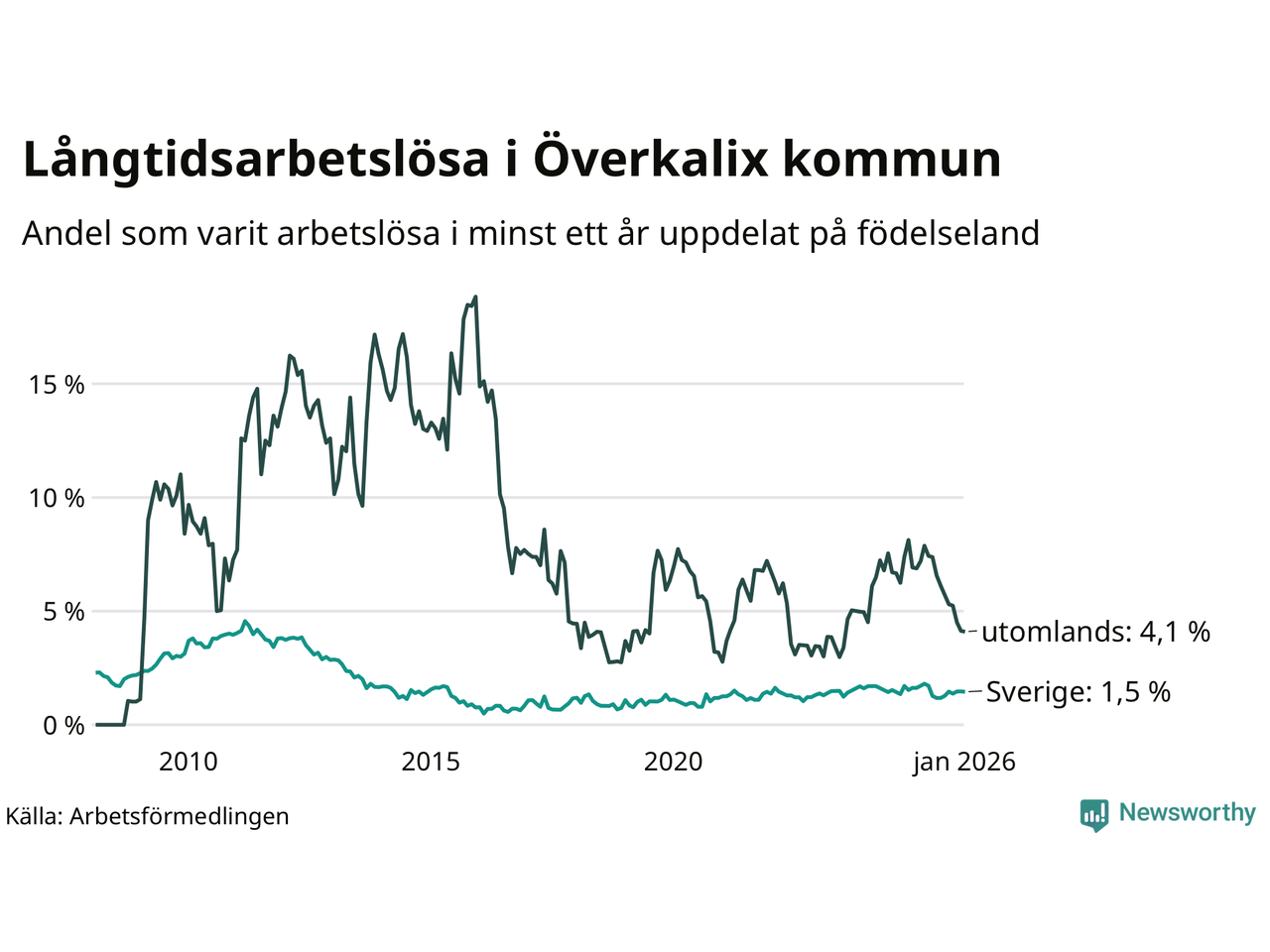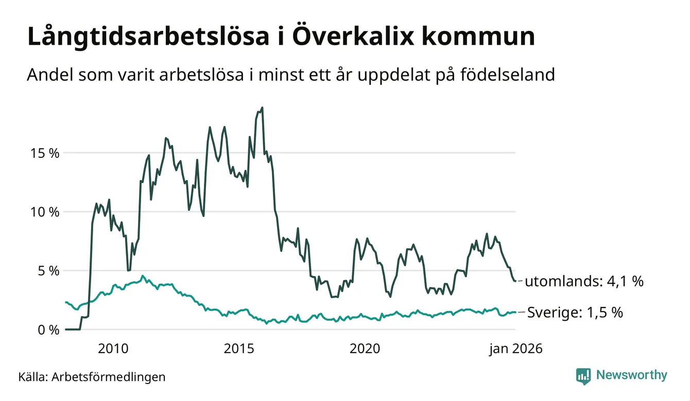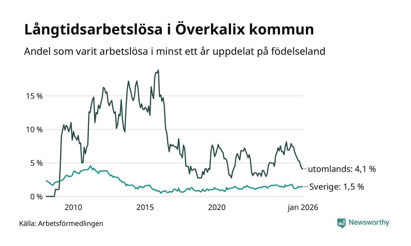 16 av de långtidsarbetslösa i Överkalix är födda i Sverige, medan tolv är födda utomlands. Det innebär att långtidsarbetslösheten bland Sverigefödda är 1,5 procent, medan den är tre gånger så hög – 4,1 procent – bland födda utomlands. Även i riket som helhet är arbetslösheten högre bland utrikesfödda.