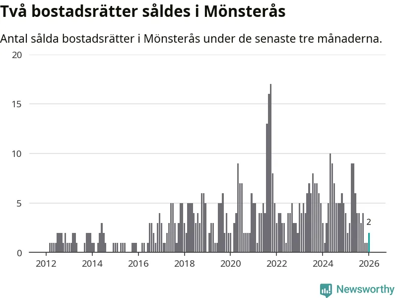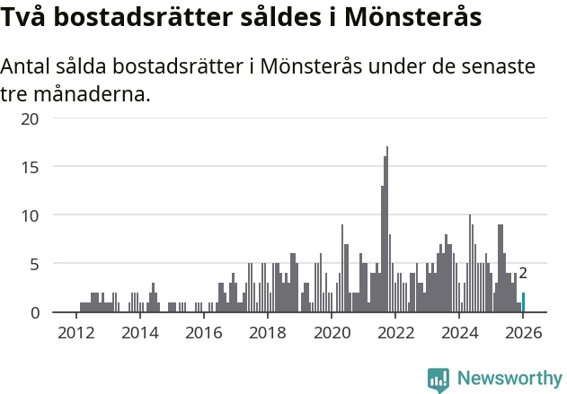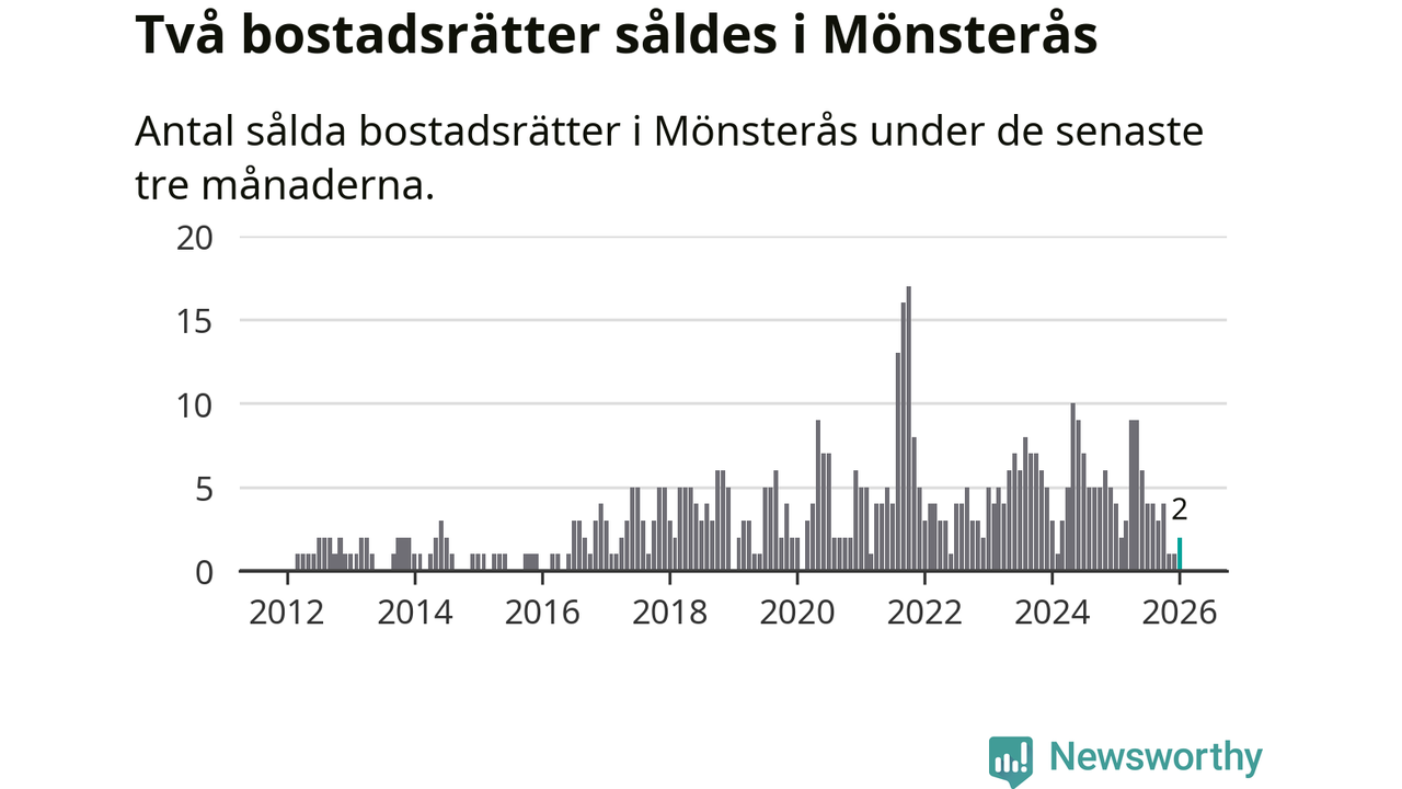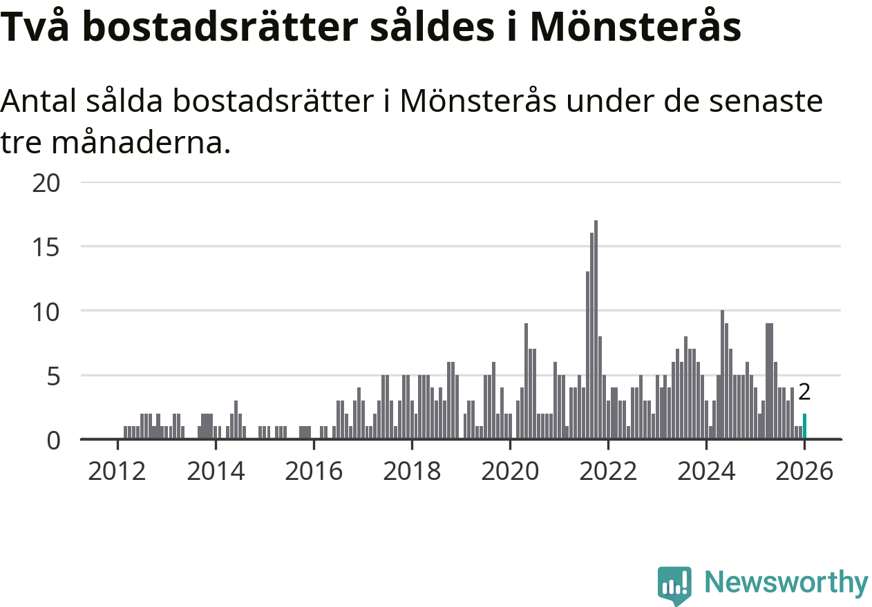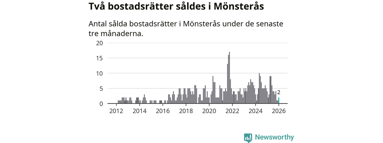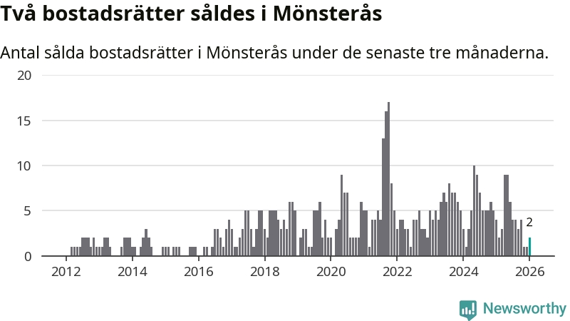 Mellan november och januari gjordes sammanlagt två affärer med bostadsrätter i Mönsterås kommun. Det kan jämföras med fyra vid motsvarande tid i fjol.