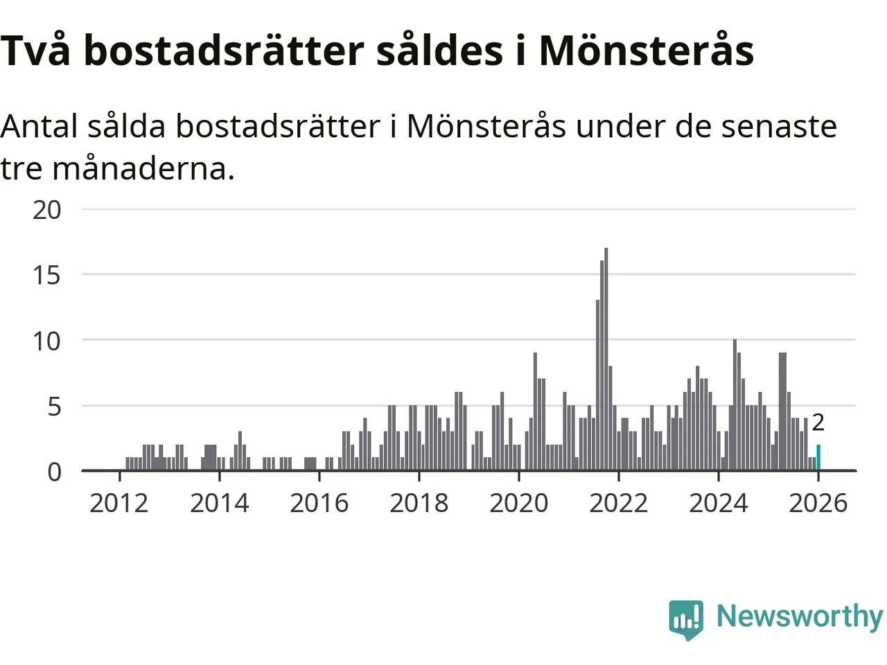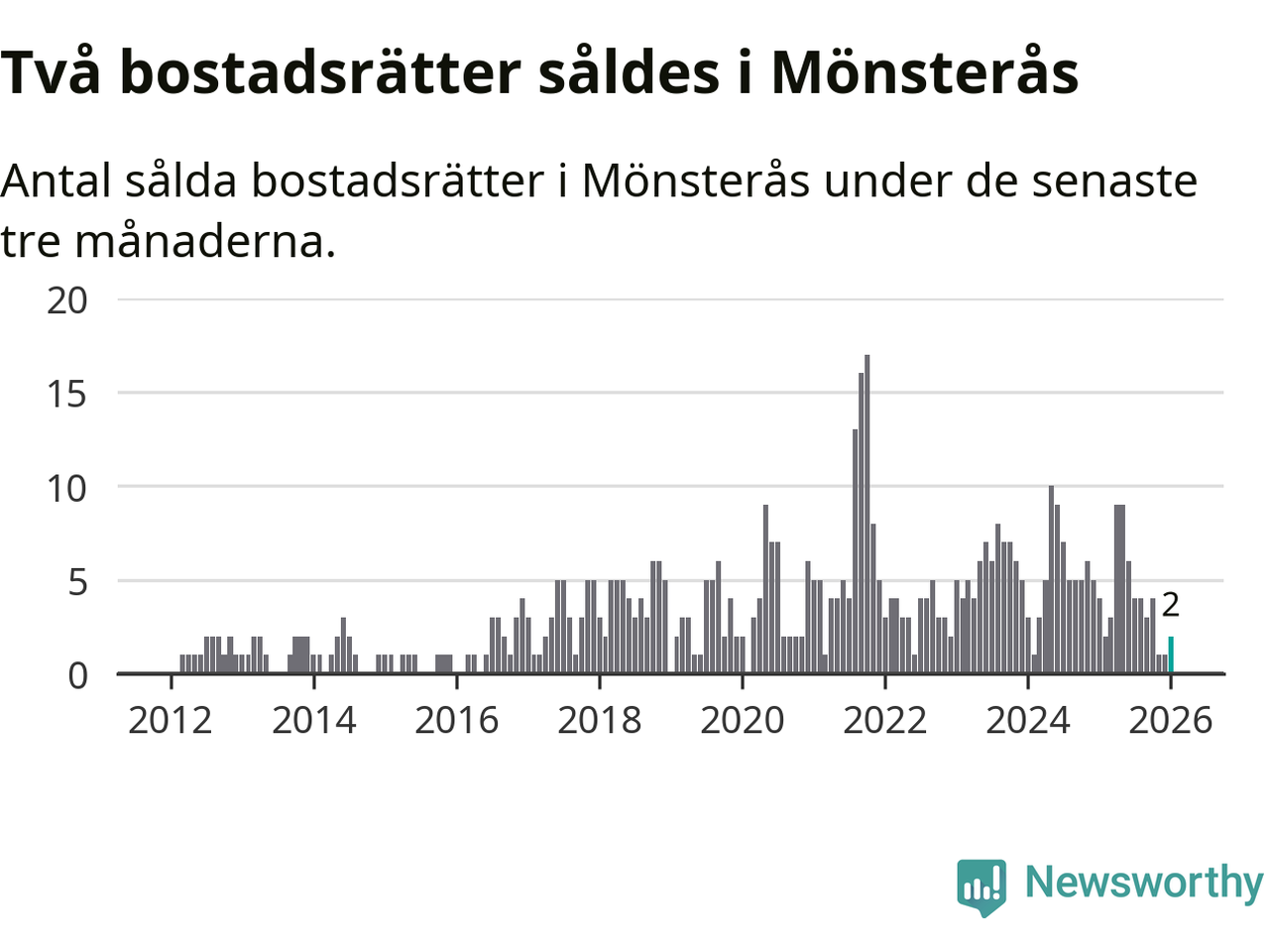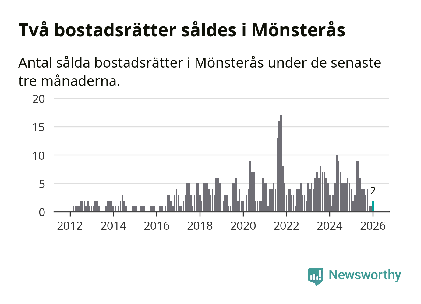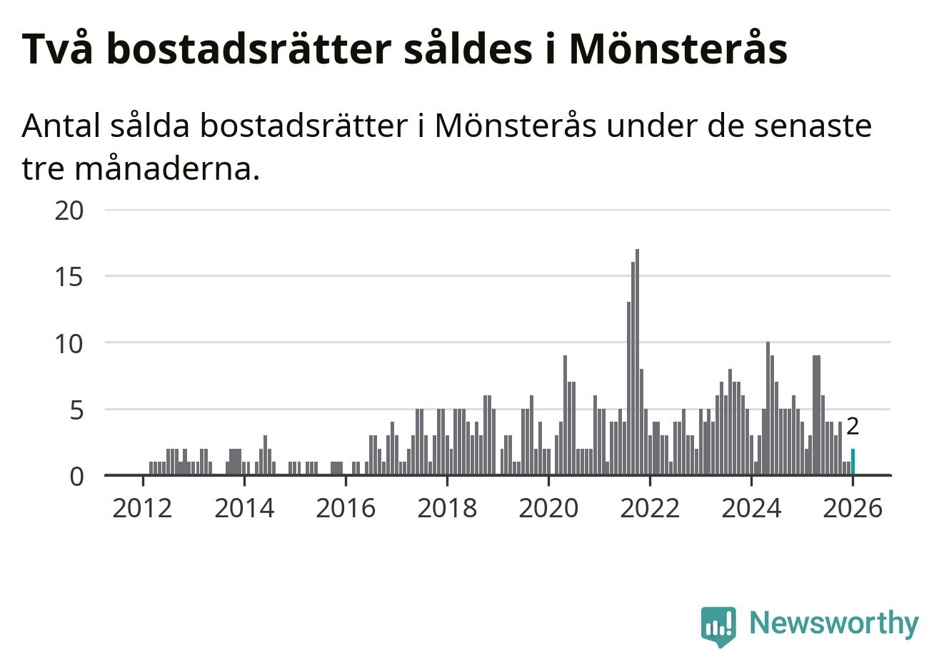 Mellan november och januari gjordes sammanlagt två affärer med bostadsrätter i Mönsterås kommun. Det kan jämföras med fyra vid motsvarande tid i fjol.