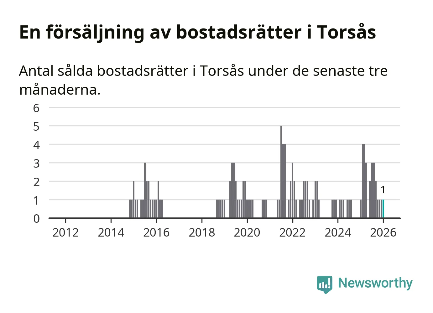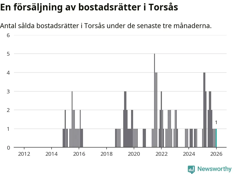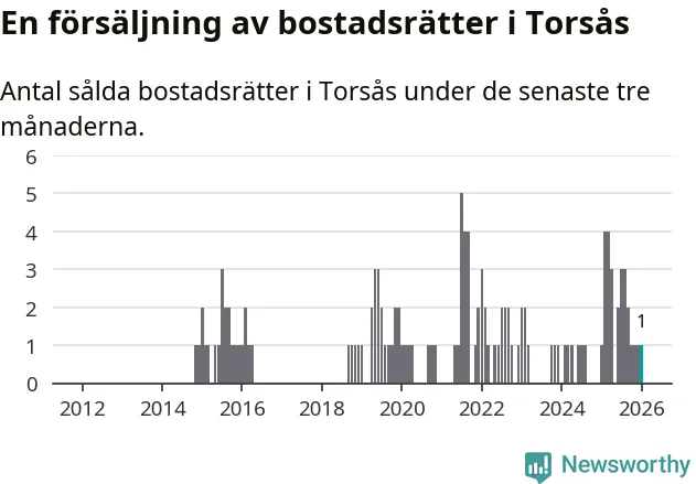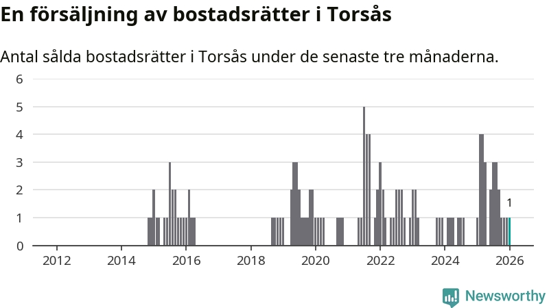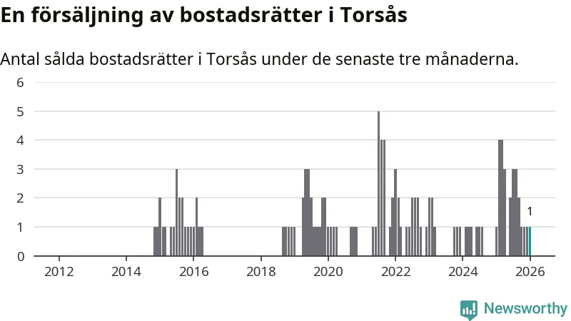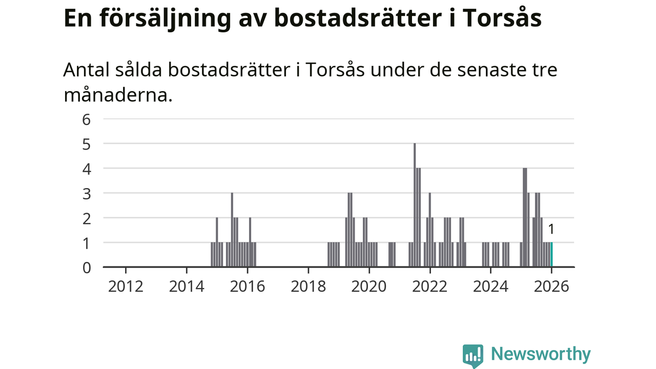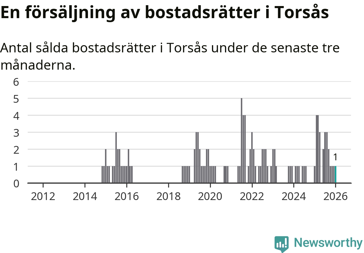 Mellan november och januari gjordes sammanlagt en affär med bostadsrätter i Torsås kommun. Det är lika många affärer som vid motsvarande tid i fjol.