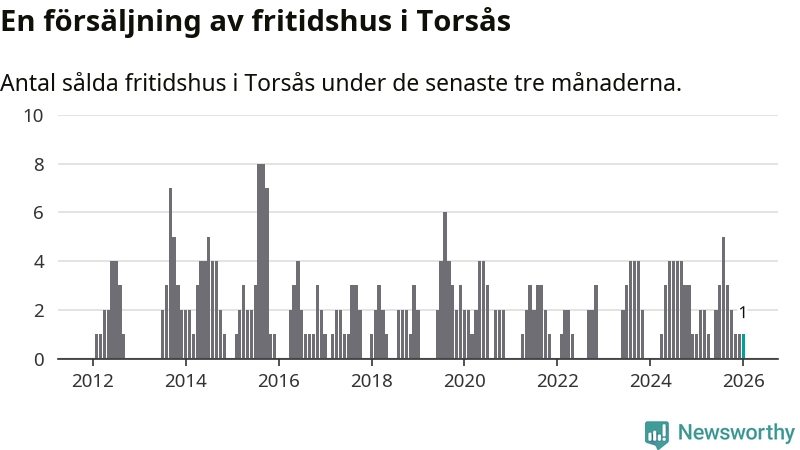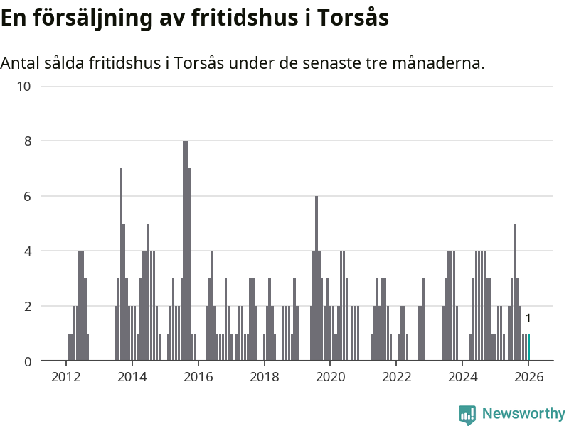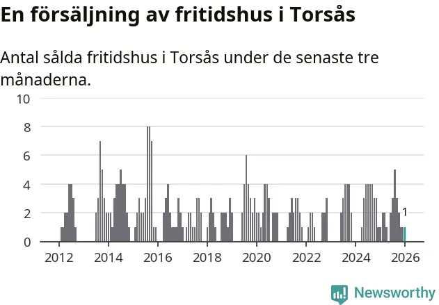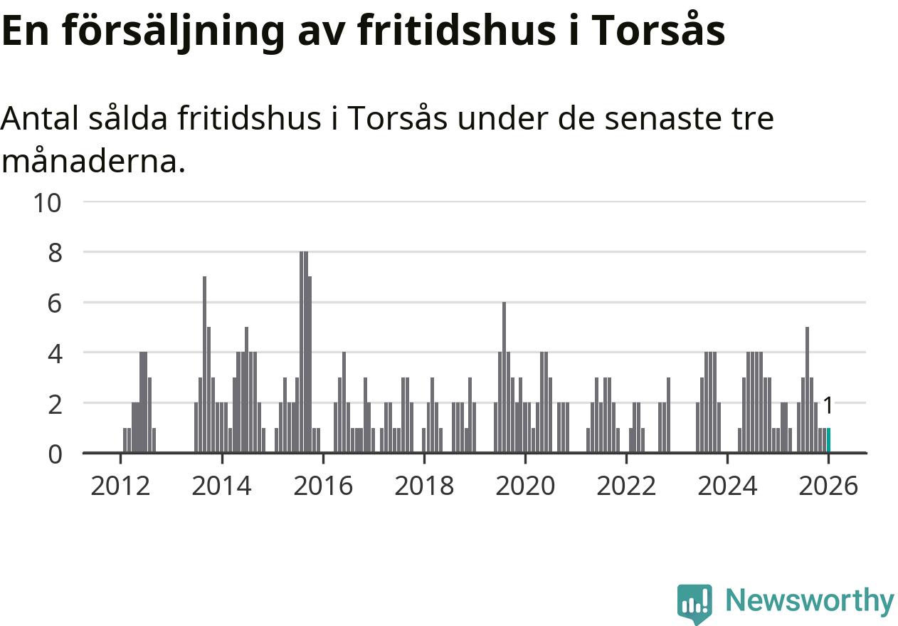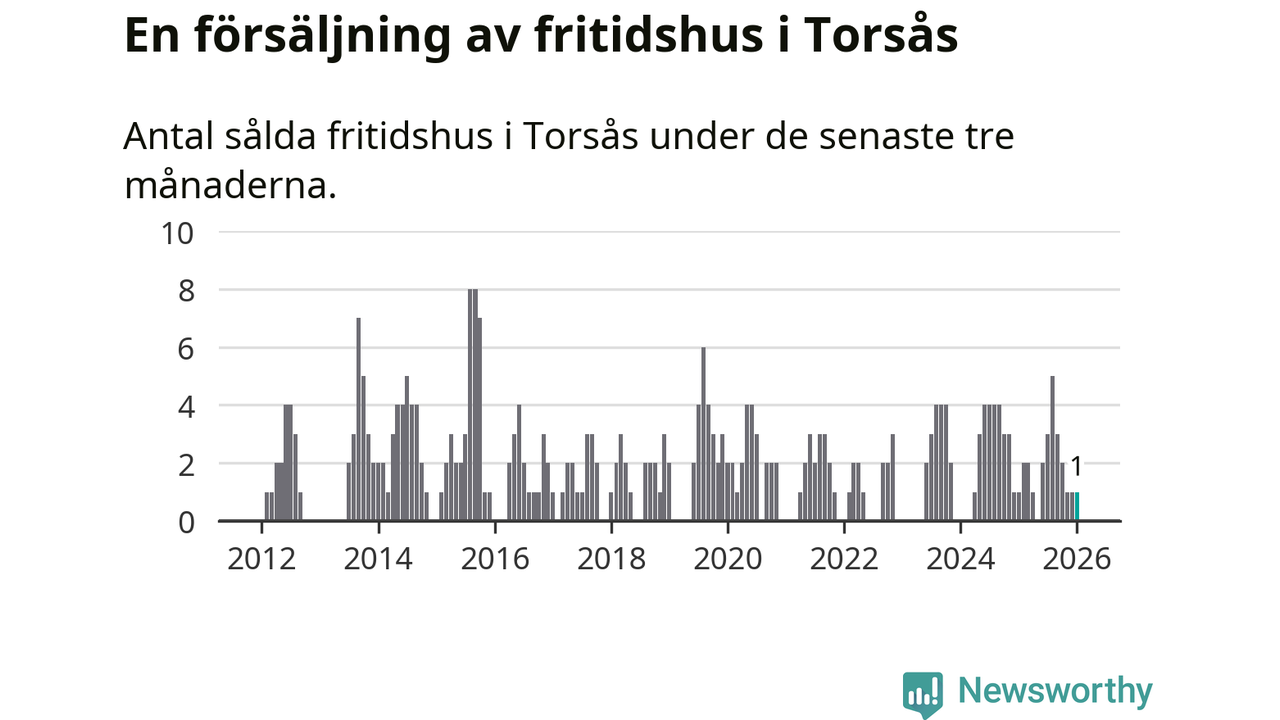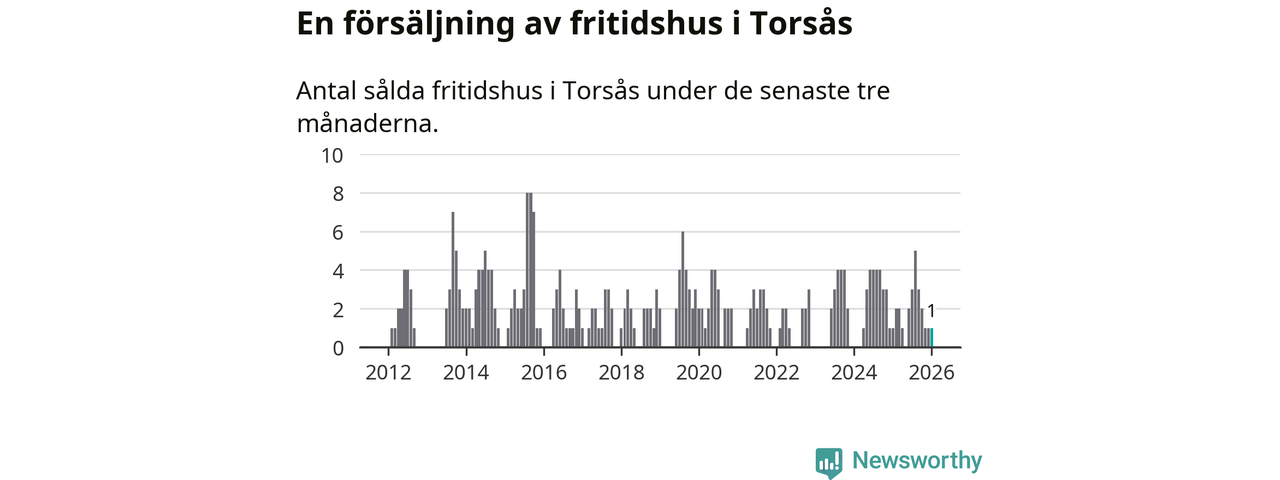 Mellan november och januari gjordes sammanlagt en affär med fritidshus i Torsås kommun. Det är lika många affärer som vid motsvarande tid i fjol.