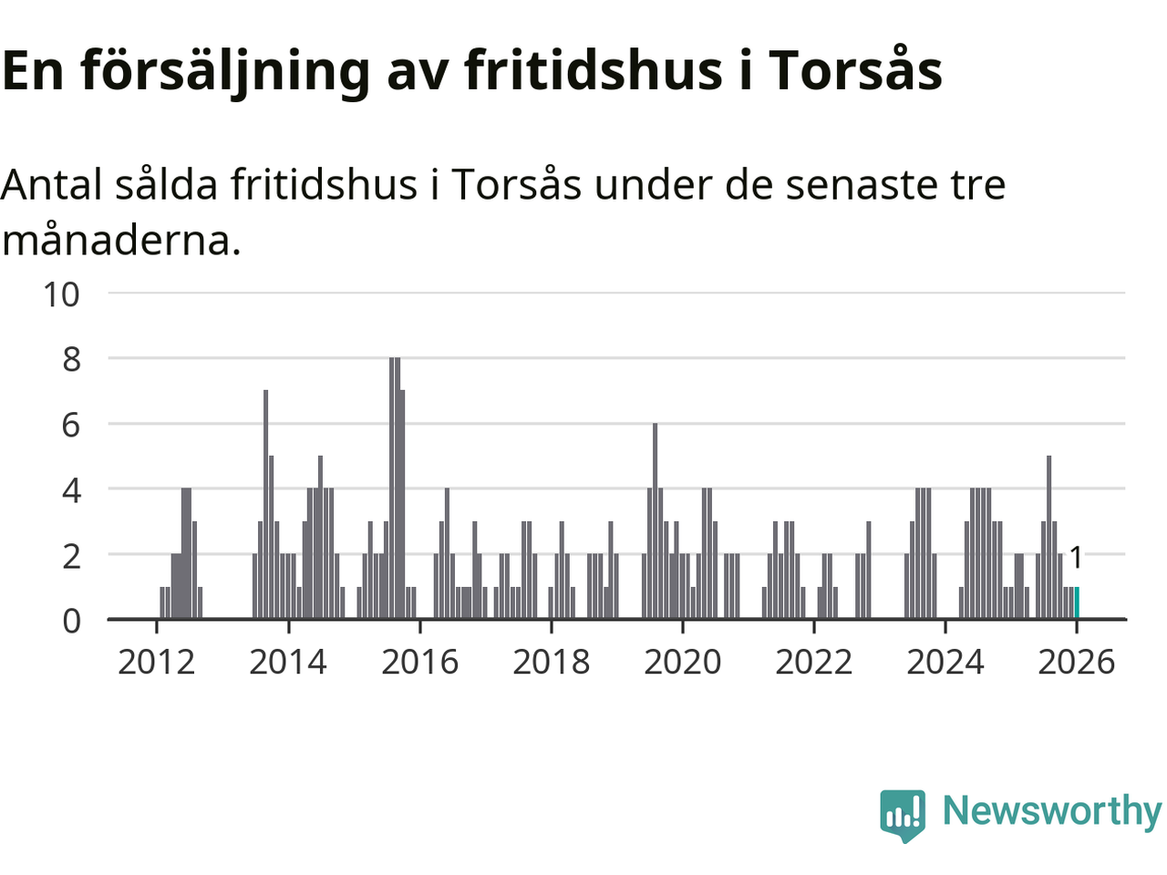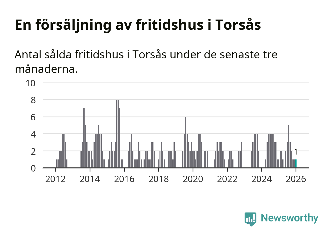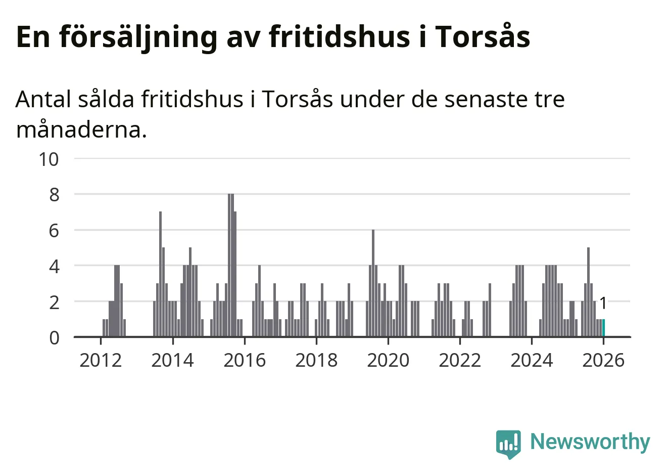 Mellan november och januari gjordes sammanlagt en affär med fritidshus i Torsås kommun. Det är lika många affärer som vid motsvarande tid i fjol.