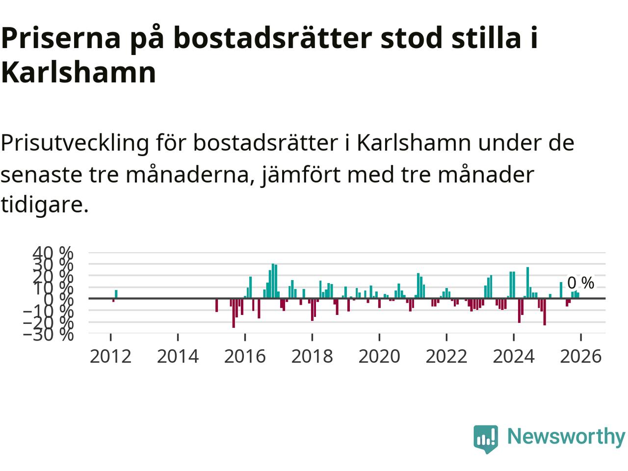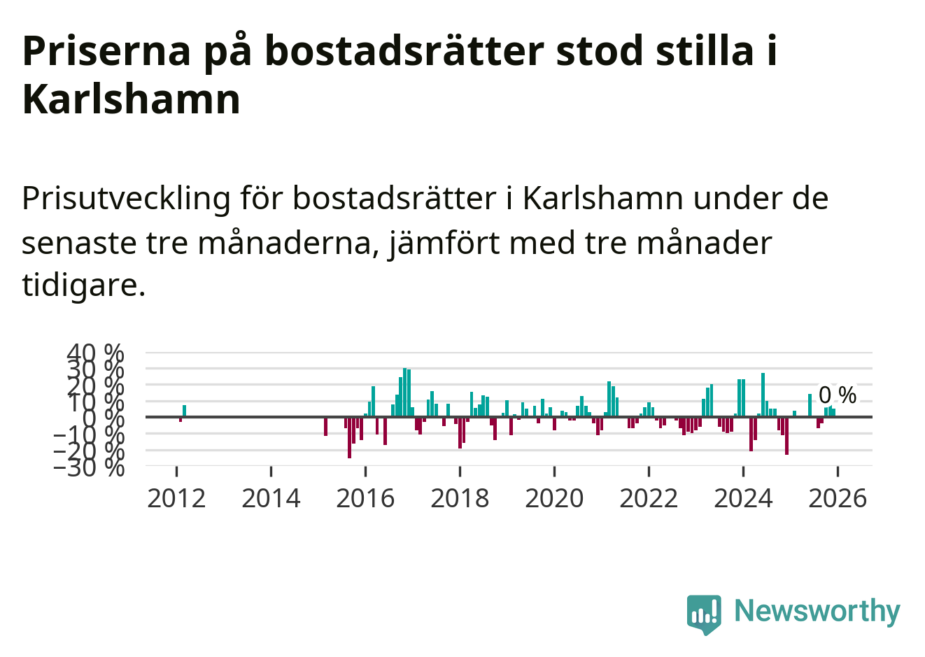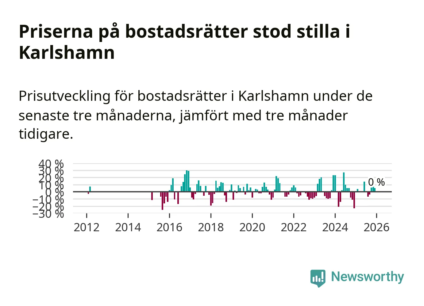 Priserna på bostadsrätter står i stort sett stilla i Karlshamns kommun. Medelpriset på de på försäljningarna under de senaste tre månaderna låg på samma nivå som för tre månader sedan.
