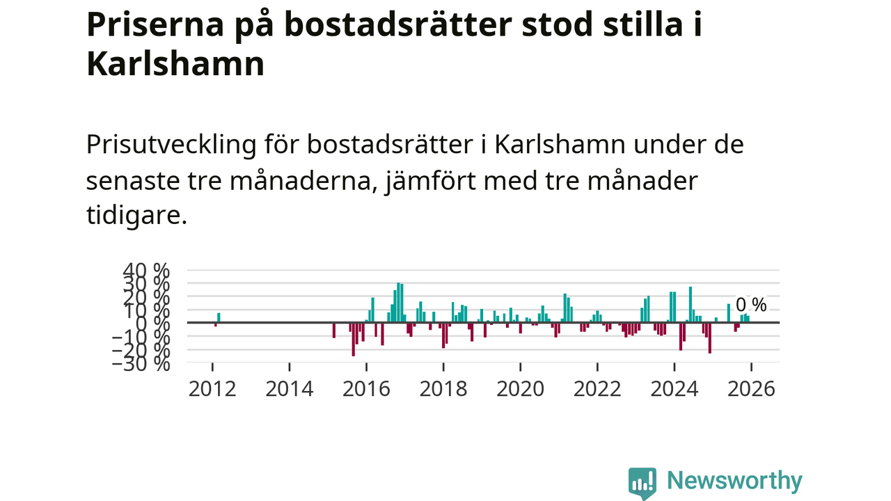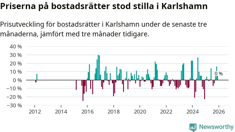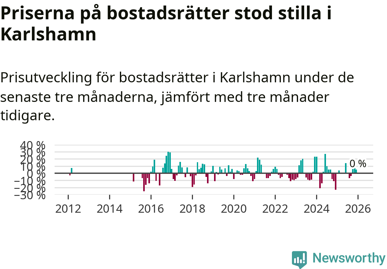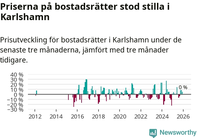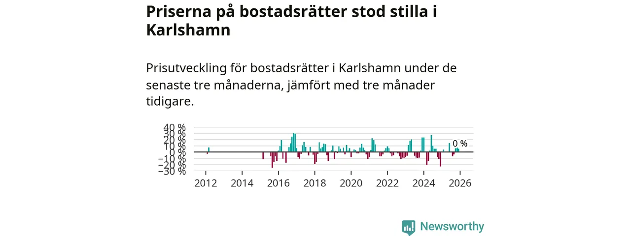 Priserna på bostadsrätter står i stort sett stilla i Karlshamns kommun. Medelpriset på de på försäljningarna under de senaste tre månaderna låg på samma nivå som för tre månader sedan.