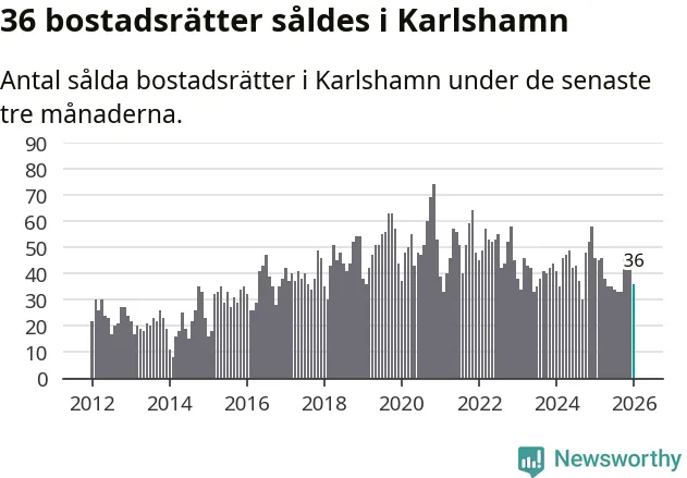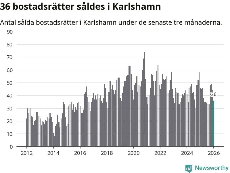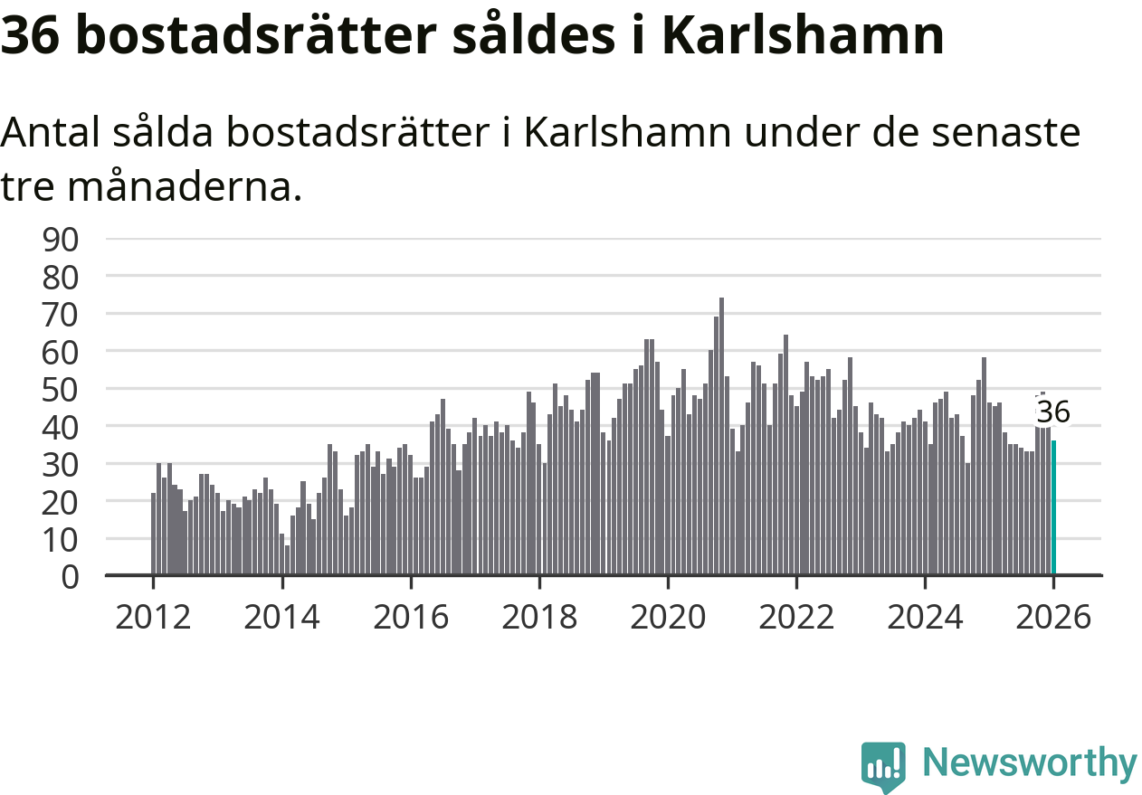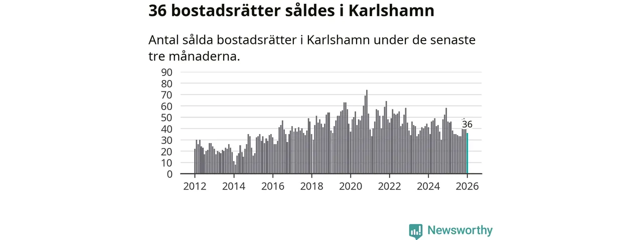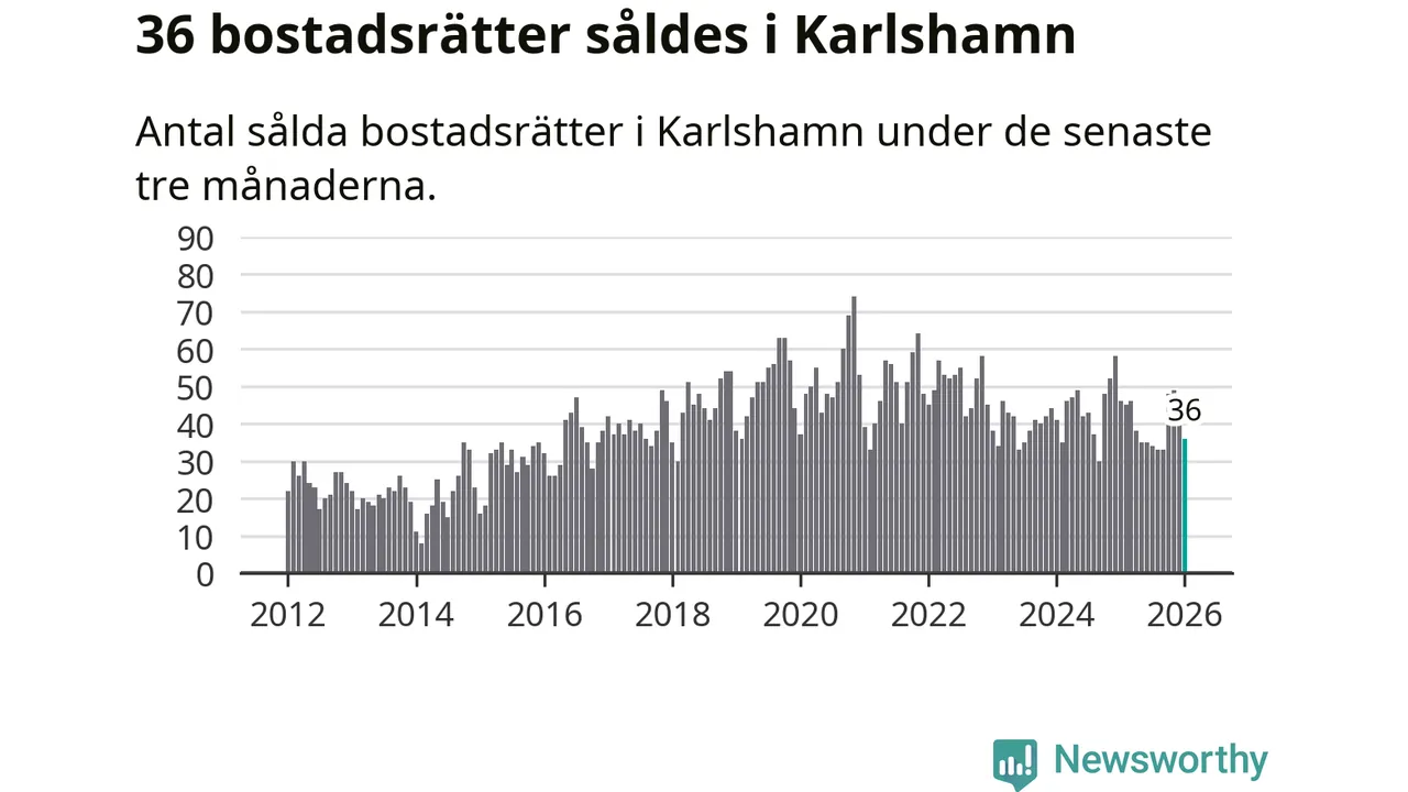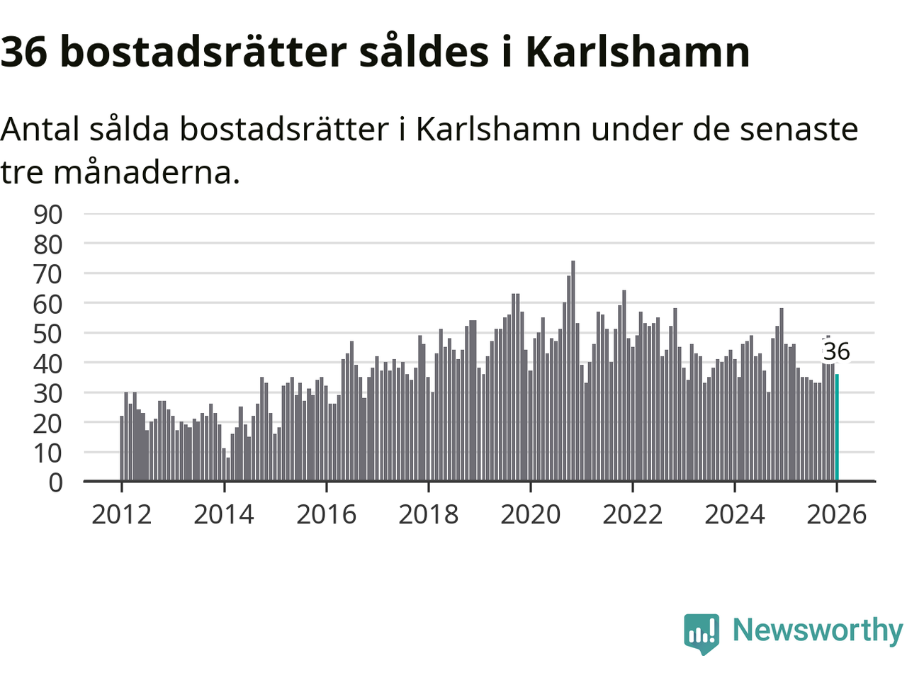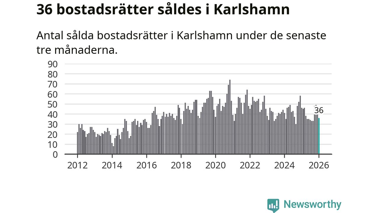 Sammanlagt såldes 36 bostadsrätter i Karlshamns kommun mellan november och januari till ett genomsnittligt pris på 1,1 miljoner kronor. I fjol gjordes 46 affärer vid den här tiden på året.